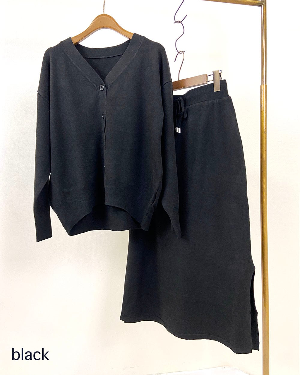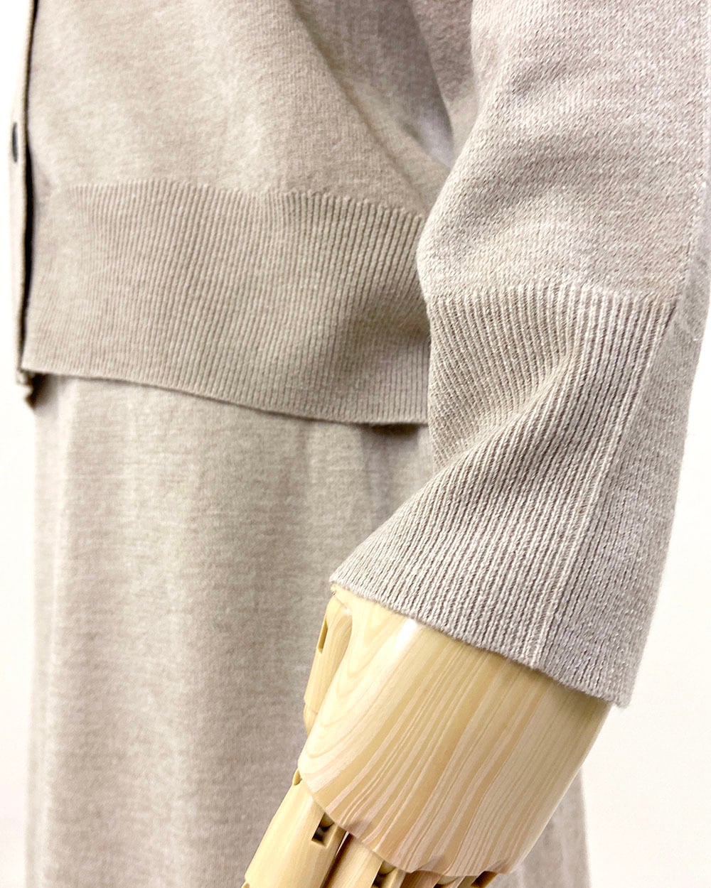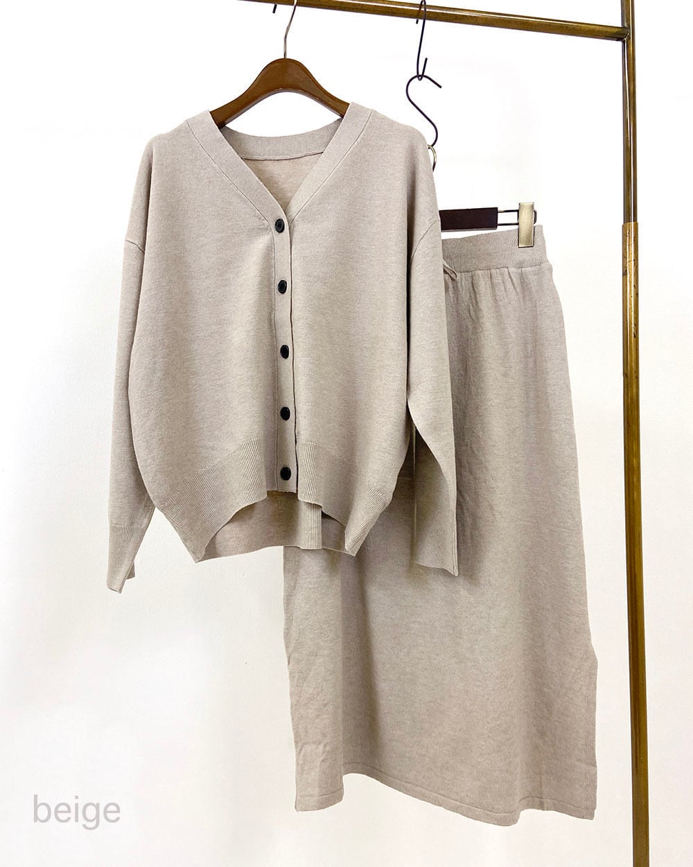 ネックのニットカーディガンとニットスカートのセットアップ。