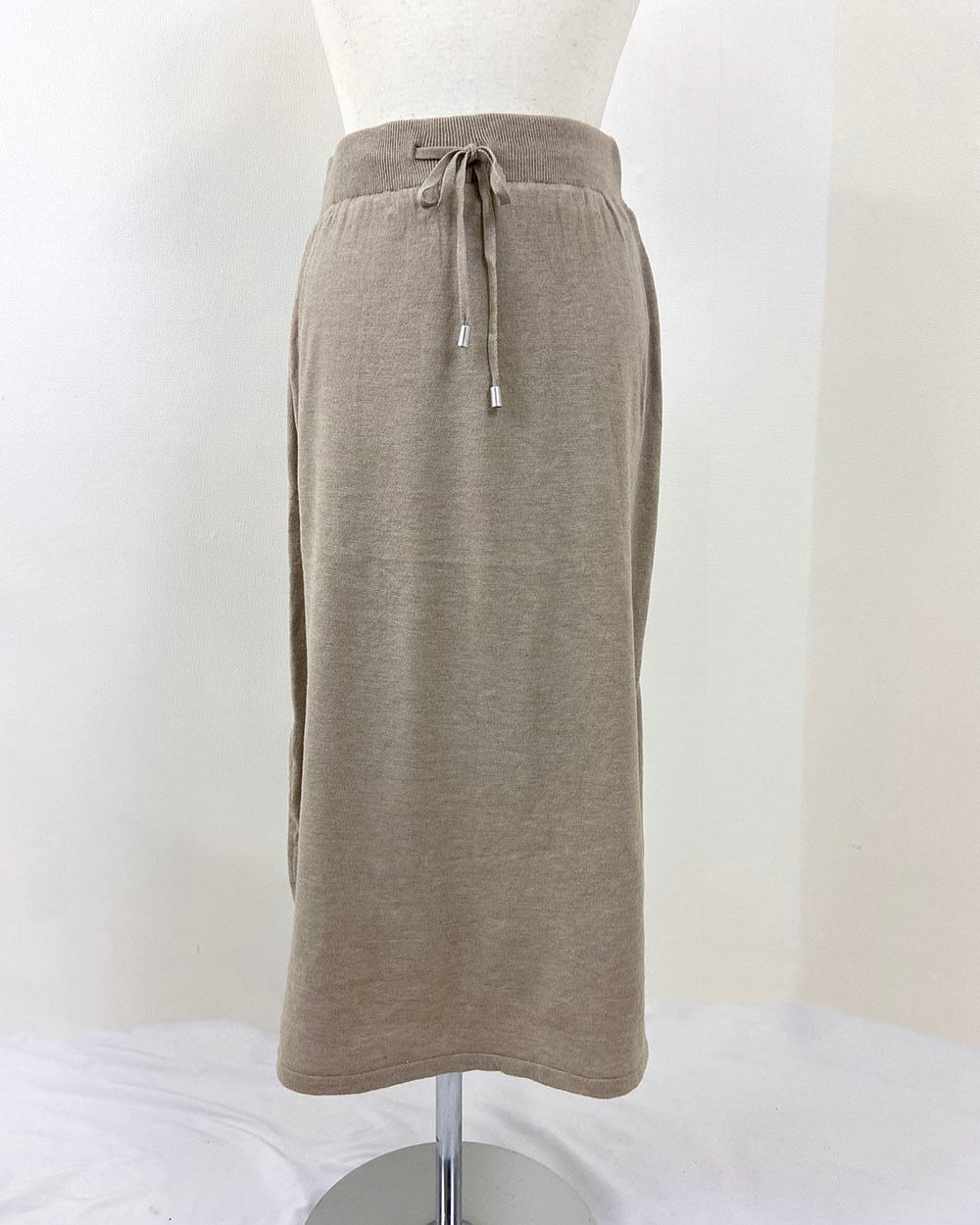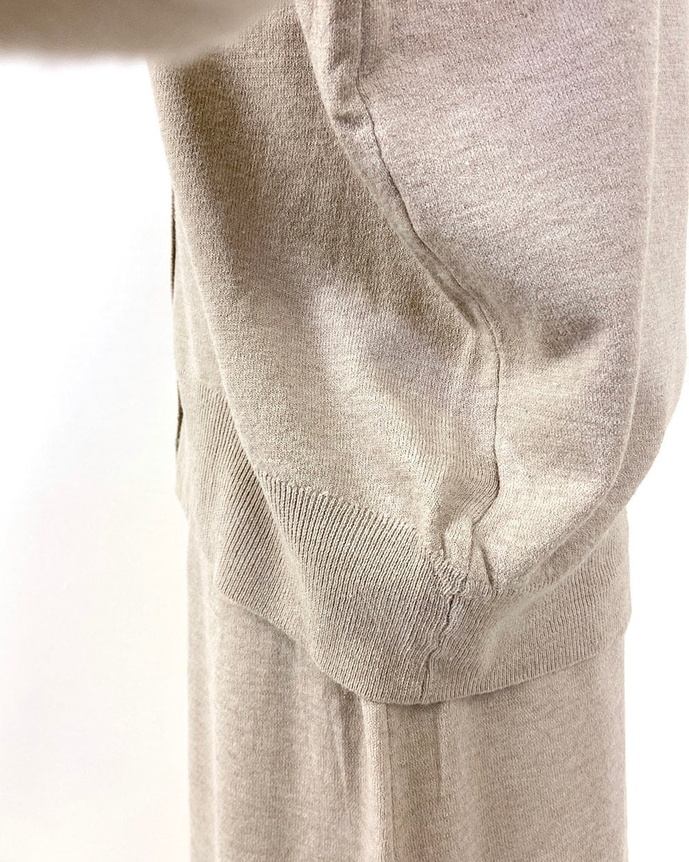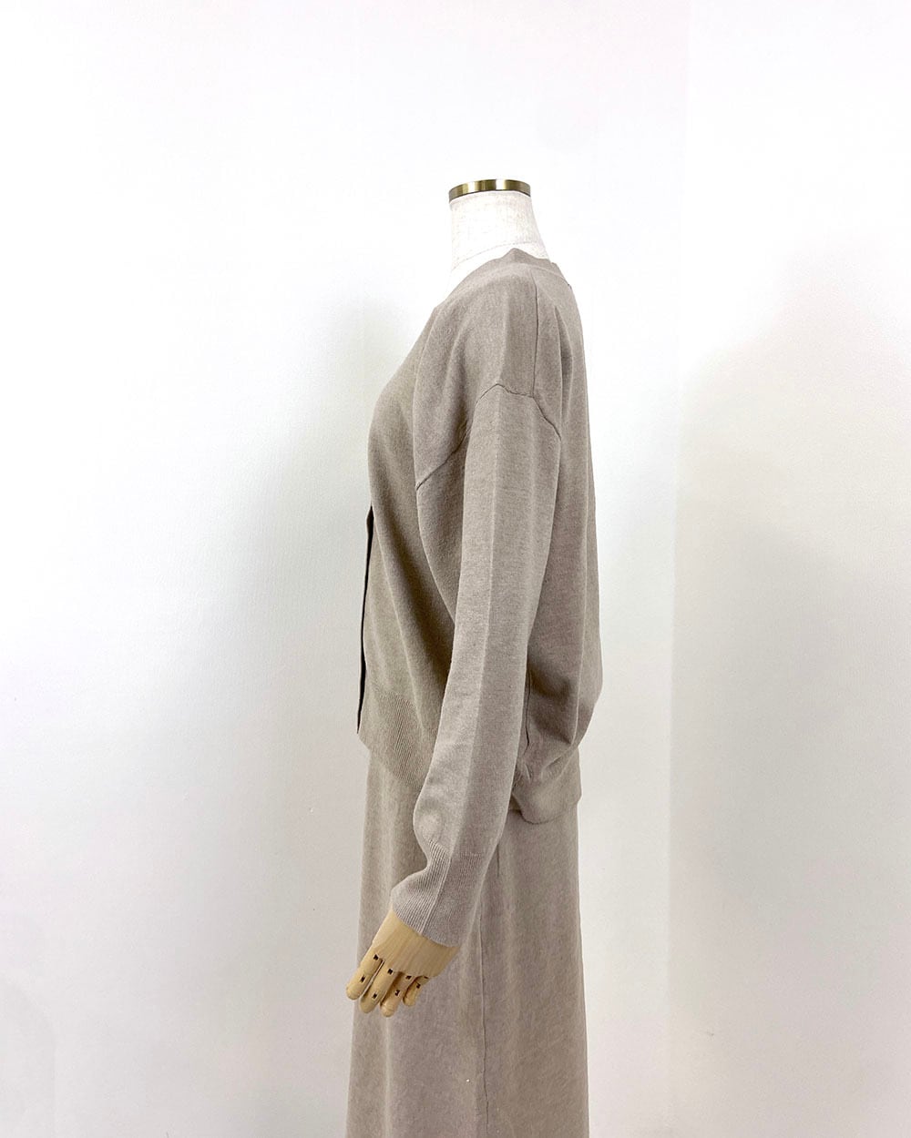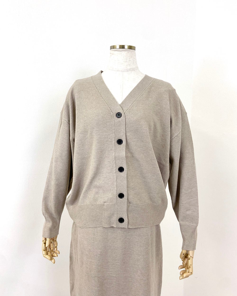 ネックのニットカーディガンとニットスカートのセットアップ。