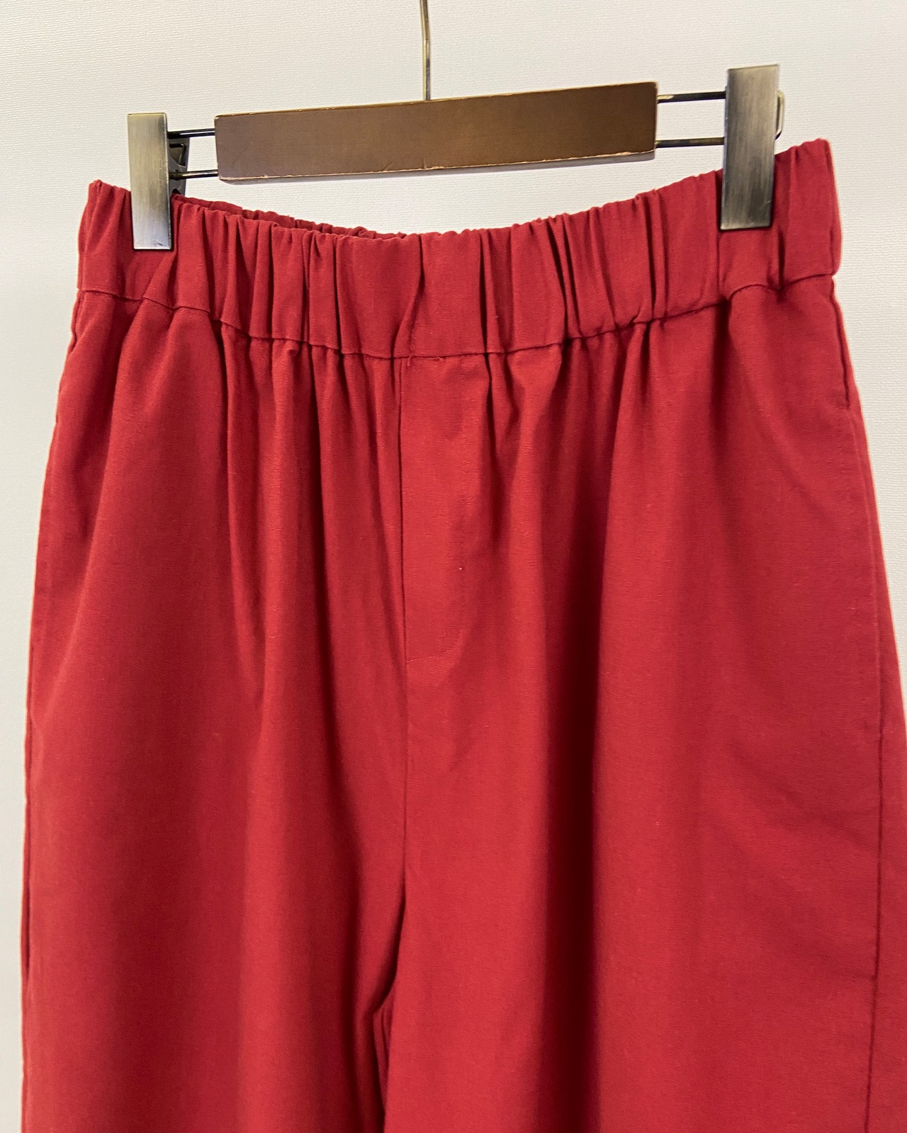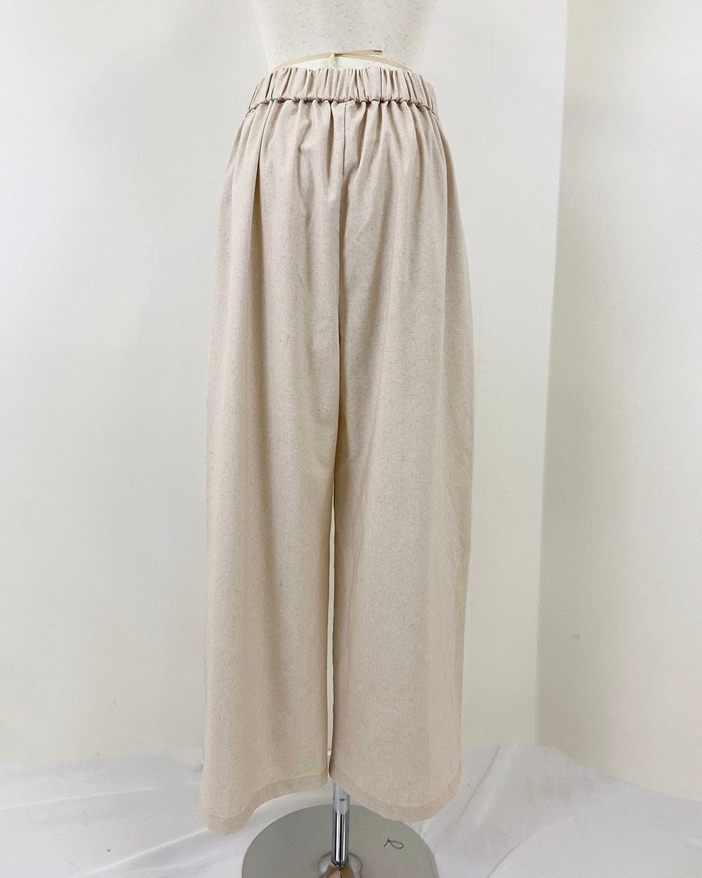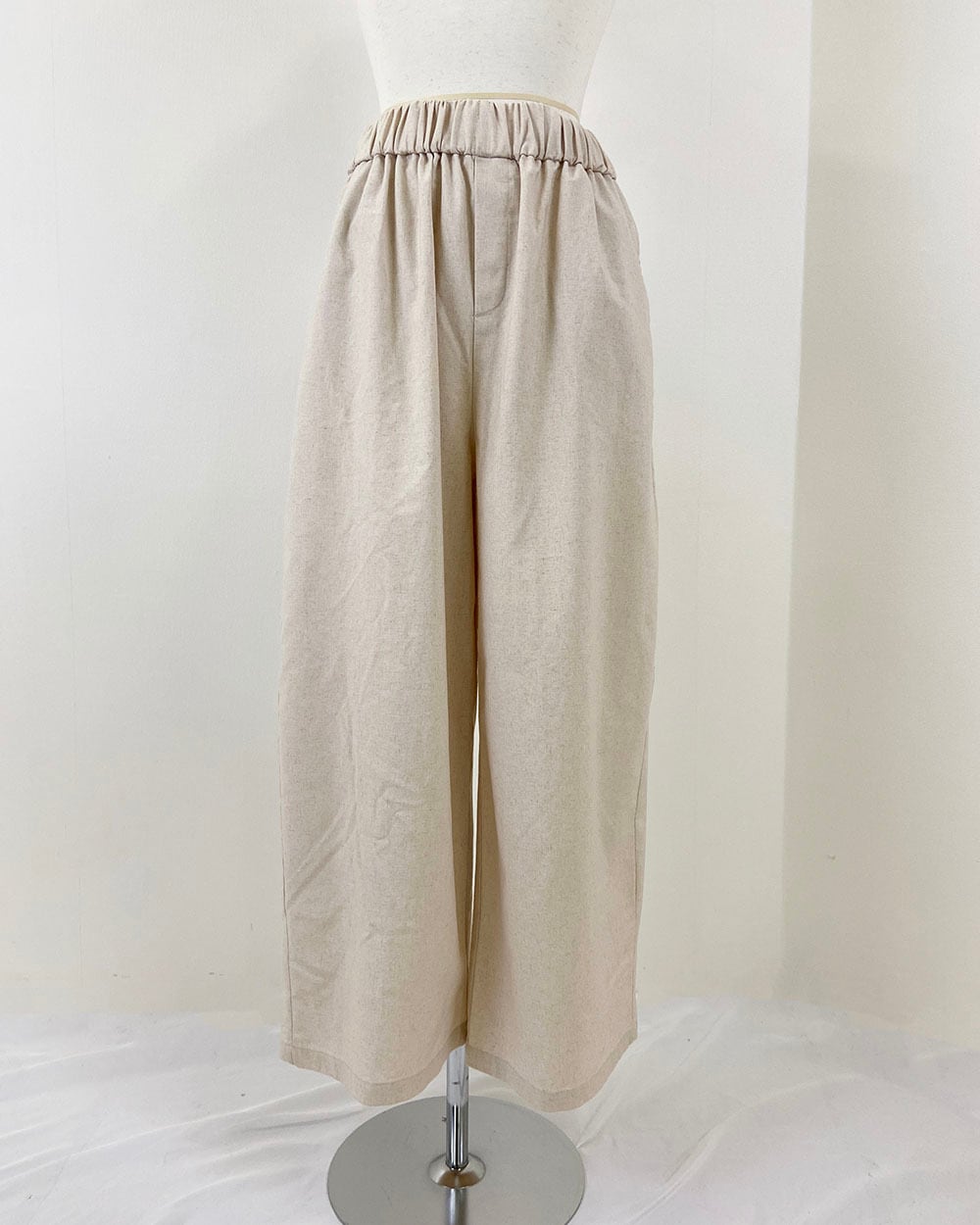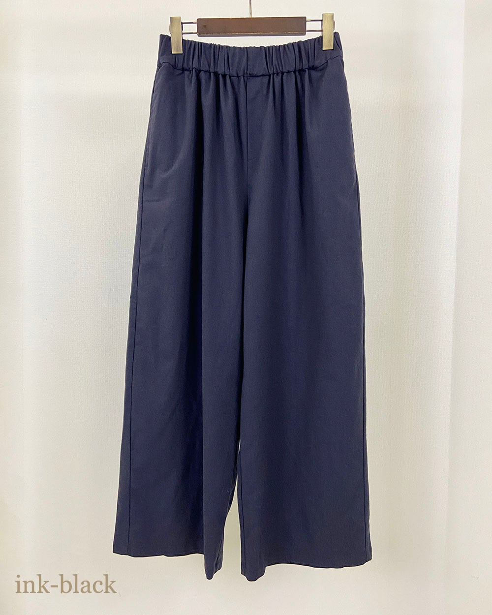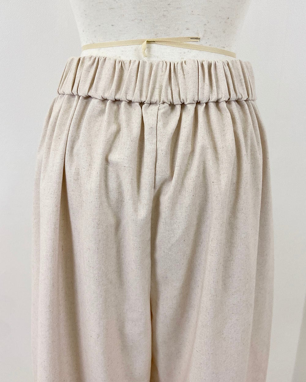 太めのウエストゴムがポイントのギャザーボリュームパンツ。