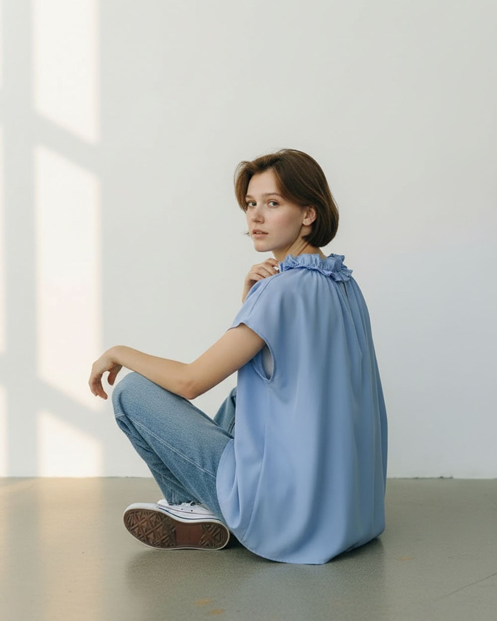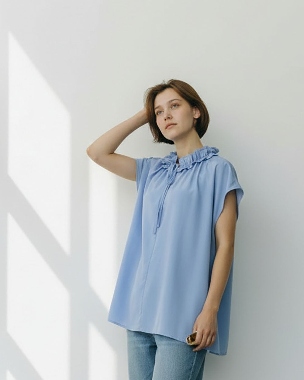 フリルキーネックがポイントのブラウス。