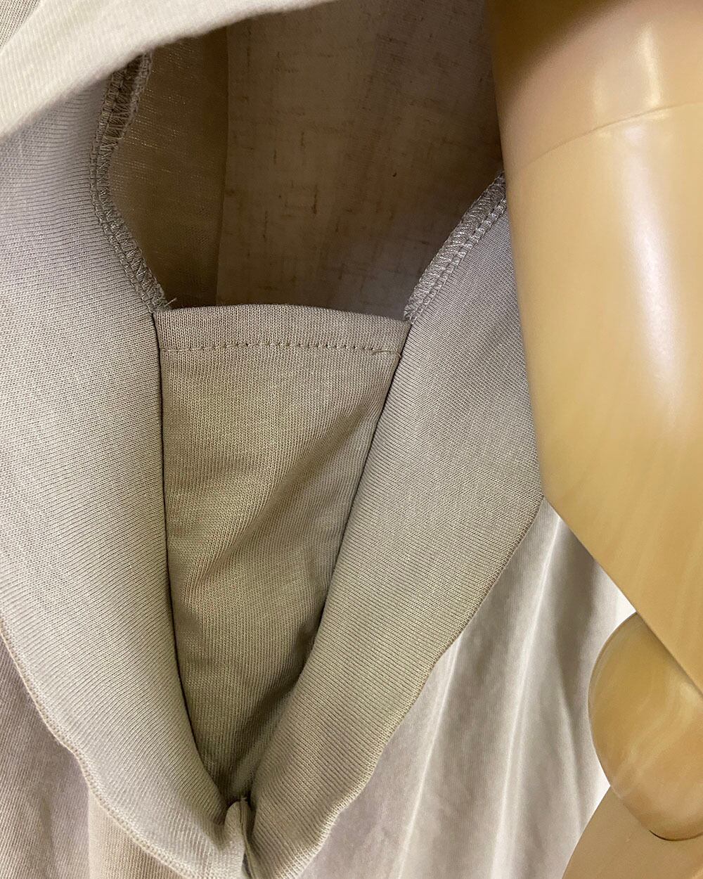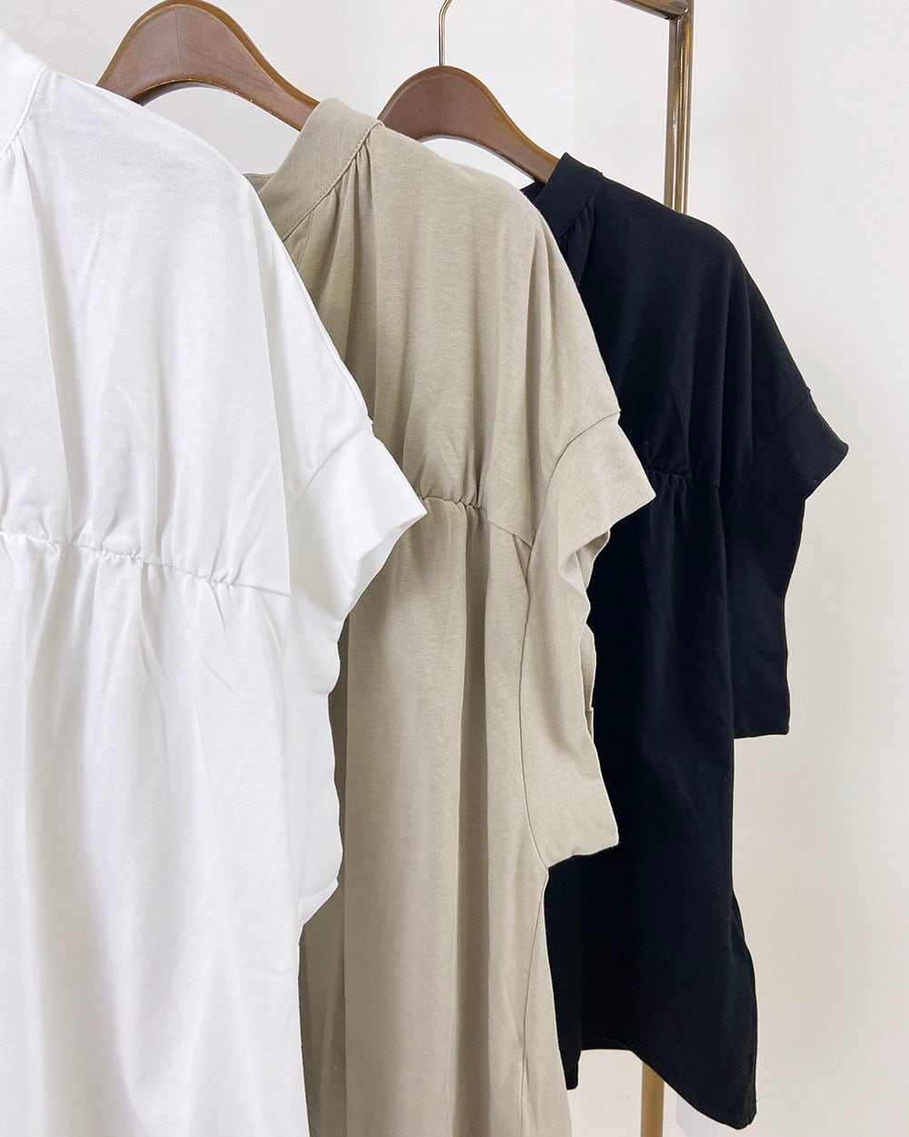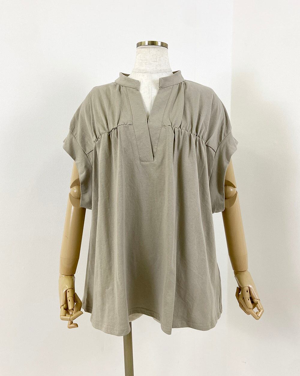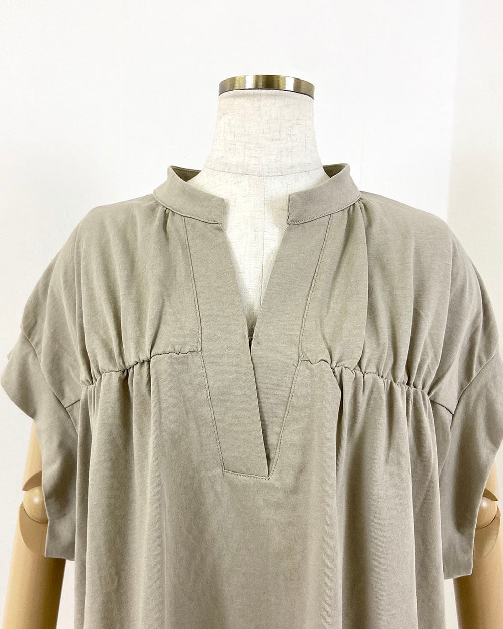 胸元、バックにあるギャザーが少し大人フェミニンに。