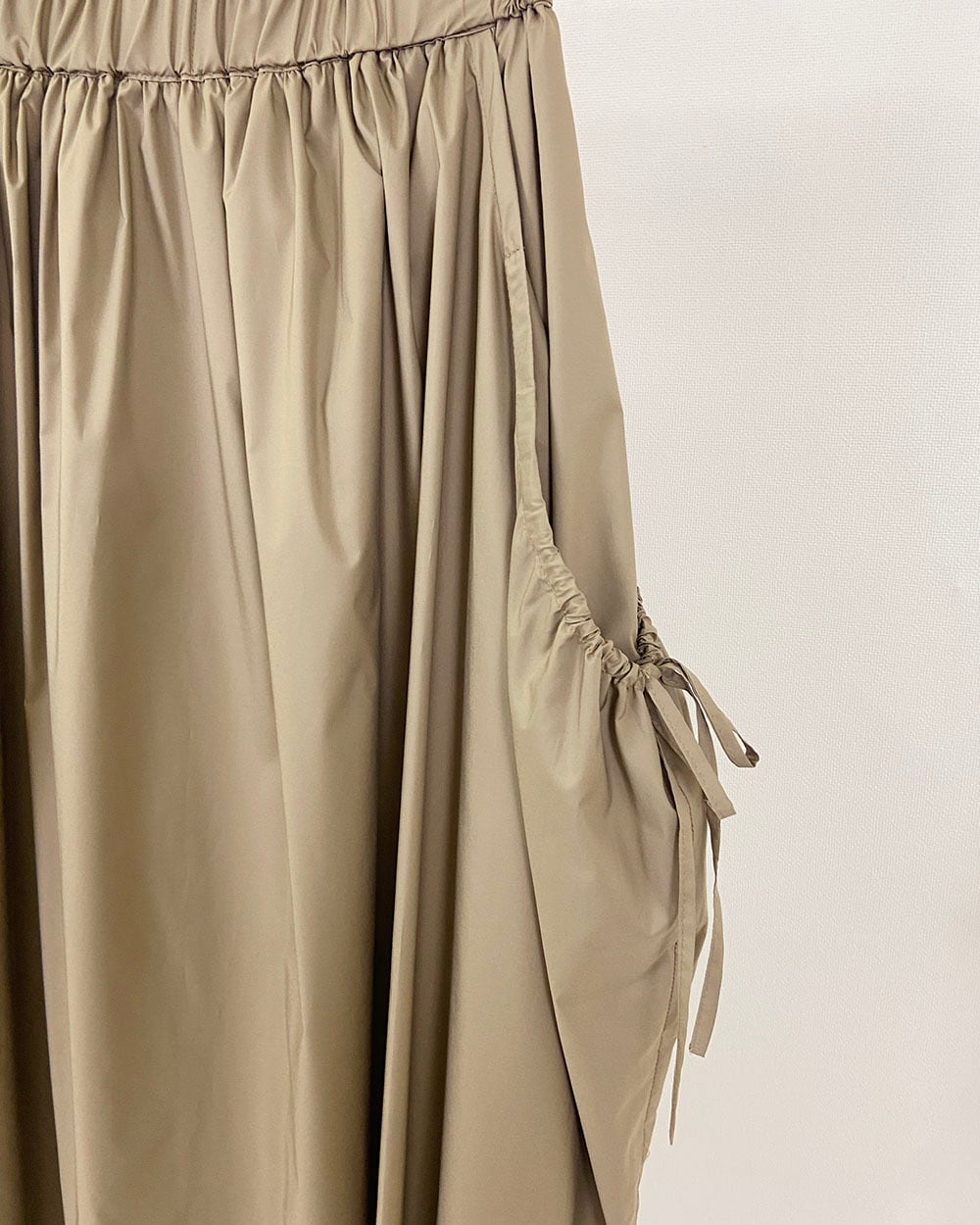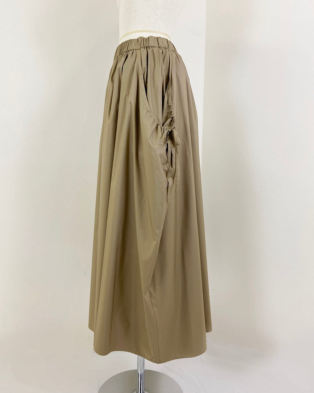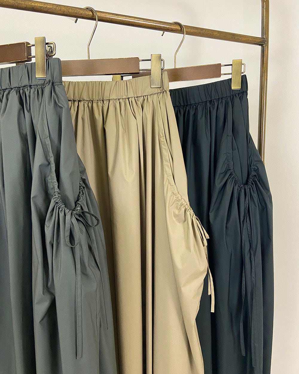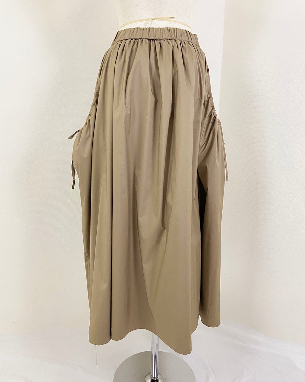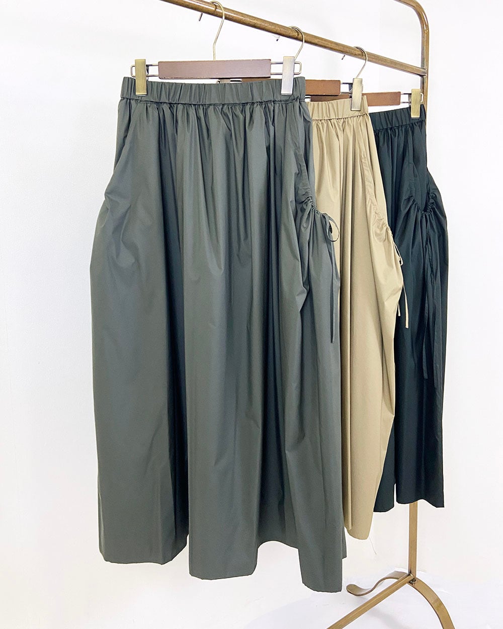サイドのドロストポケットのボリューム感がかわいいタックスカート。