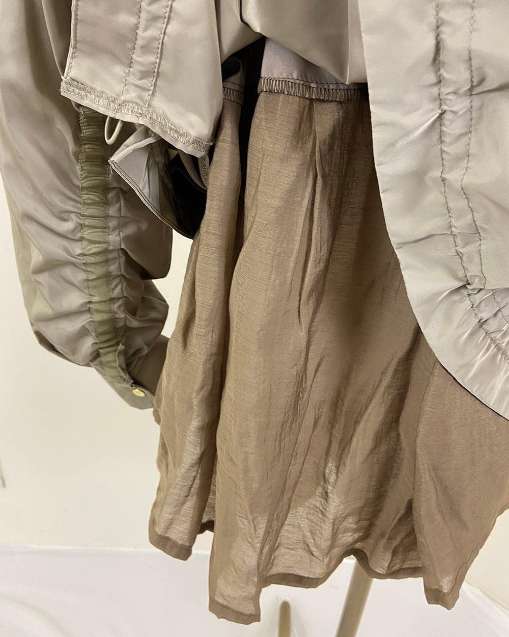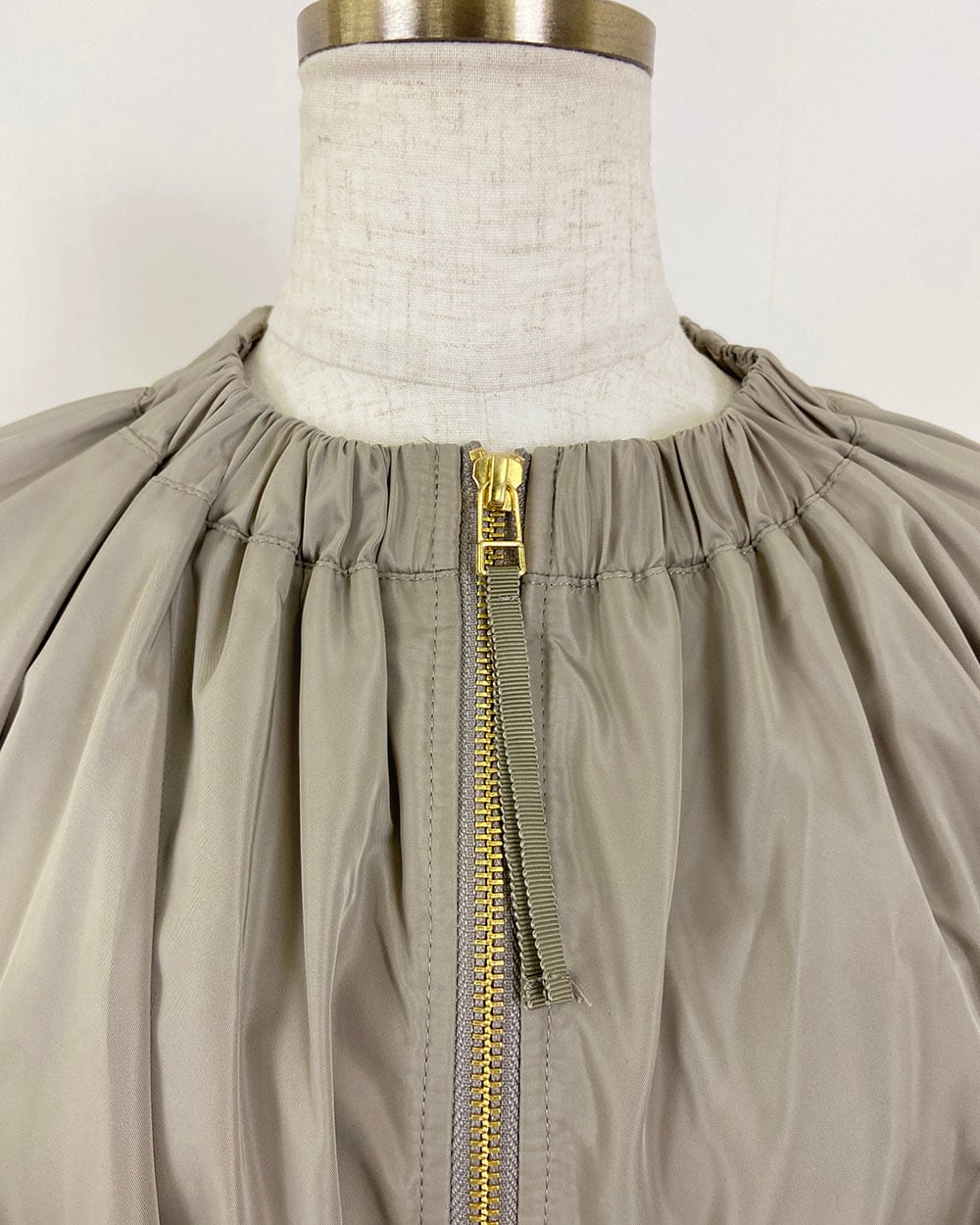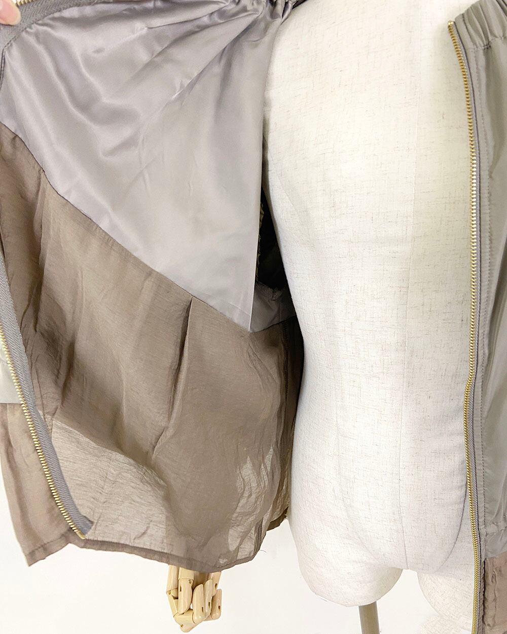 後ヨークとお袖の後、ファスナー先のグログランテープがアクセントに。