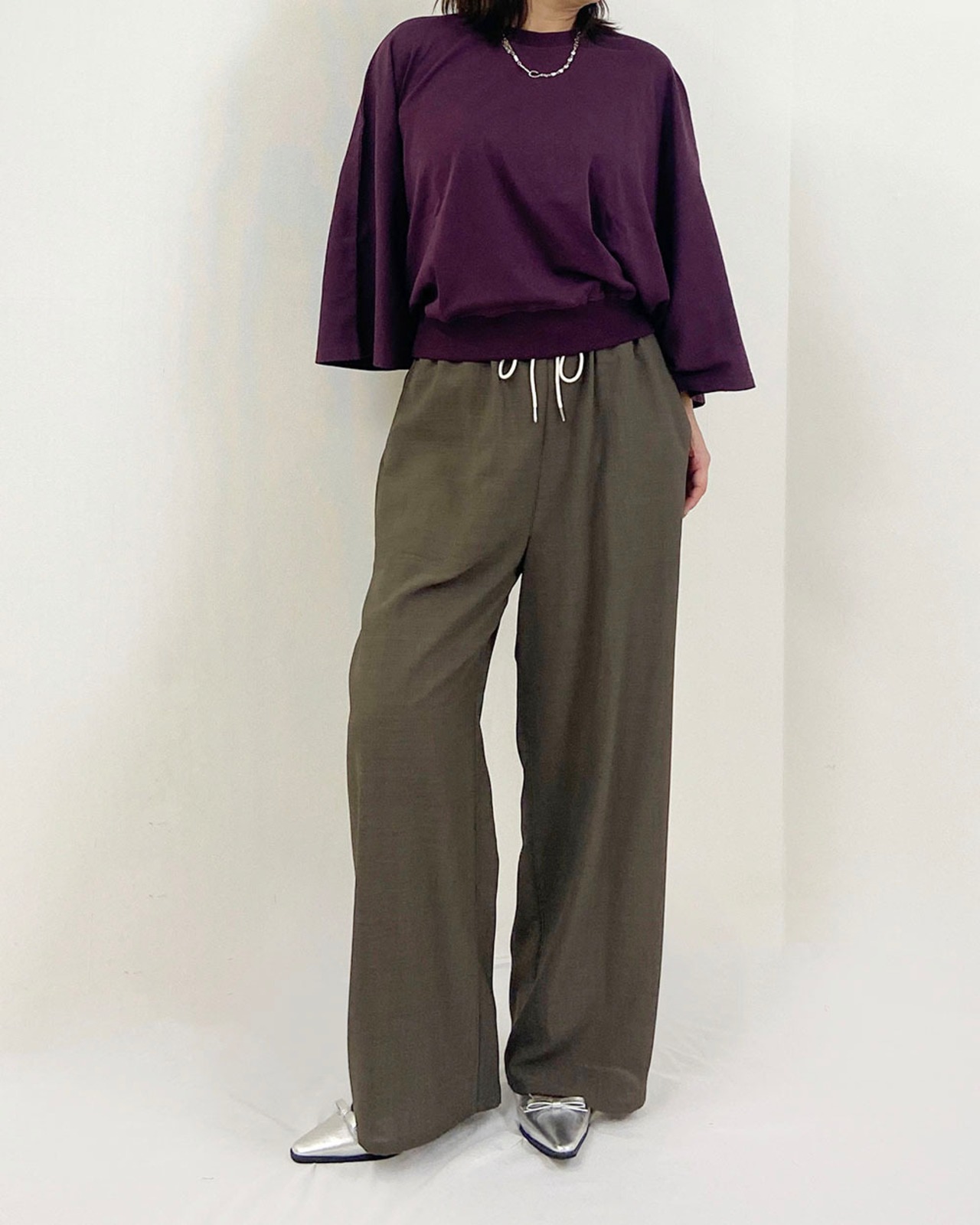 ワイドめストレートシルエットのリラックスしてはけるパンツですが、キレイめ生地なのでパジャマ見えしない印象です。