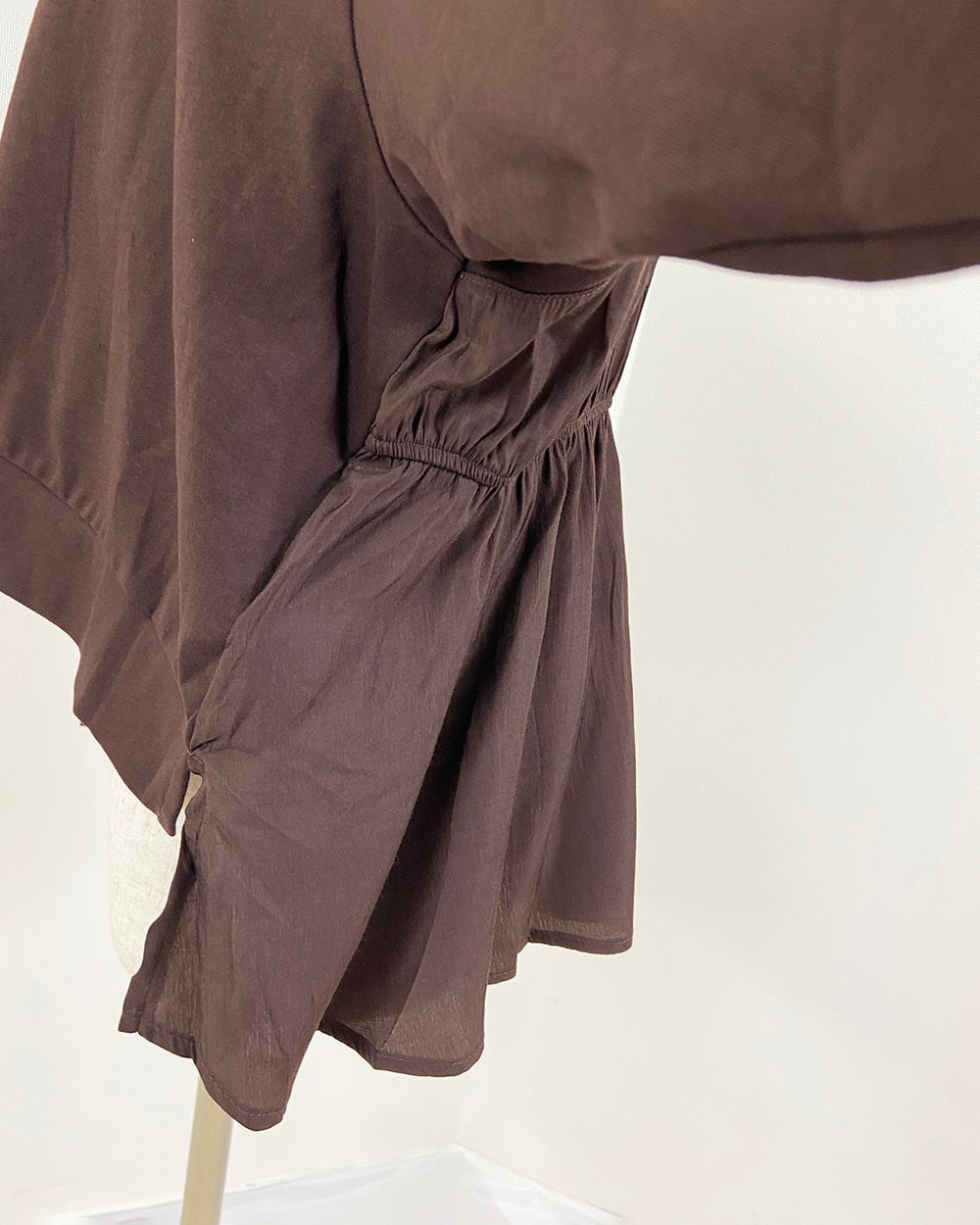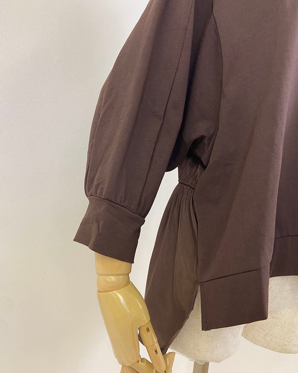 ゆったりとしたドルマン袖と、バックのゴムギャザーが立体的なシルエットを作ります。