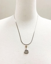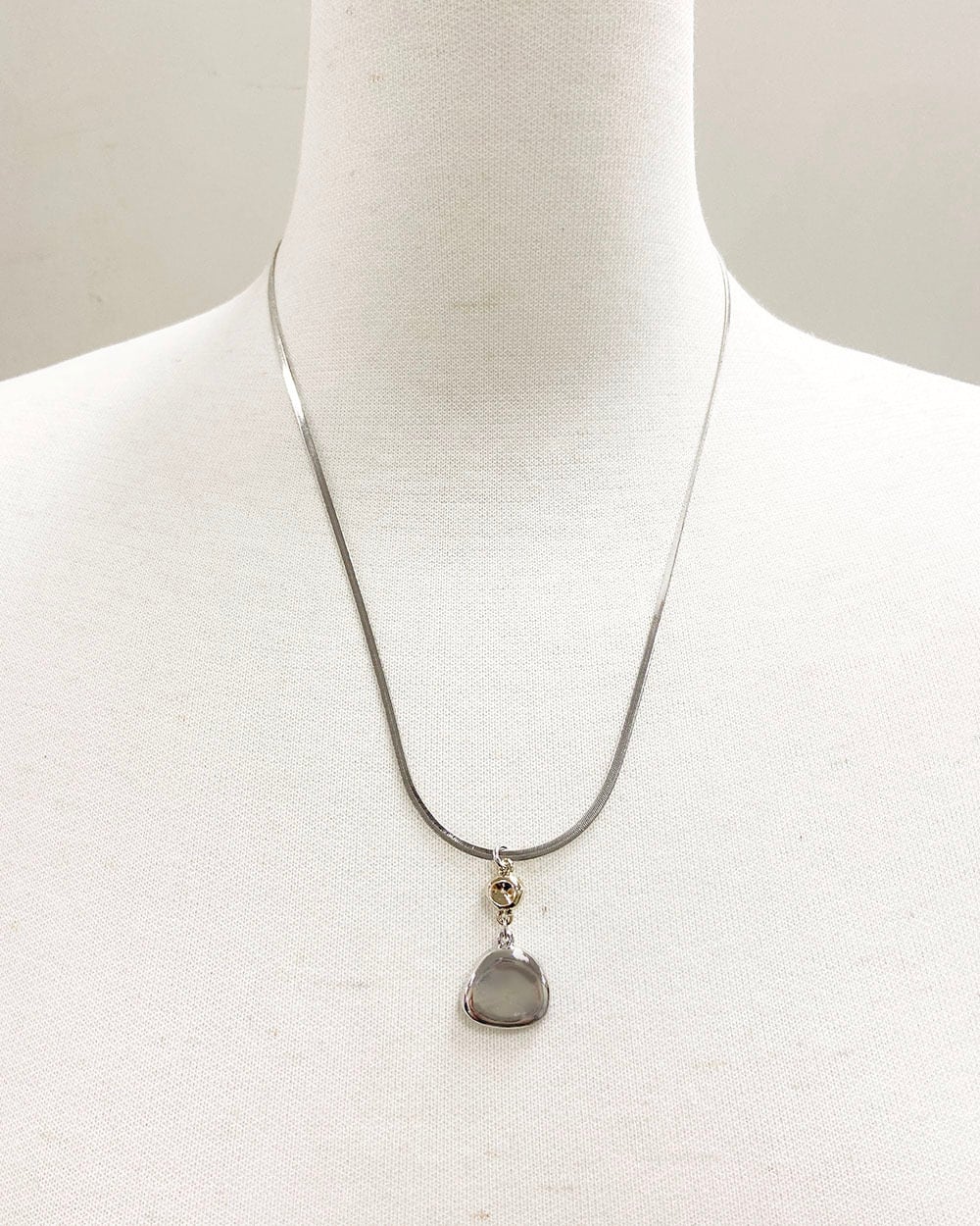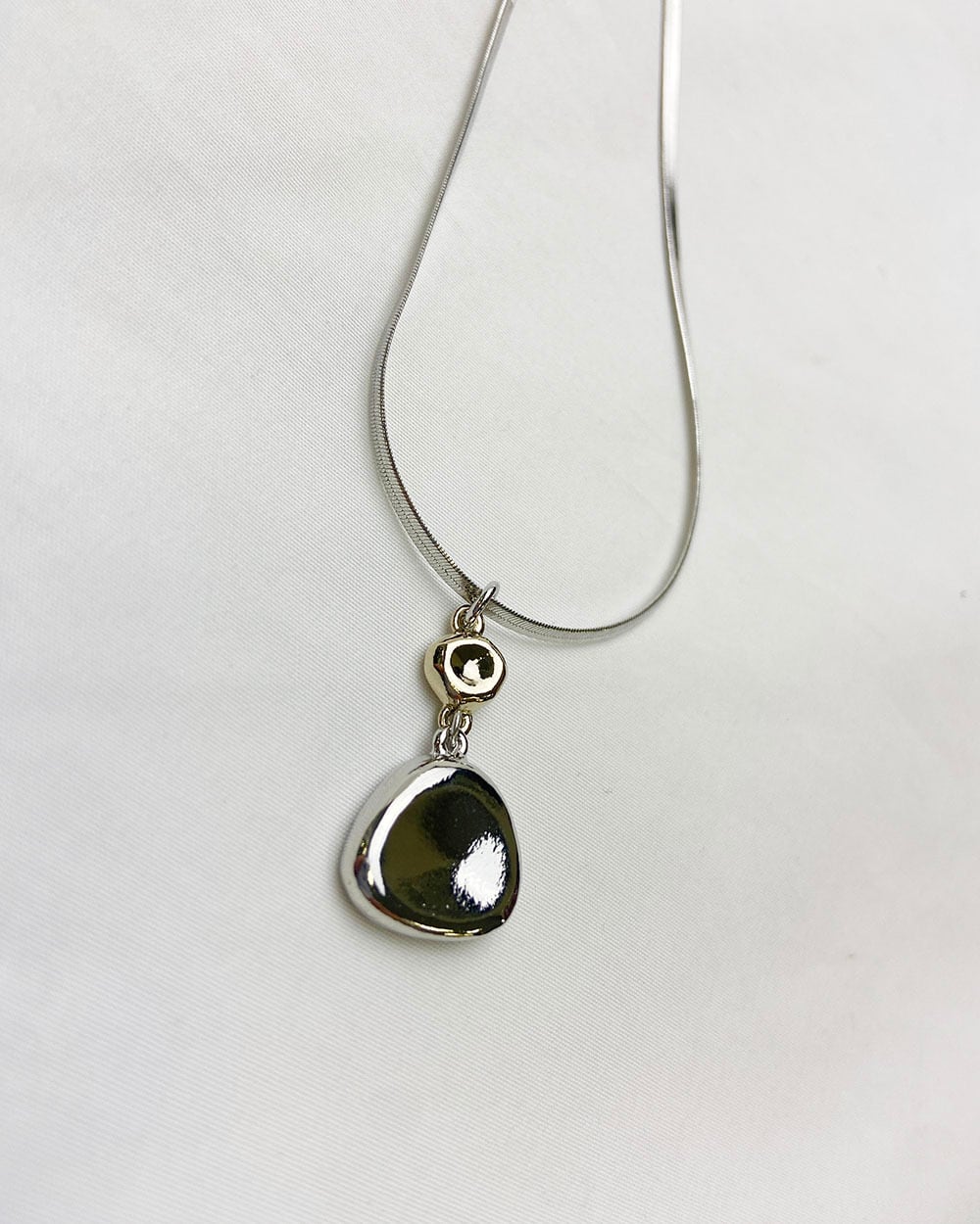ゴールドとシルバーのバイカラーのペンダントトップがポイントのネックレス。