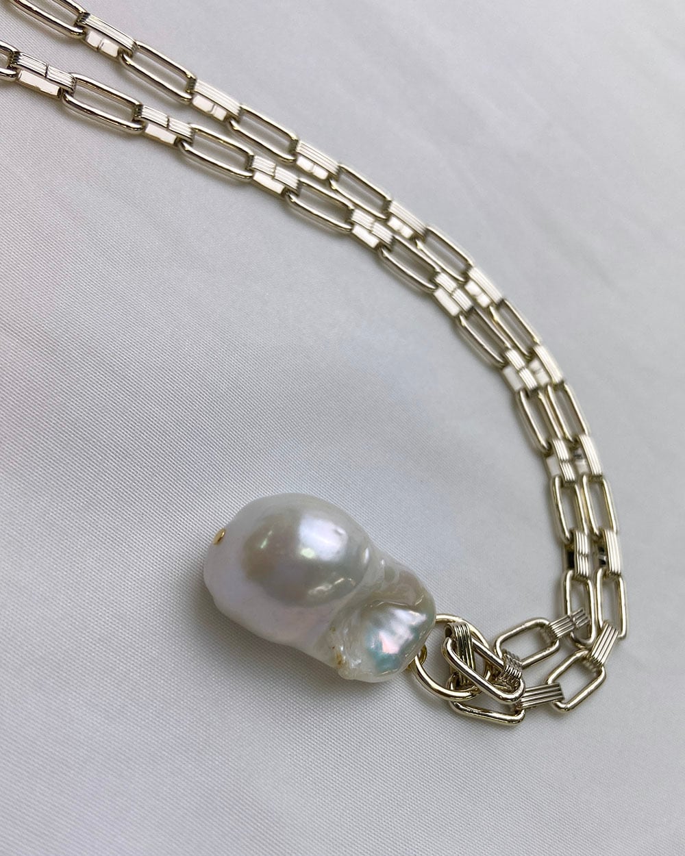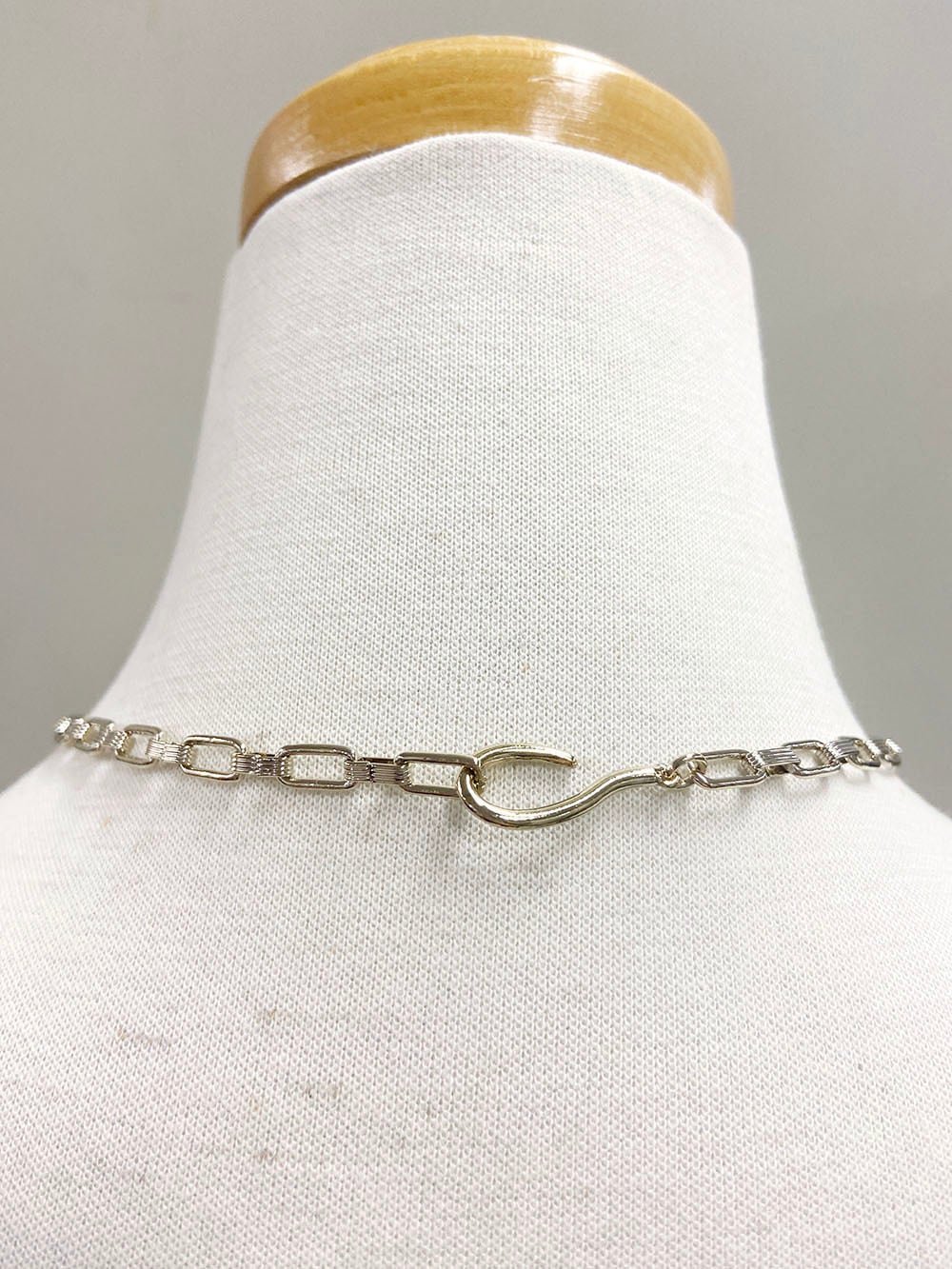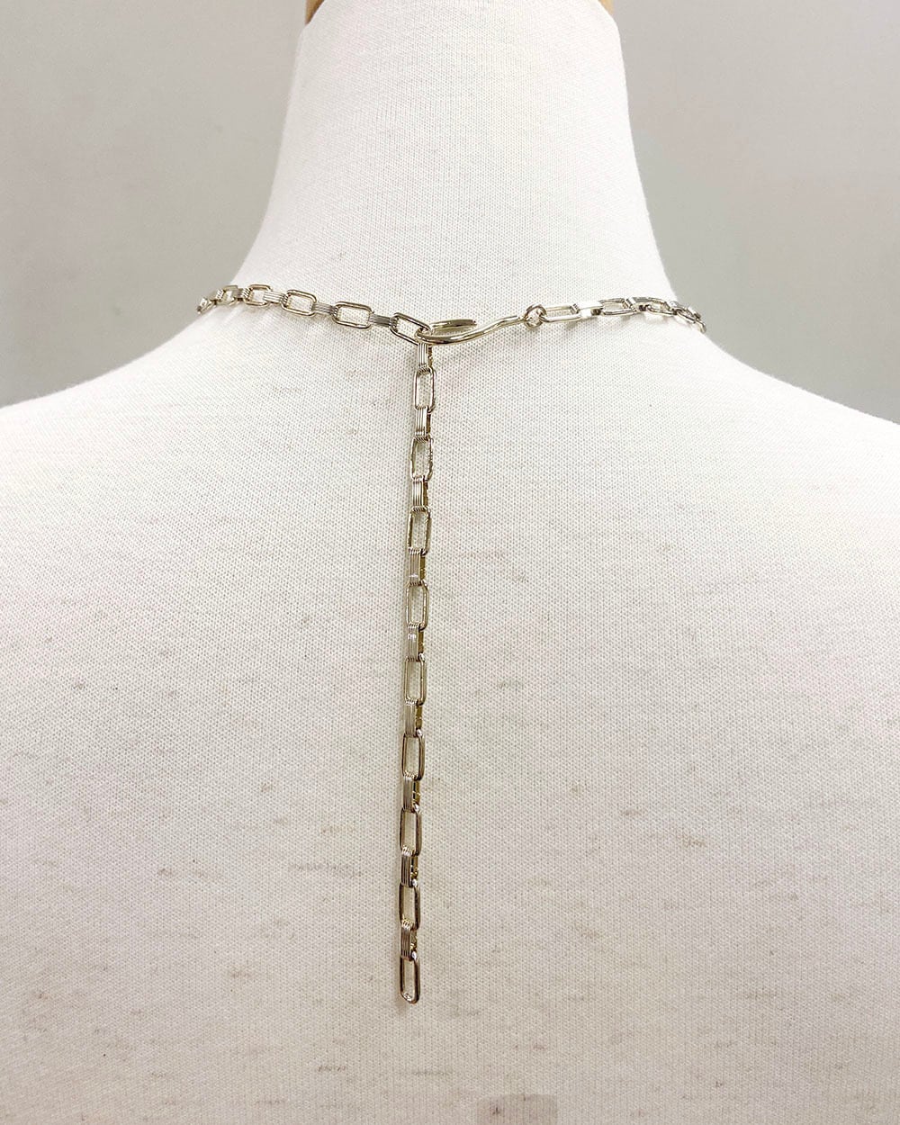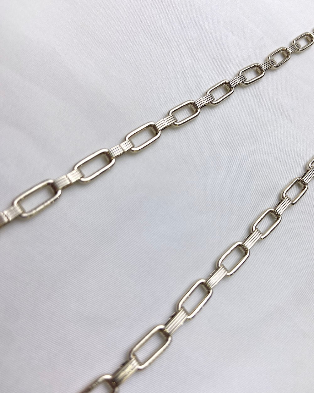 存在感のあるスクエアチェーンがモードでスタイリッシュな雰囲気に。