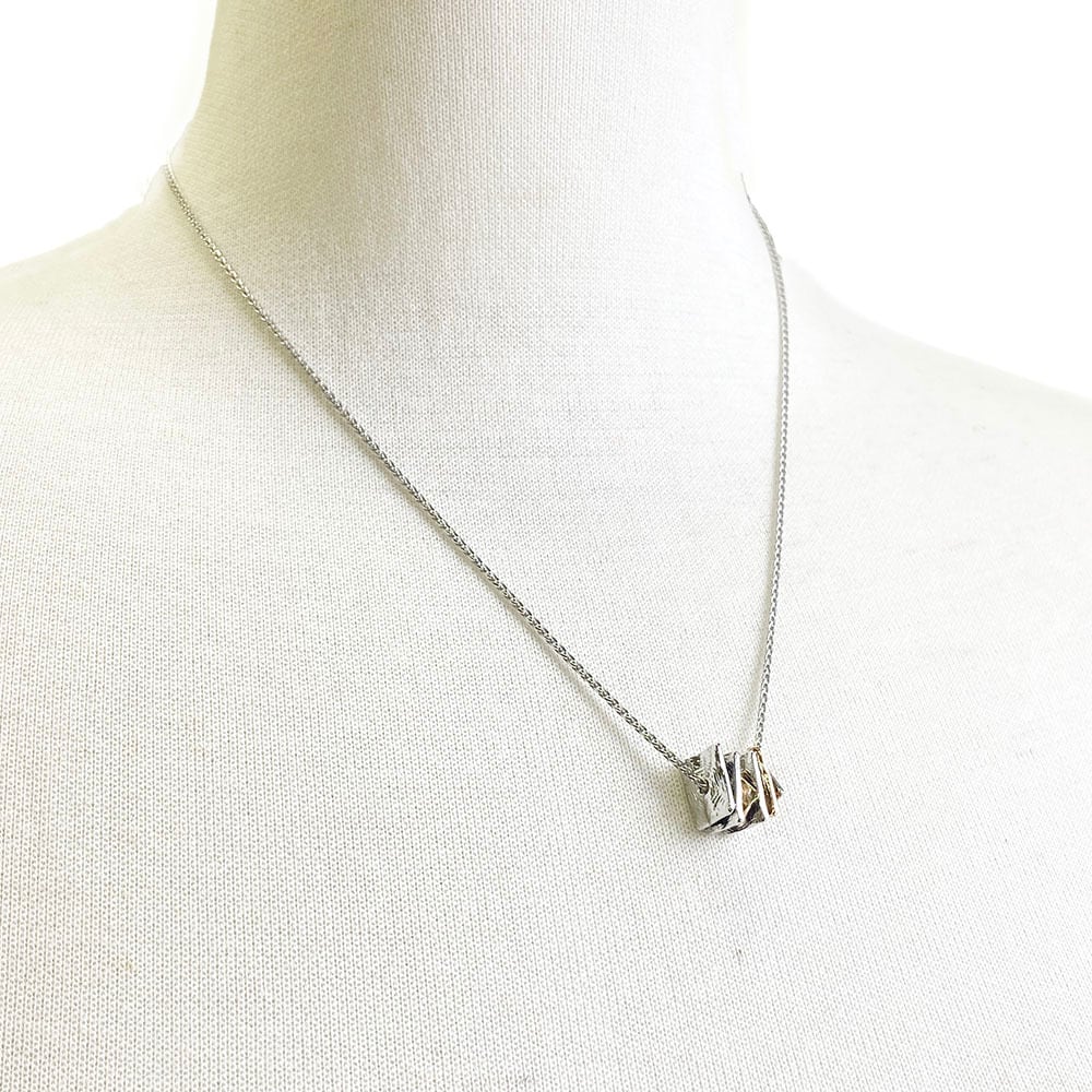 ゴールドとシルバーの金属パーツをチェーンに通してレイヤードしたデザイン。