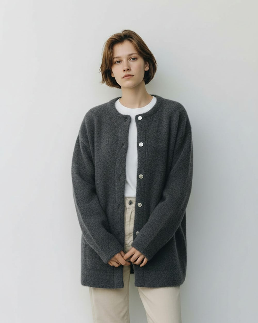 肌触りの良いふわふわのフェレットタッチを使用した上品なニットカーディガン。