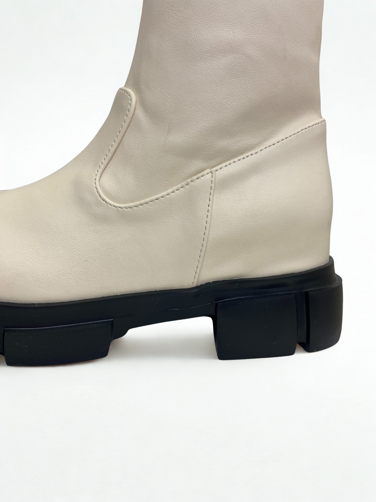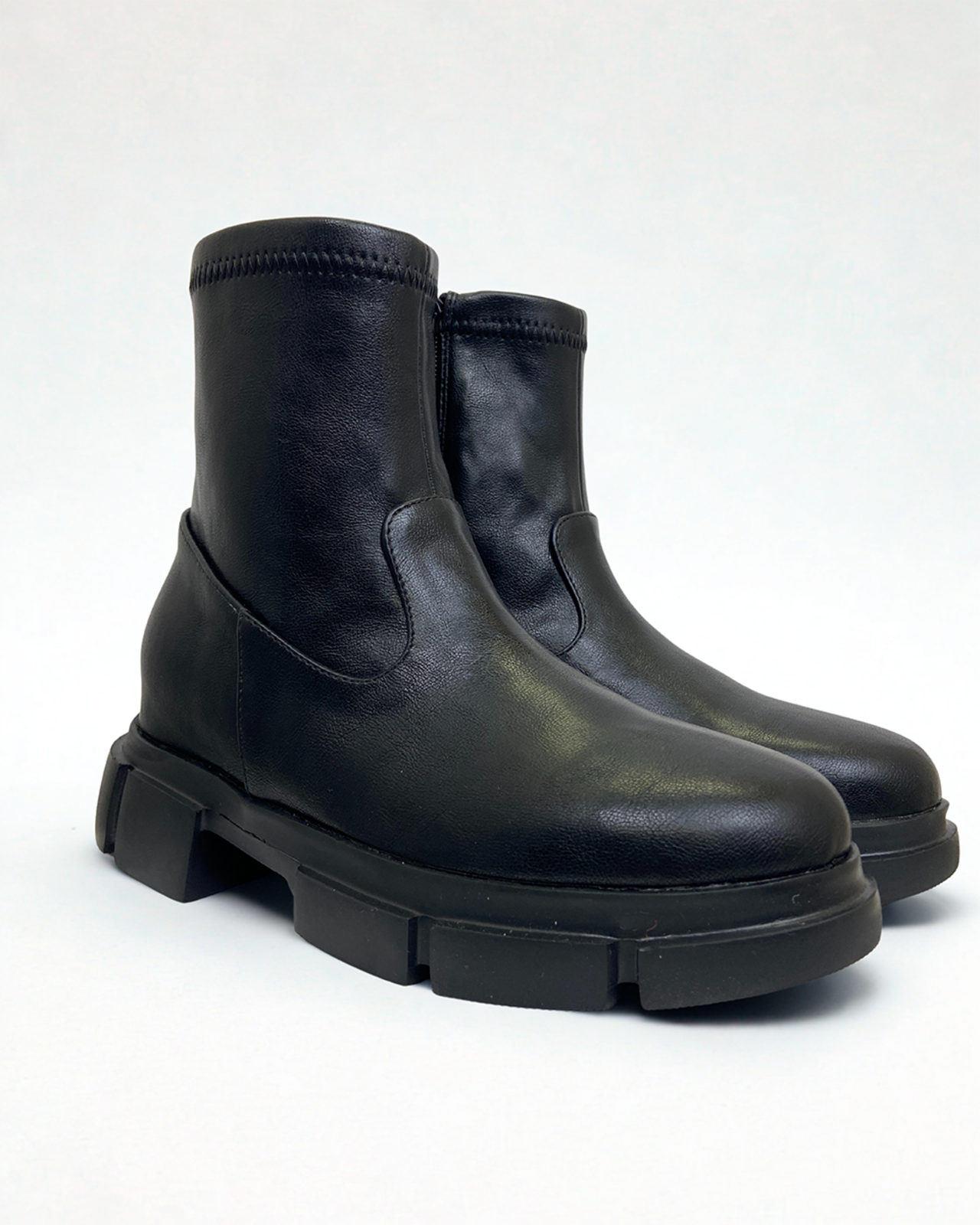 柔らかなストレッチ素材を使用した、履き心地抜群のストレッチブーツ。厚めのソールとゴツ目のプラットフォームが特徴で、トレンド感と存在感を兼ね備えています。カジュアルなスタイルはもちろん、少しドレッシーなコーディネートに外しアイテムとしても。