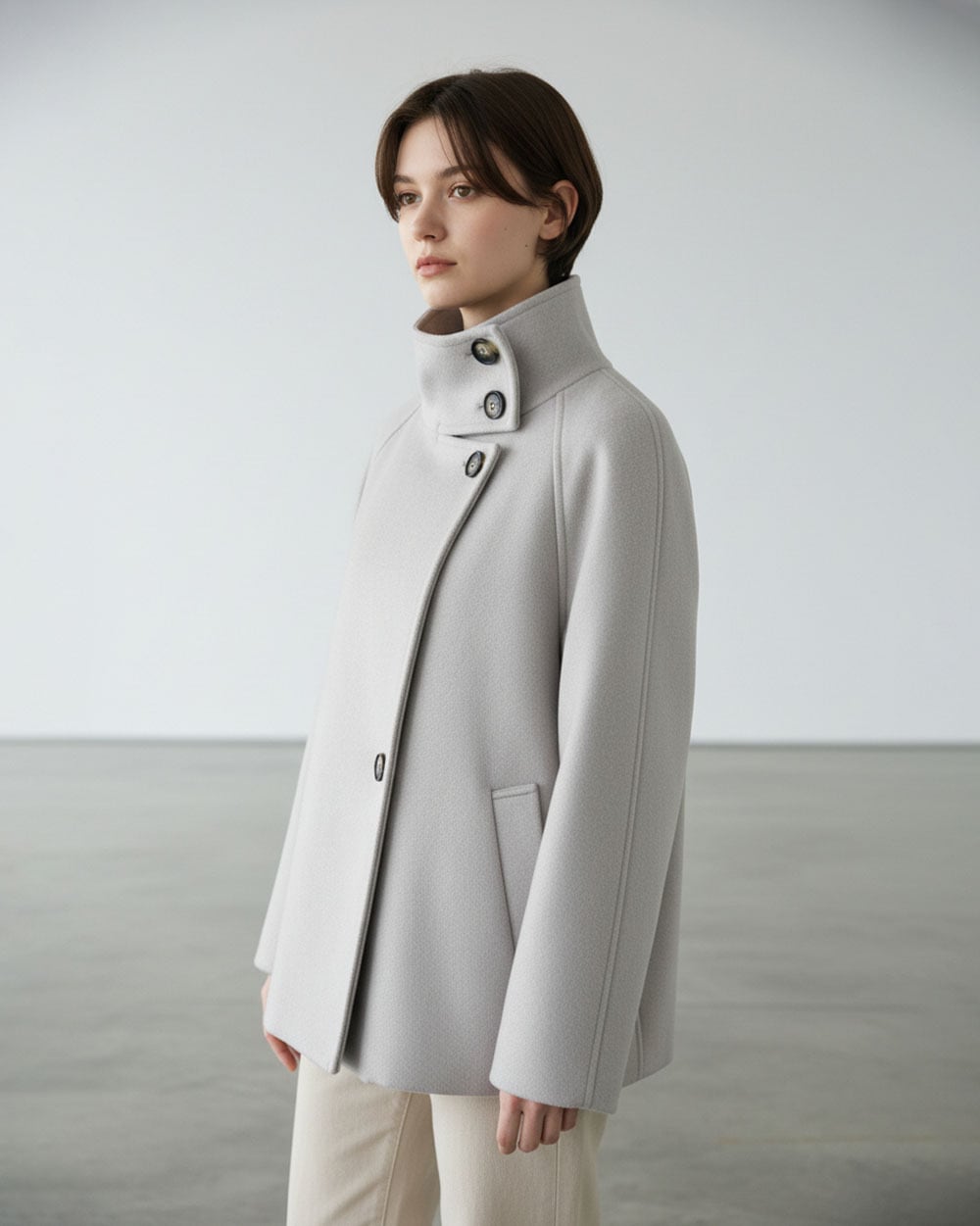スタンドネックデザインのショートコート。