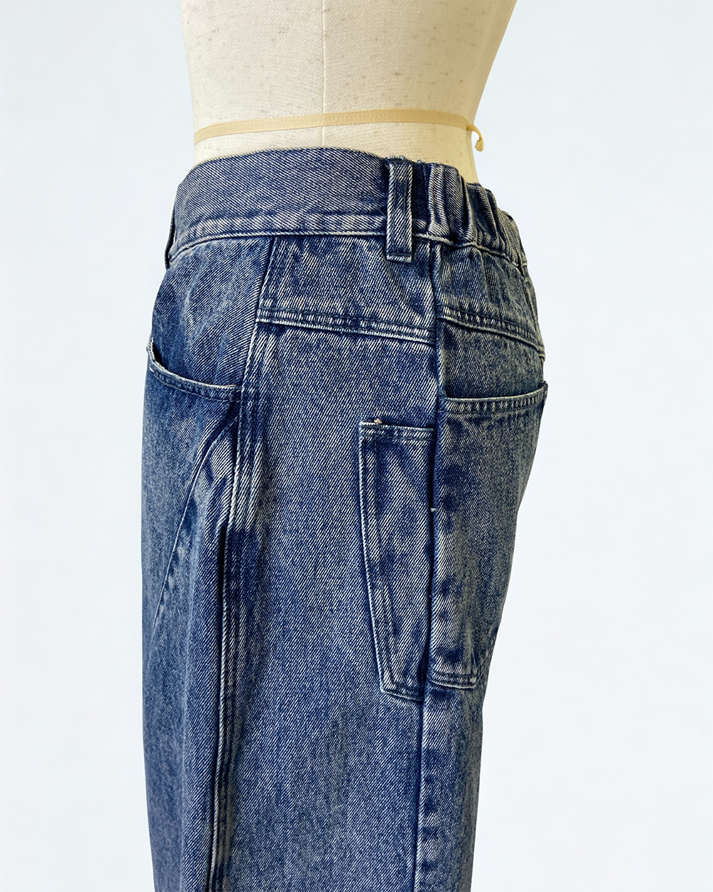 バックスタイルには、2枚のデニムを繋ぎ合わせたようなデザインが施され、他と差をつけるおしゃれを楽しめます。