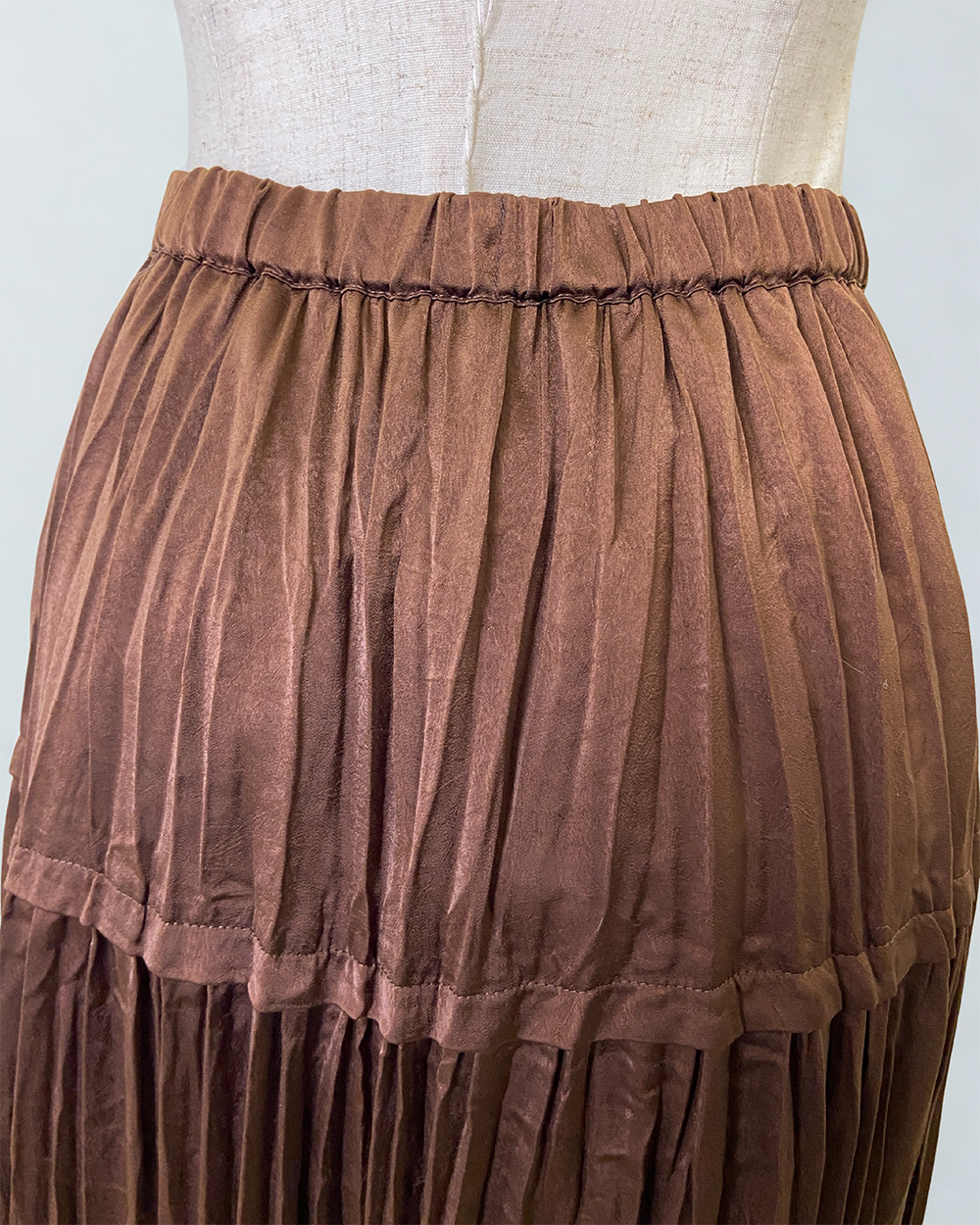 ワッシャービンテージサテン素材を使用したティアードプリーツスカート。