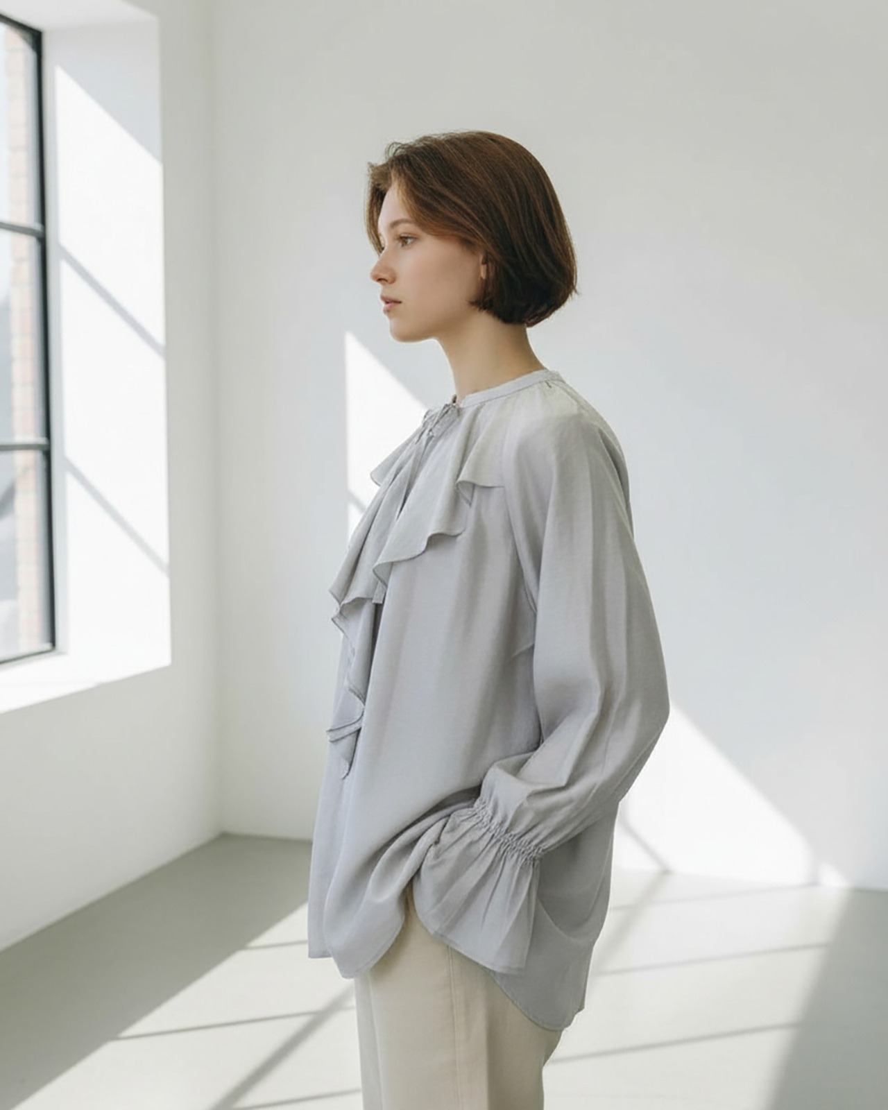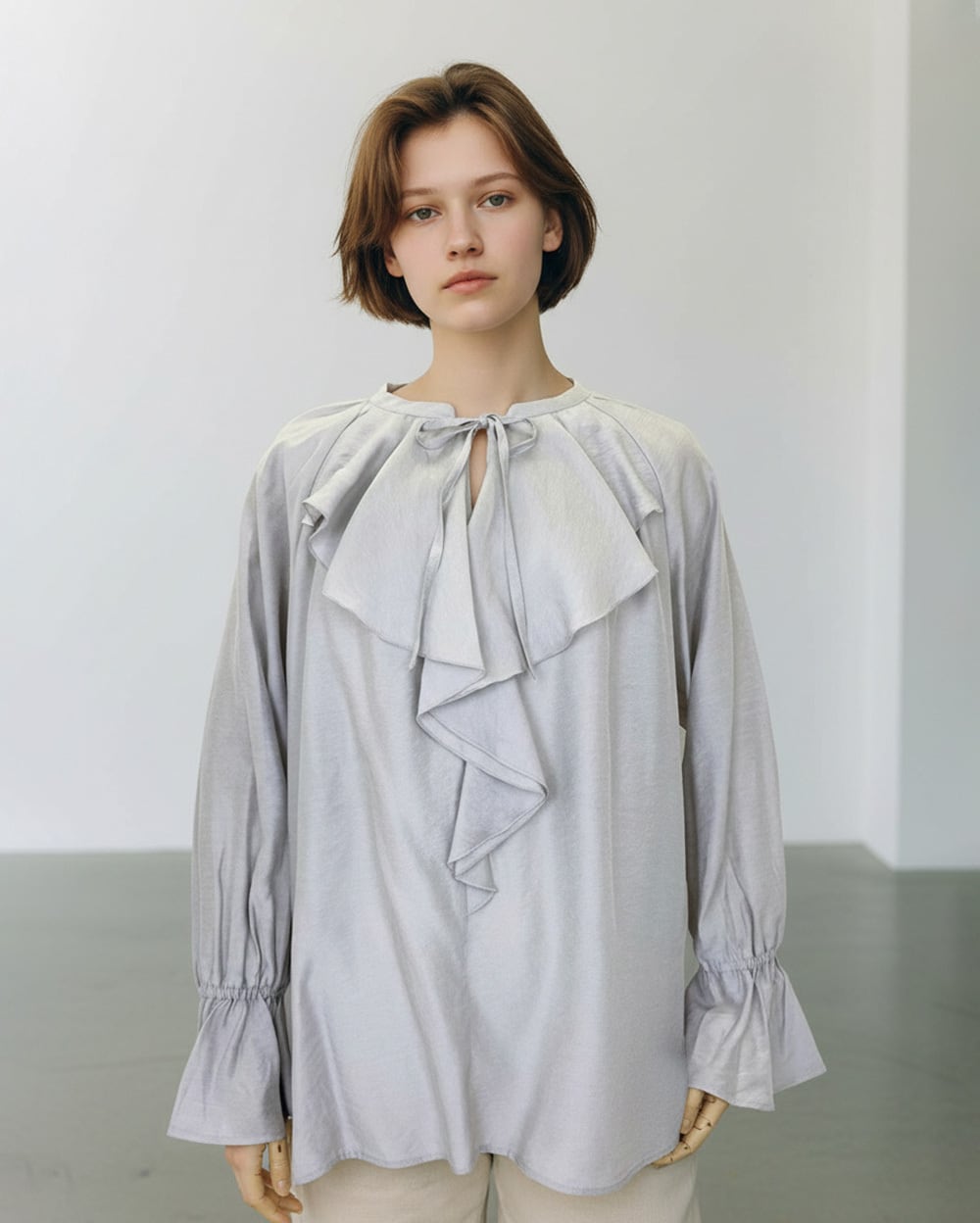 スパンビンテージ生地を使用したフロントフリルブラウス。