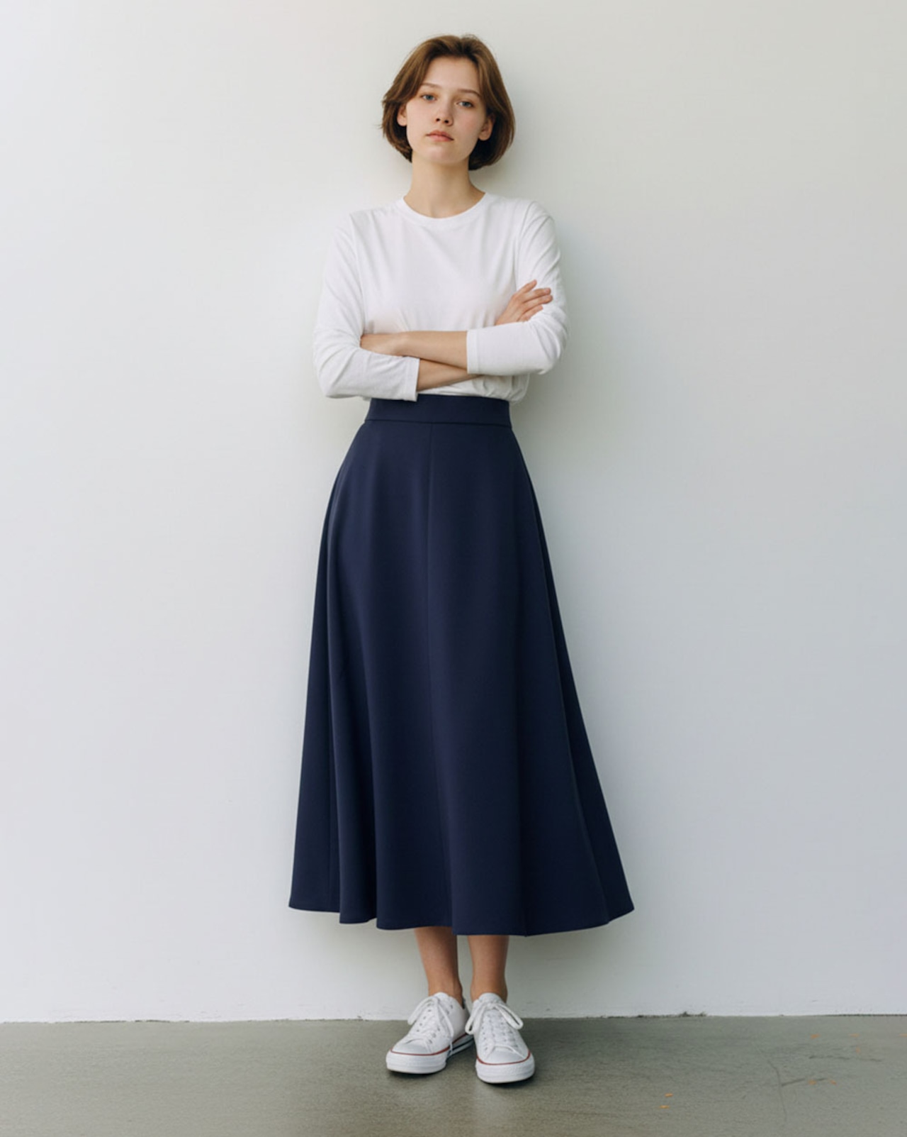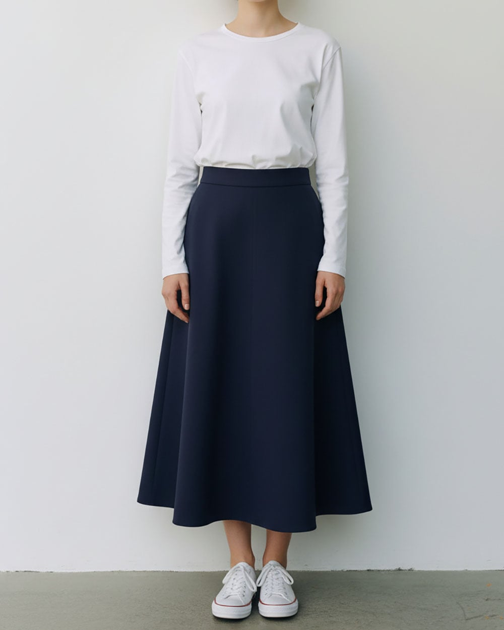 なめらかな表面感とスルッとした肌触りは、まるで履いていないかのような快適さを提供します。美しいドレープ感が特徴で、セレモニーシーンにも最適なエレガントな一枚。動くたびに広がるフレアがフェミニンな印象を演出します。どんなトップスとも相性が良く、幅広いコーディネートを楽しむことができます。