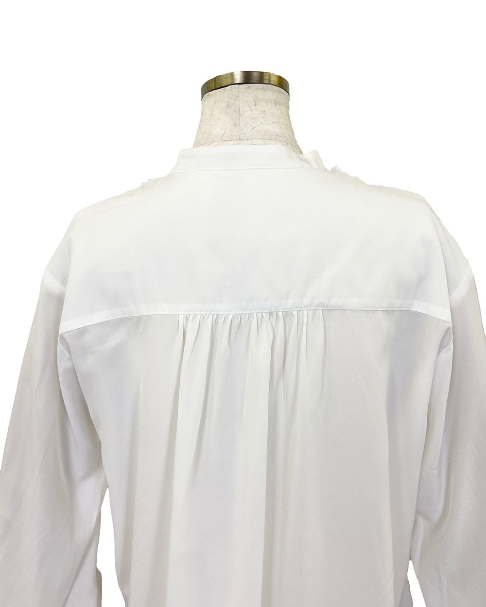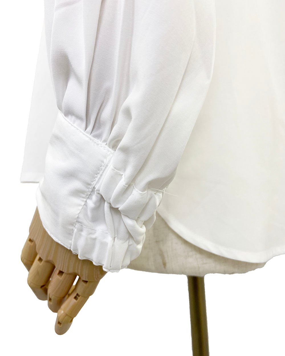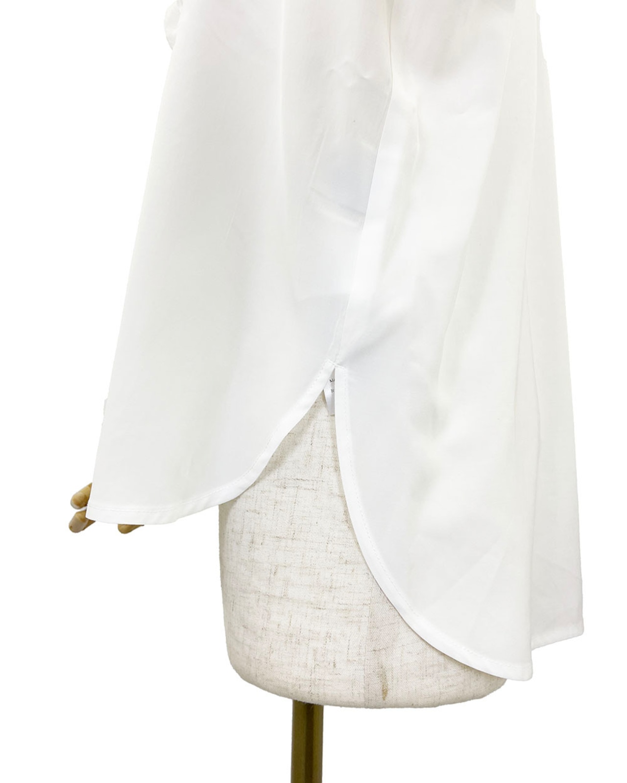 襟とフリルには透け感のあるシアー素材が使われ、身頃にはマットな質感のデシンを採用したデザイン。軽やかな着心地で、カジュアルからドレスアップまで幅広いシーンで活躍する一着です。裾はラウンドしているため、裾アウトスタイルでもおしゃれに決まります!