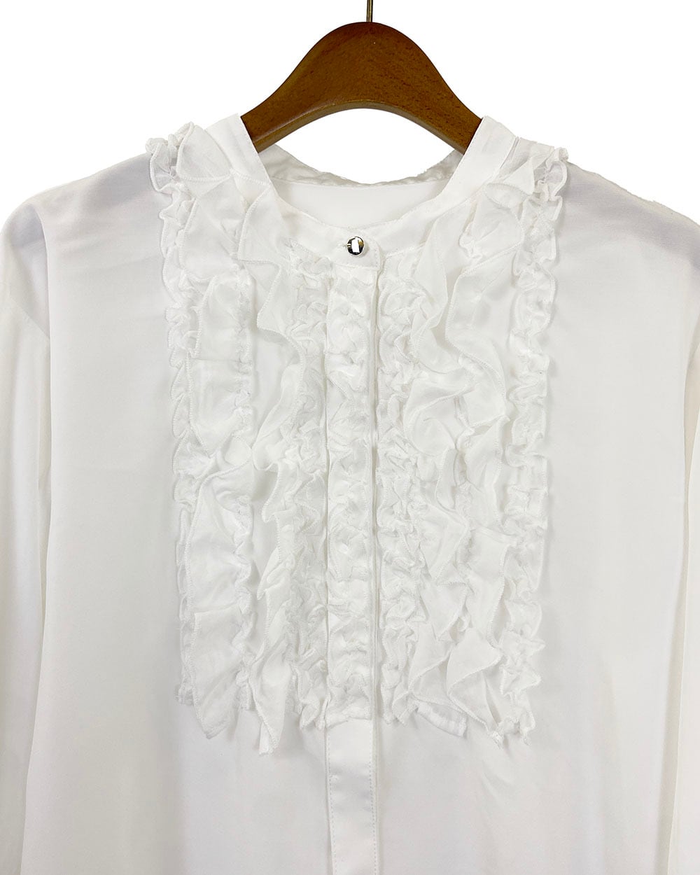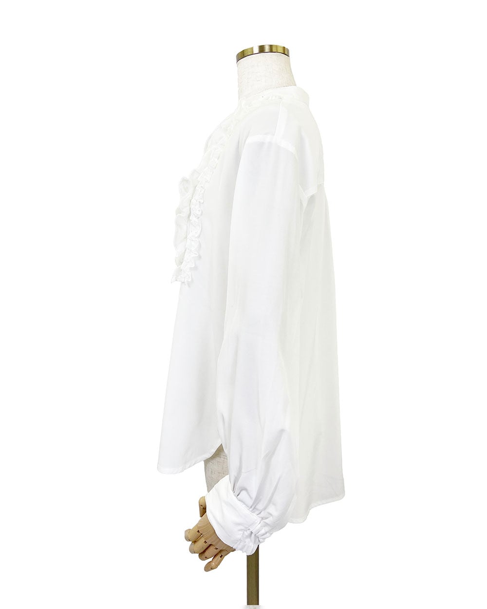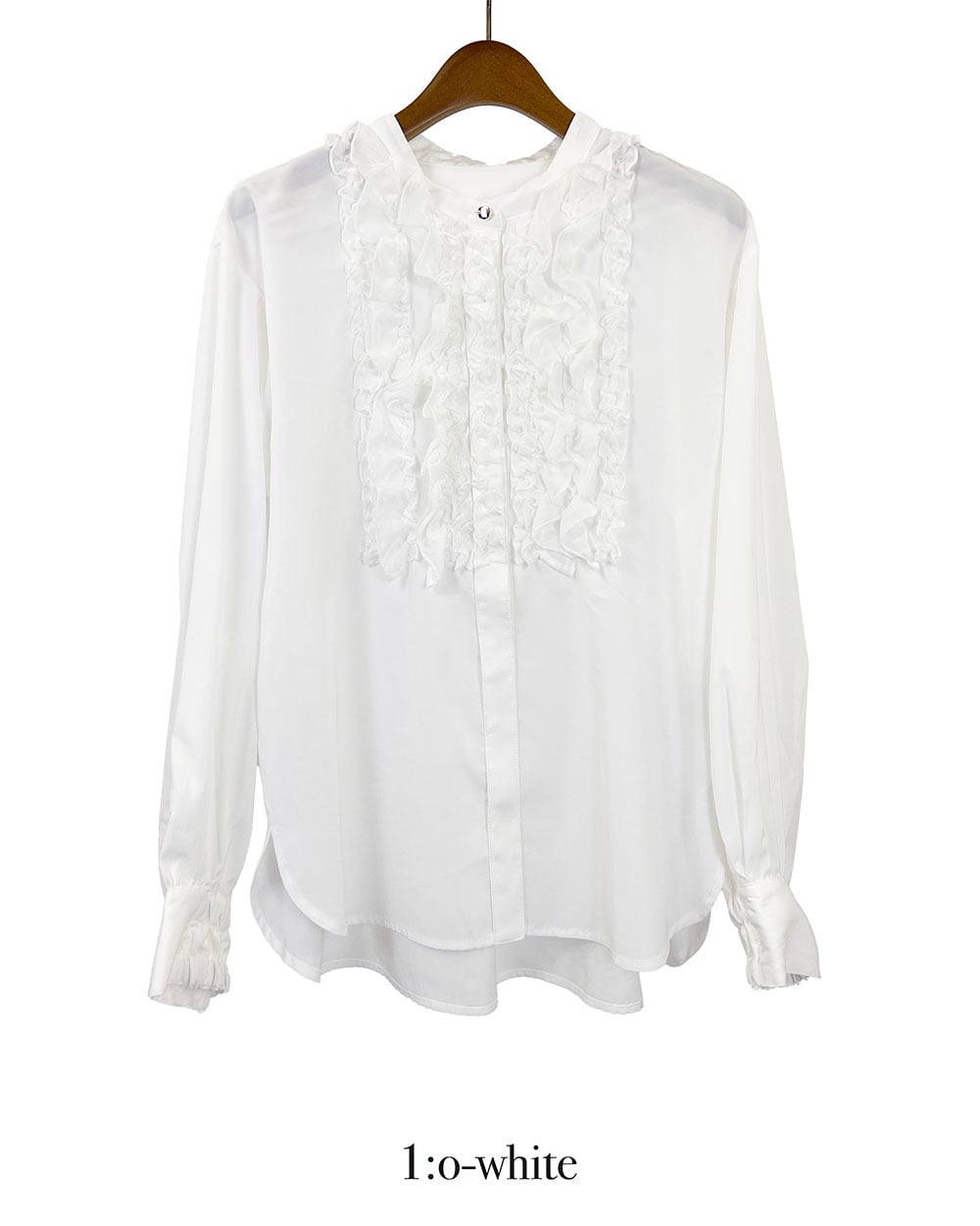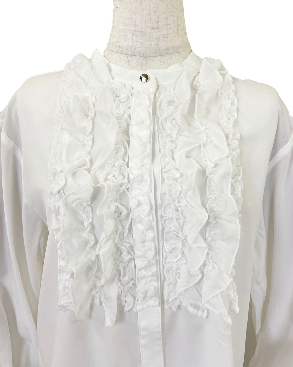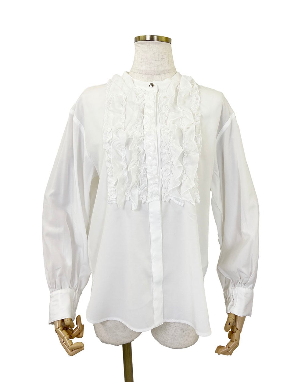 華やかなフロントフリルが特徴のシアーブロードフリルブラウス。