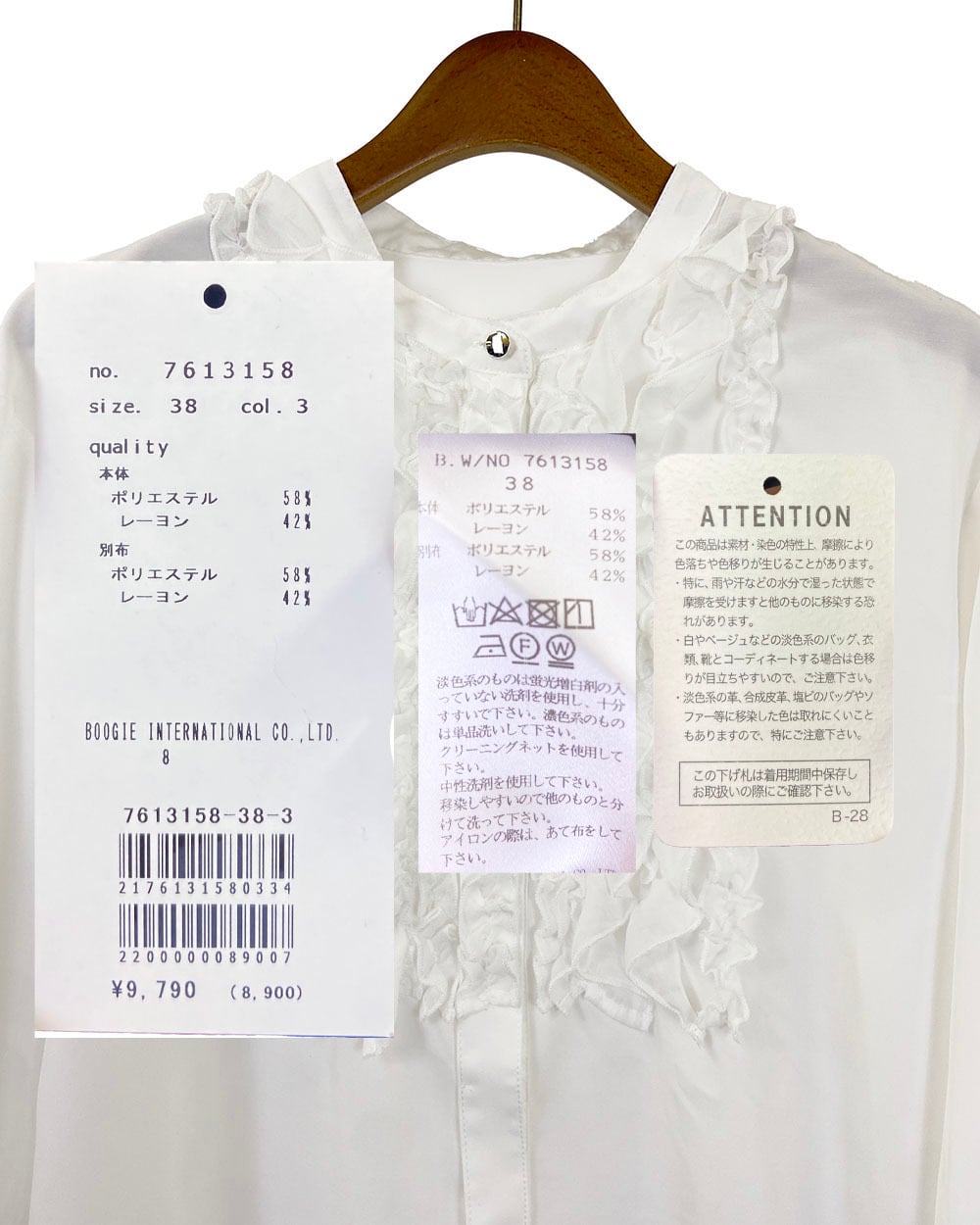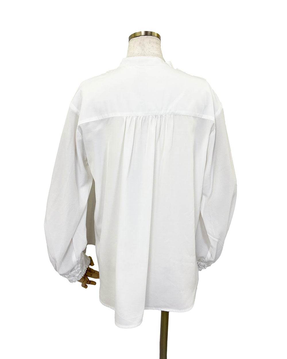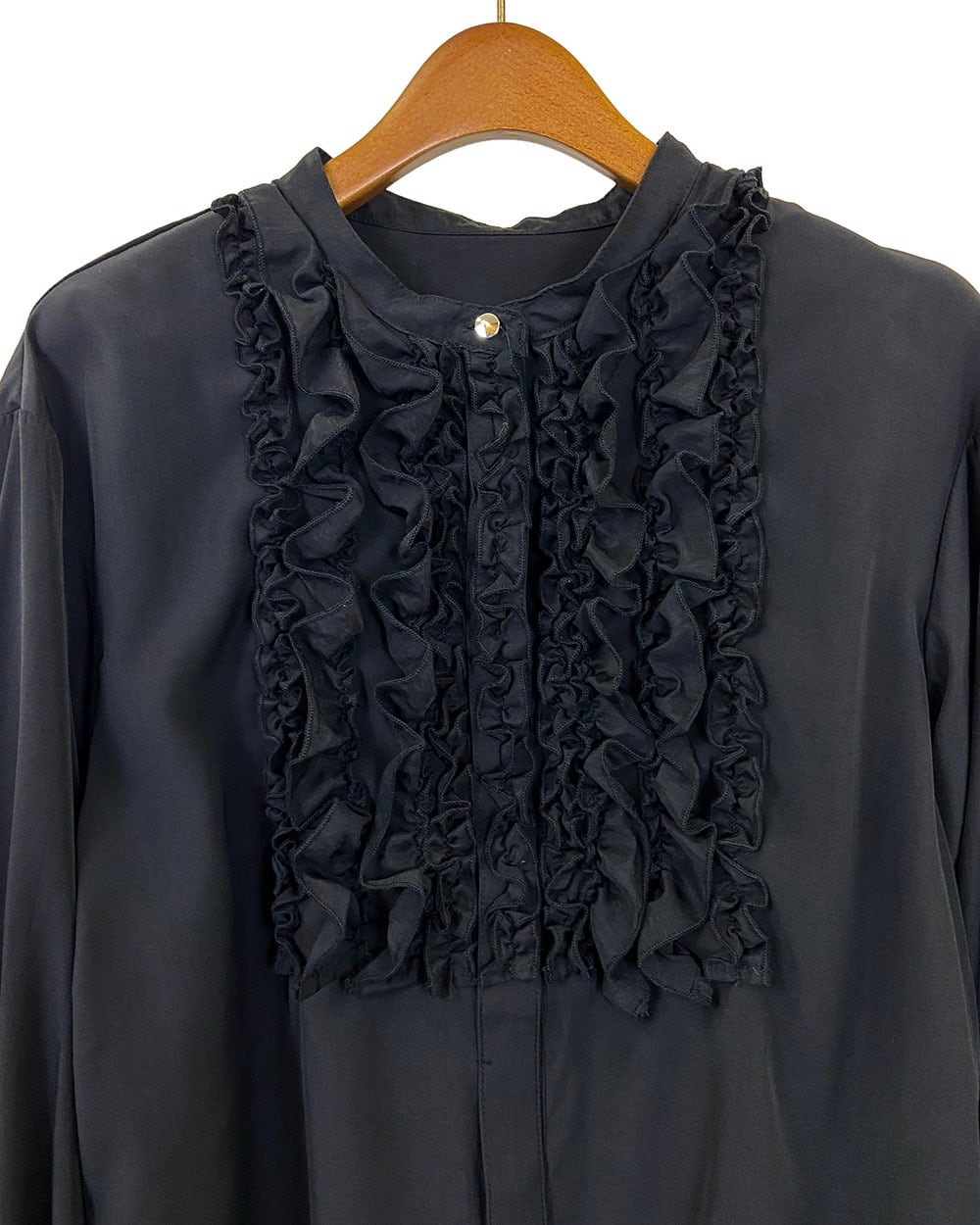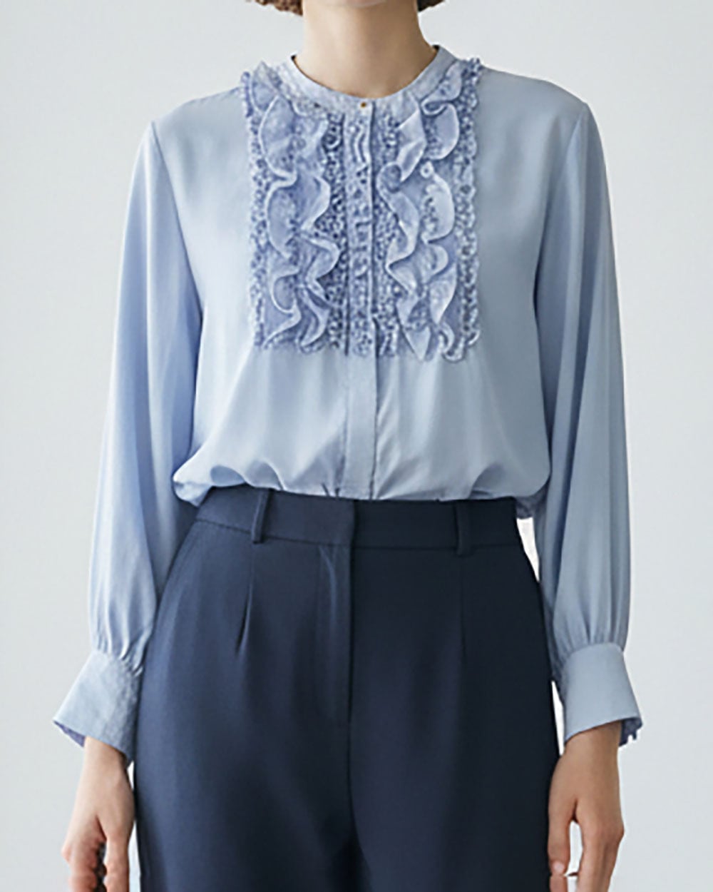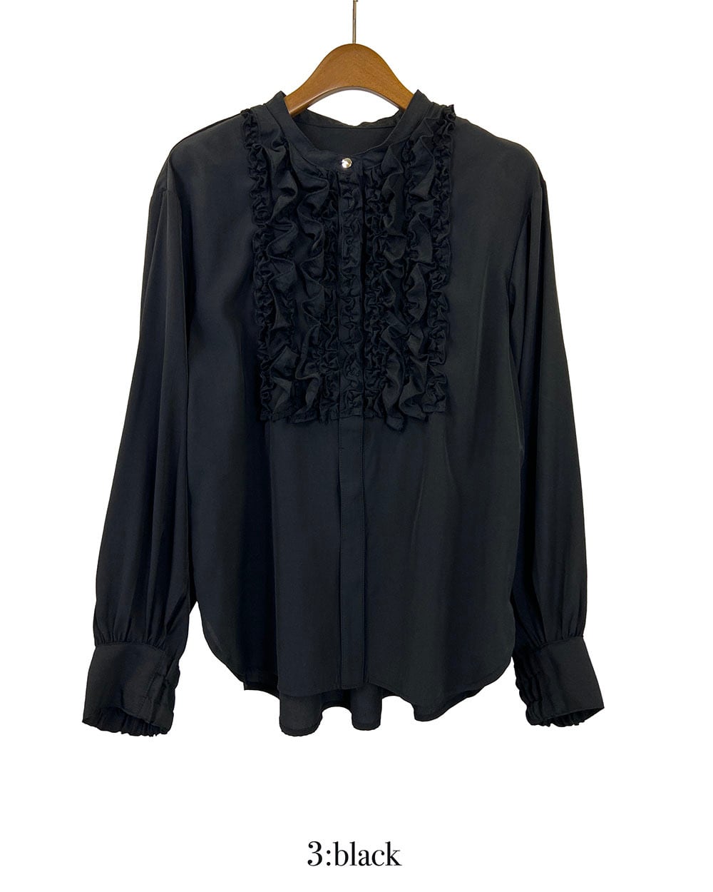 華やかなフロントフリルが特徴のシアーブロードフリルブラウス。