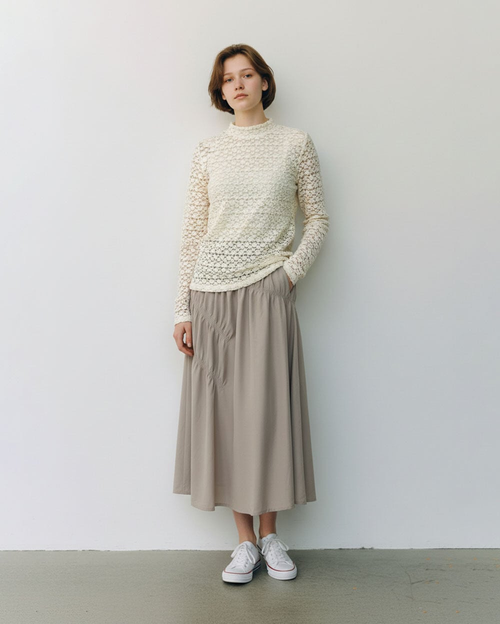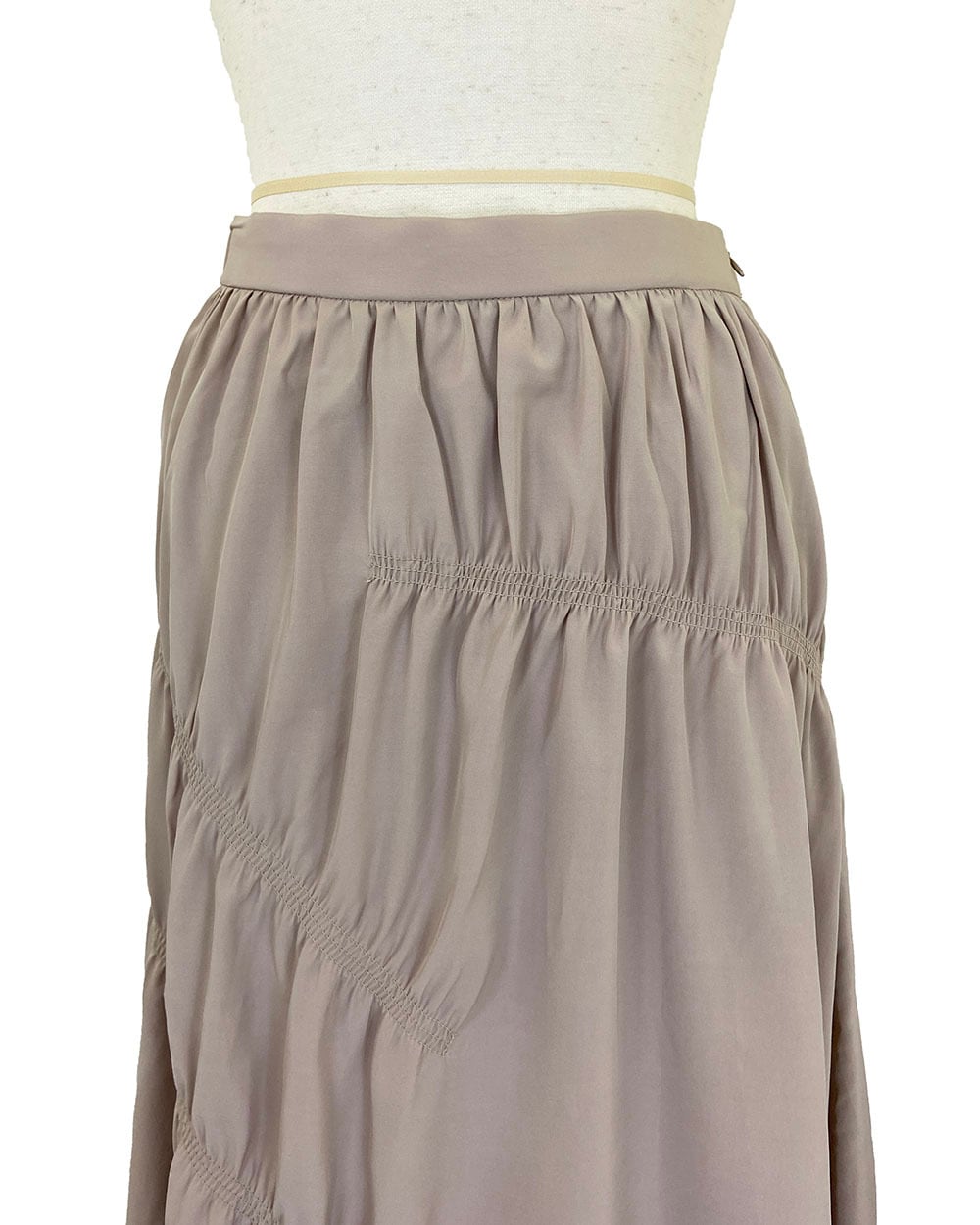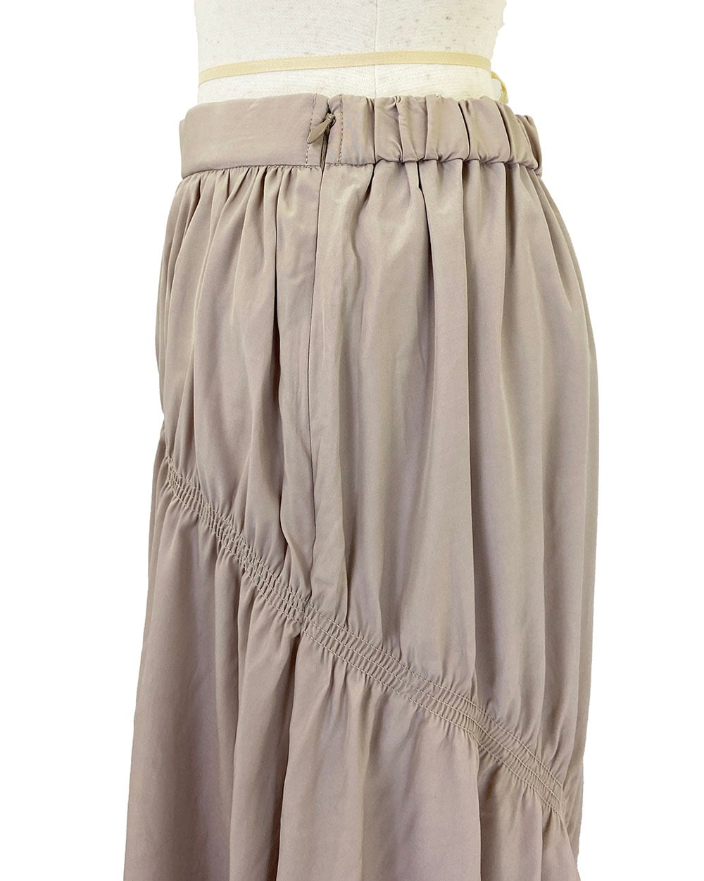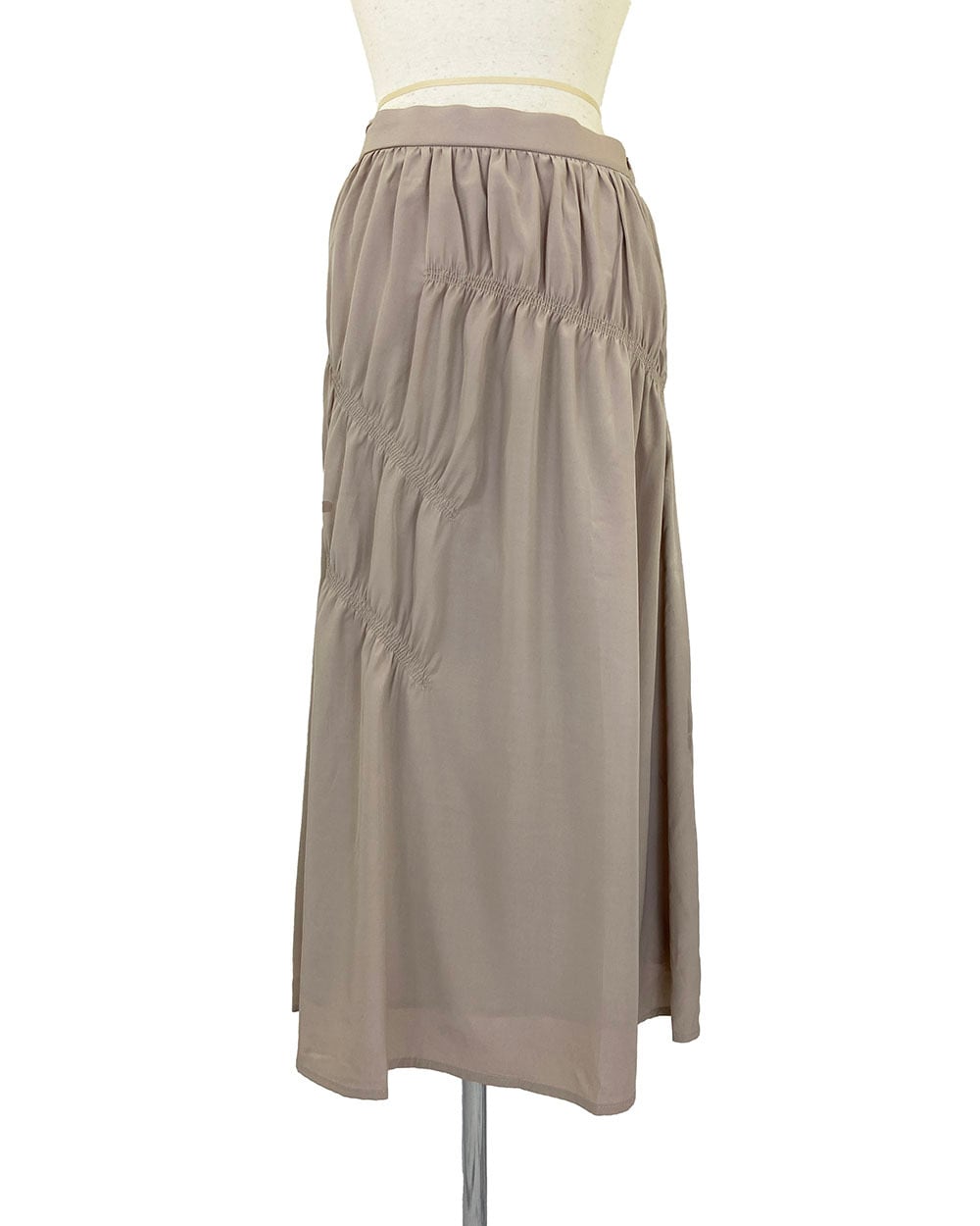アシンメトリーなデザインが特徴です。ゴムシャーリングで動きやすさと快適さを実現。