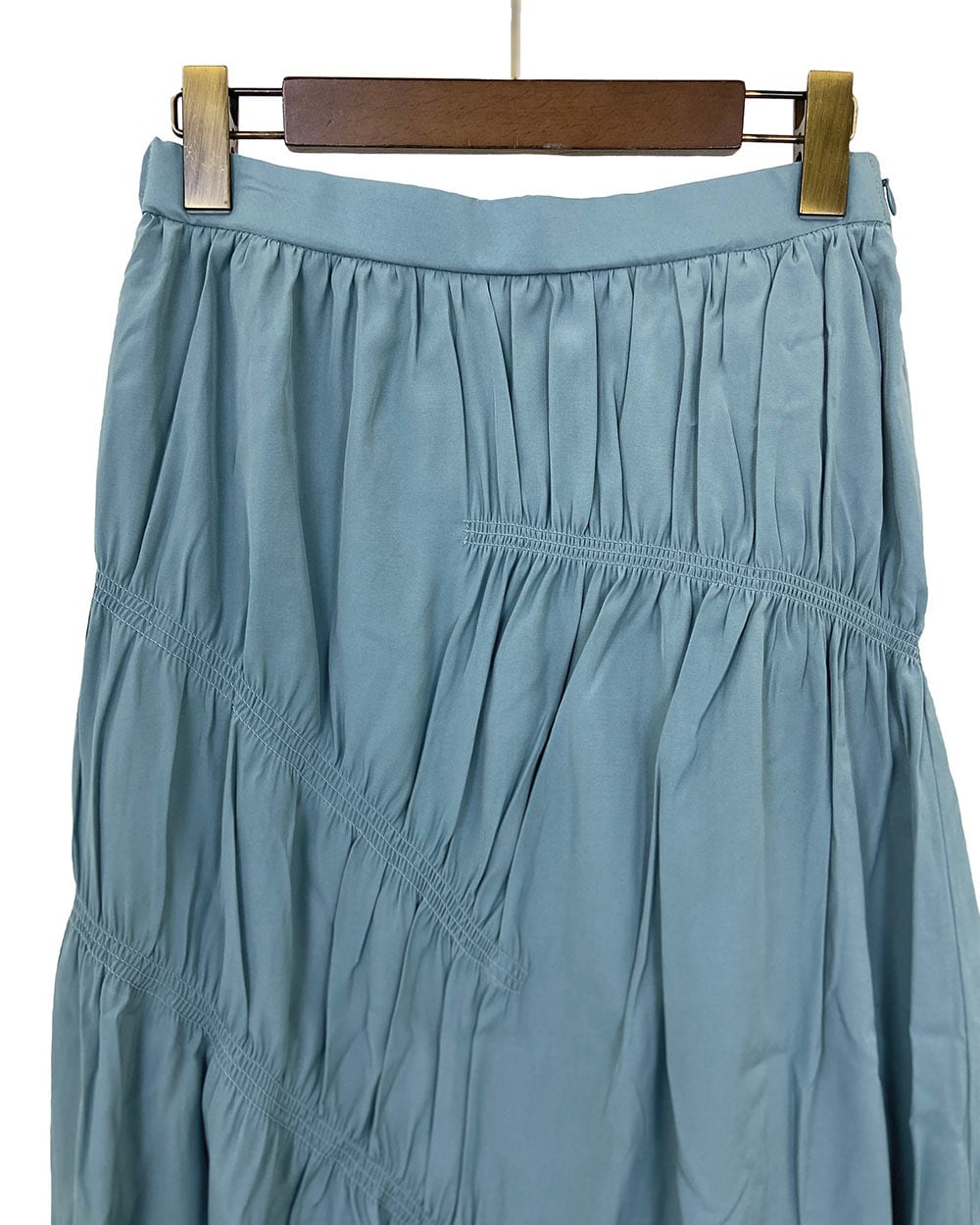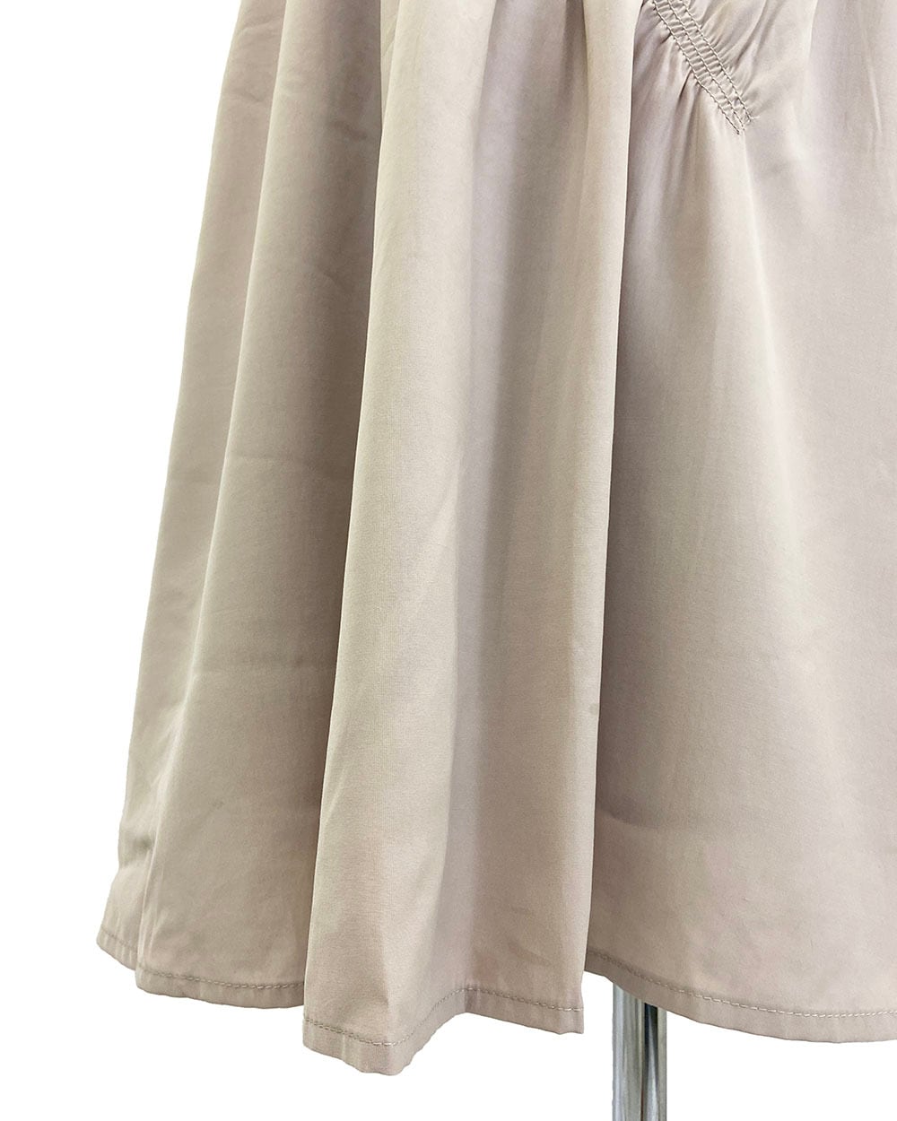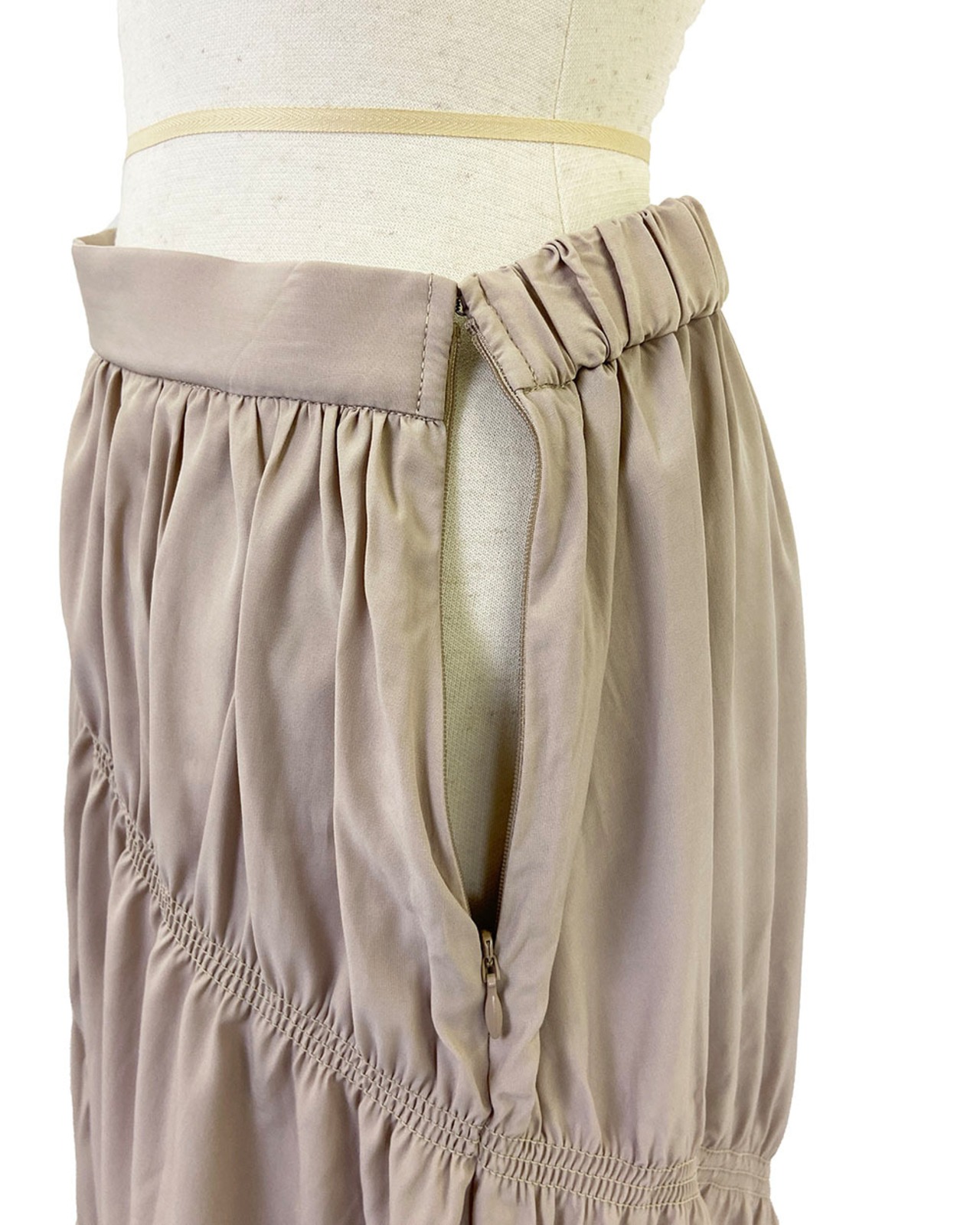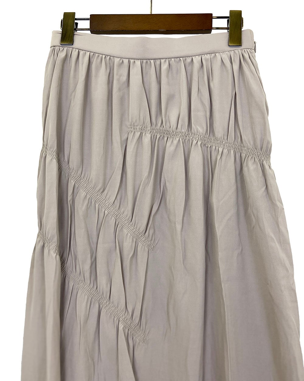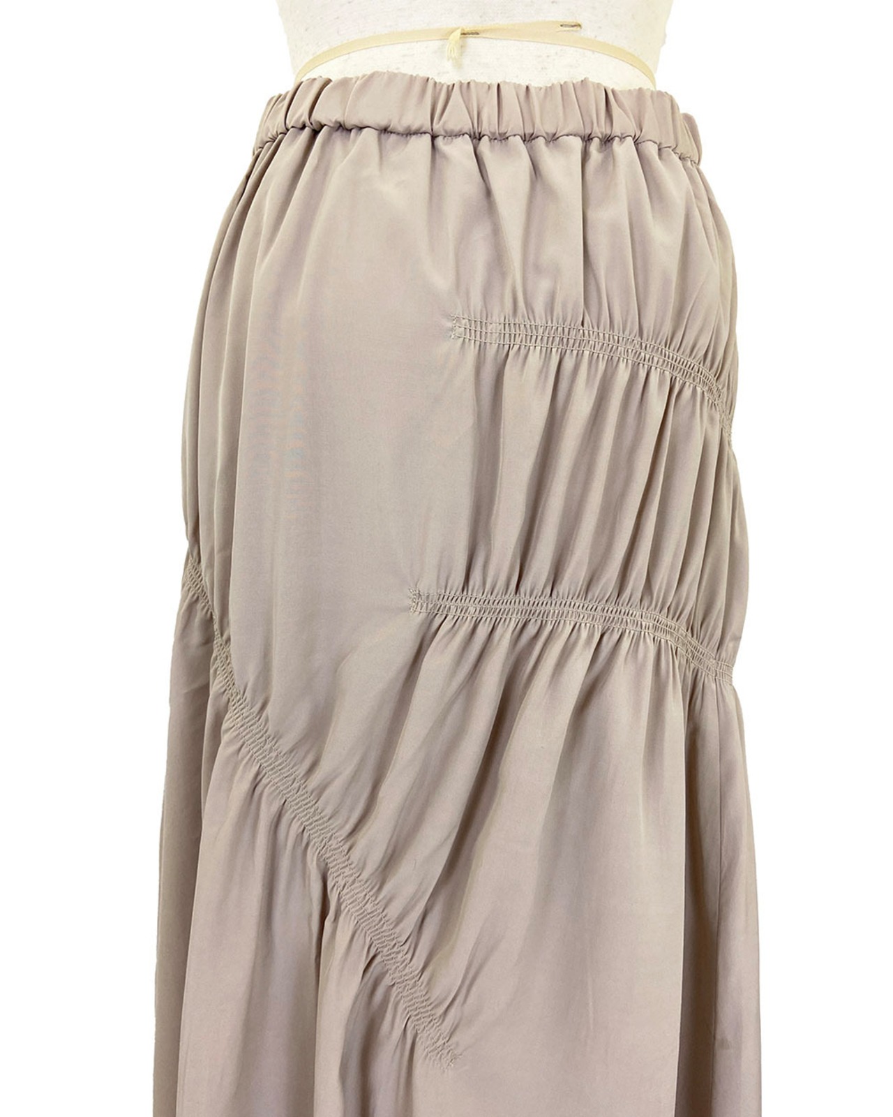 アシンメトリーなデザインが特徴です。ゴムシャーリングで動きやすさと快適さを実現。