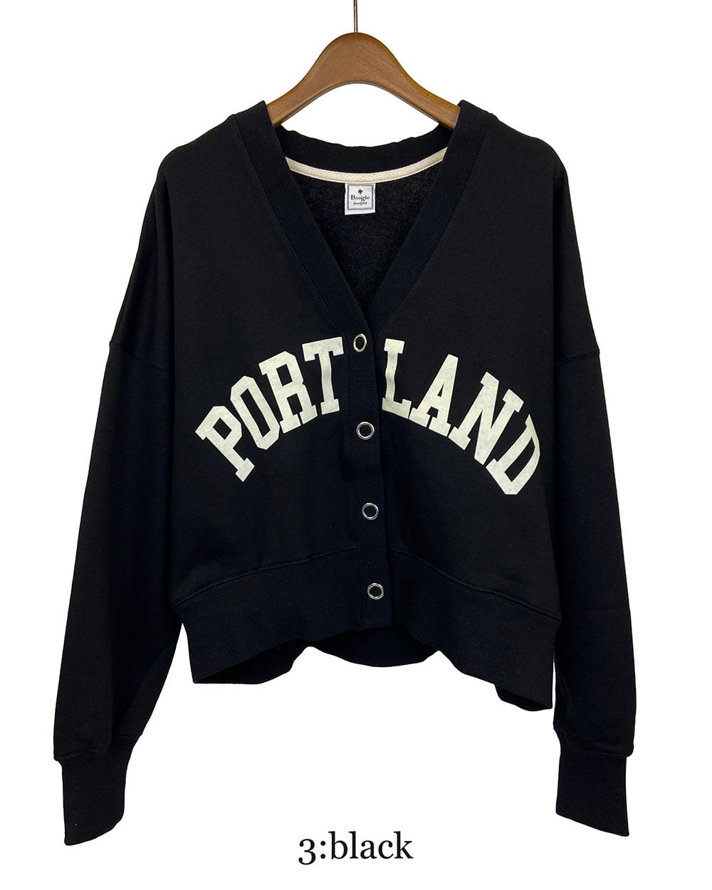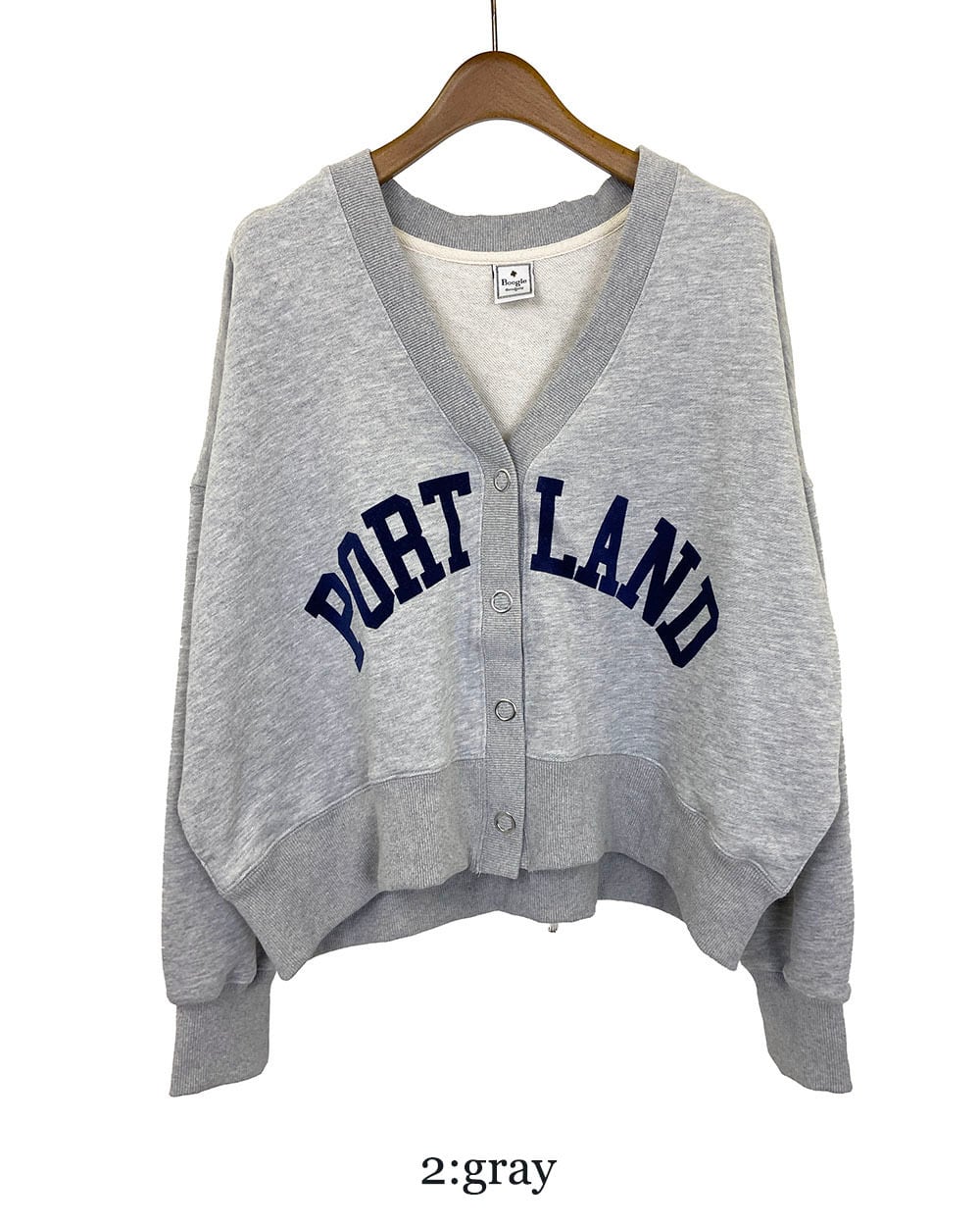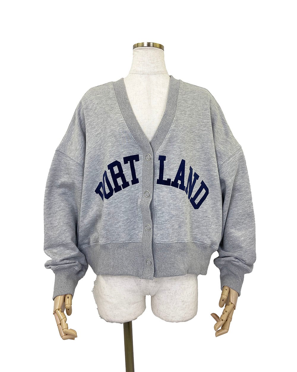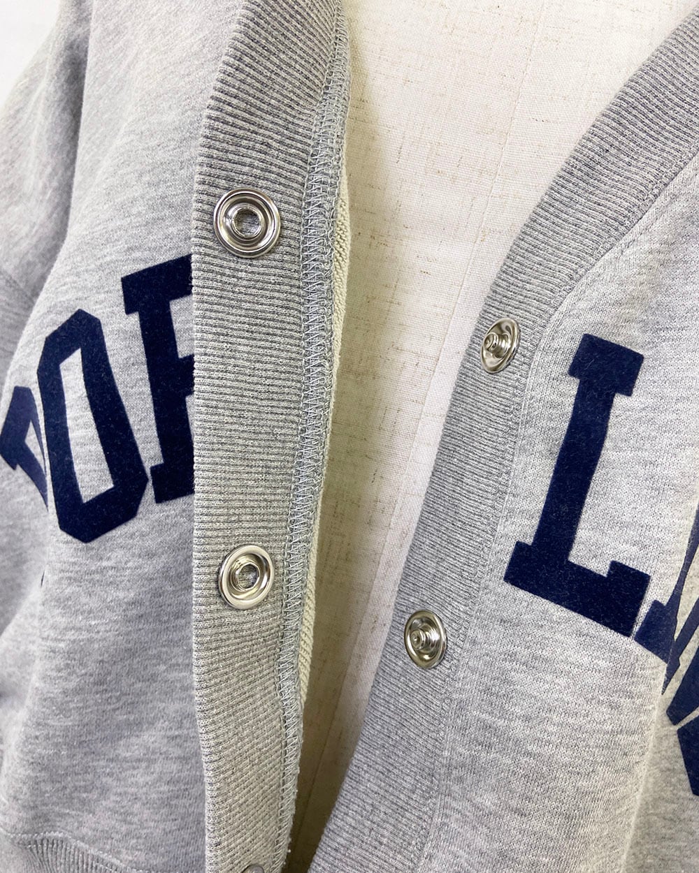 ワイドシルエットがかわいいフロッキーロゴプリントのVネックカーディガンです。