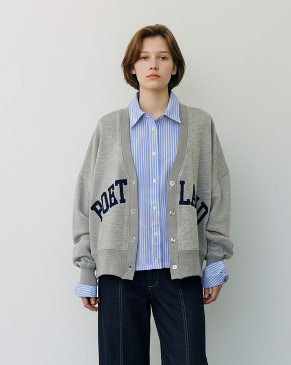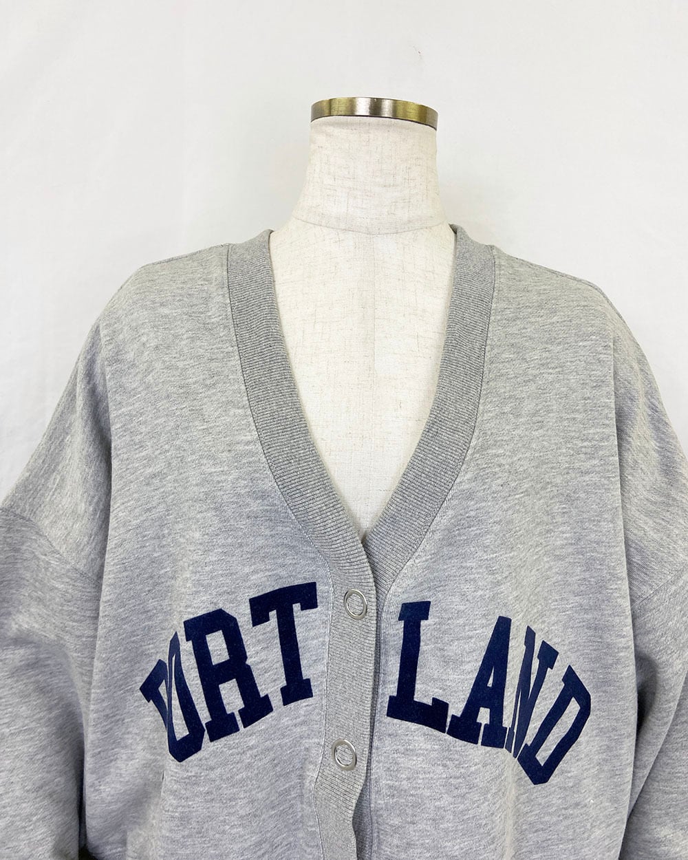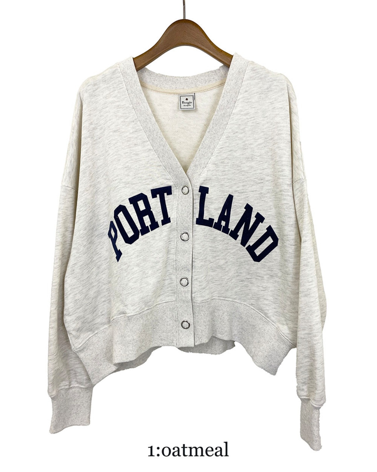 ワイドシルエットがかわいいフロッキーロゴプリントのVネックカーディガンです。