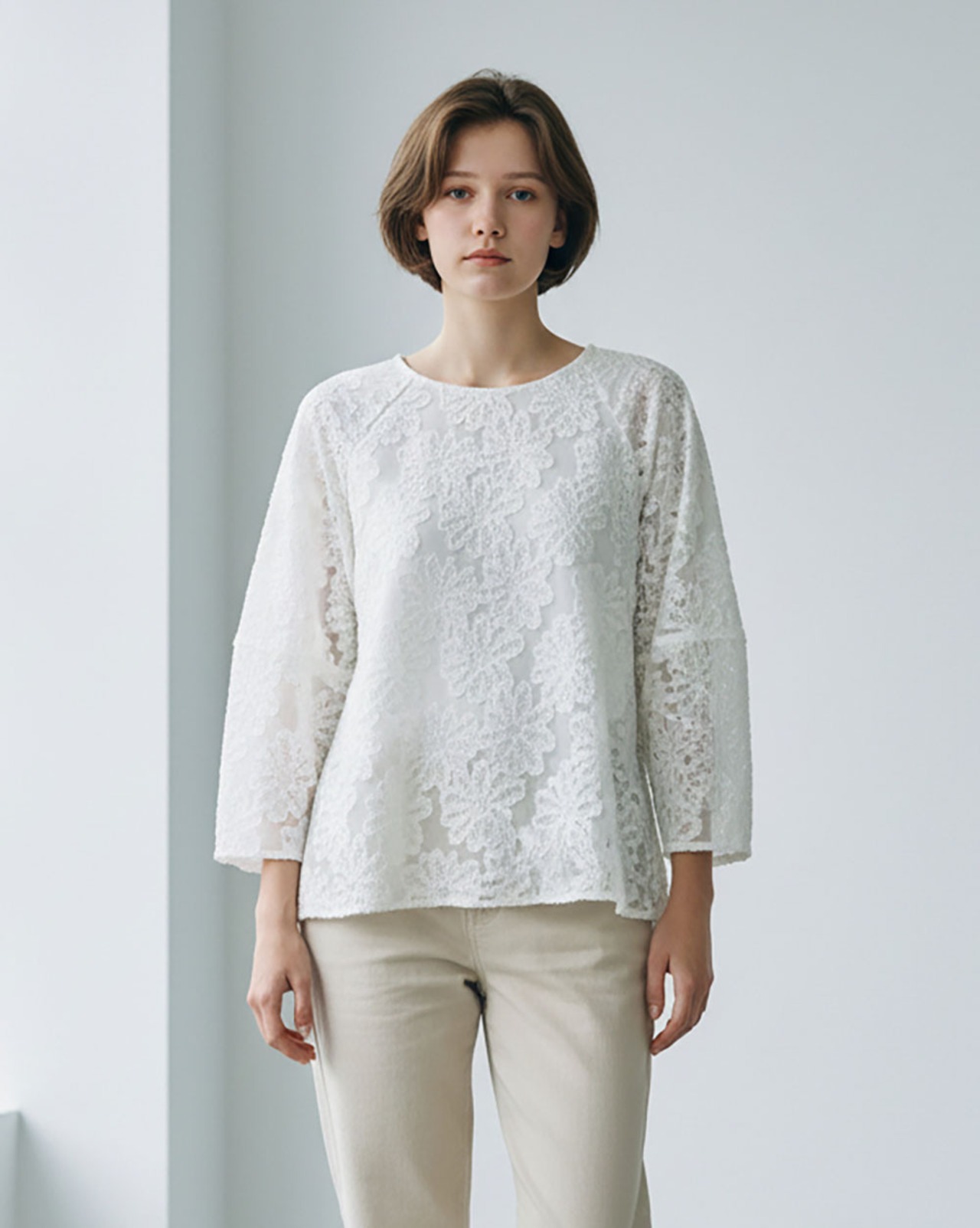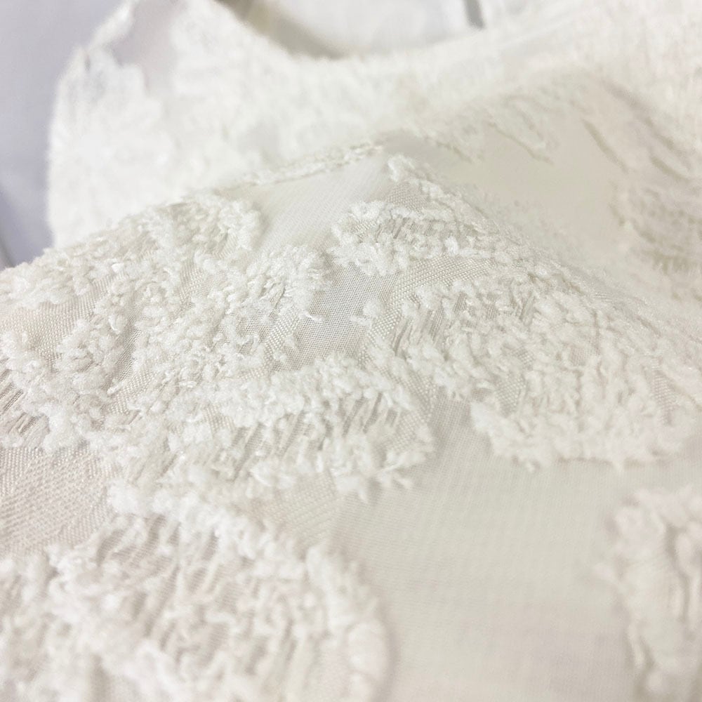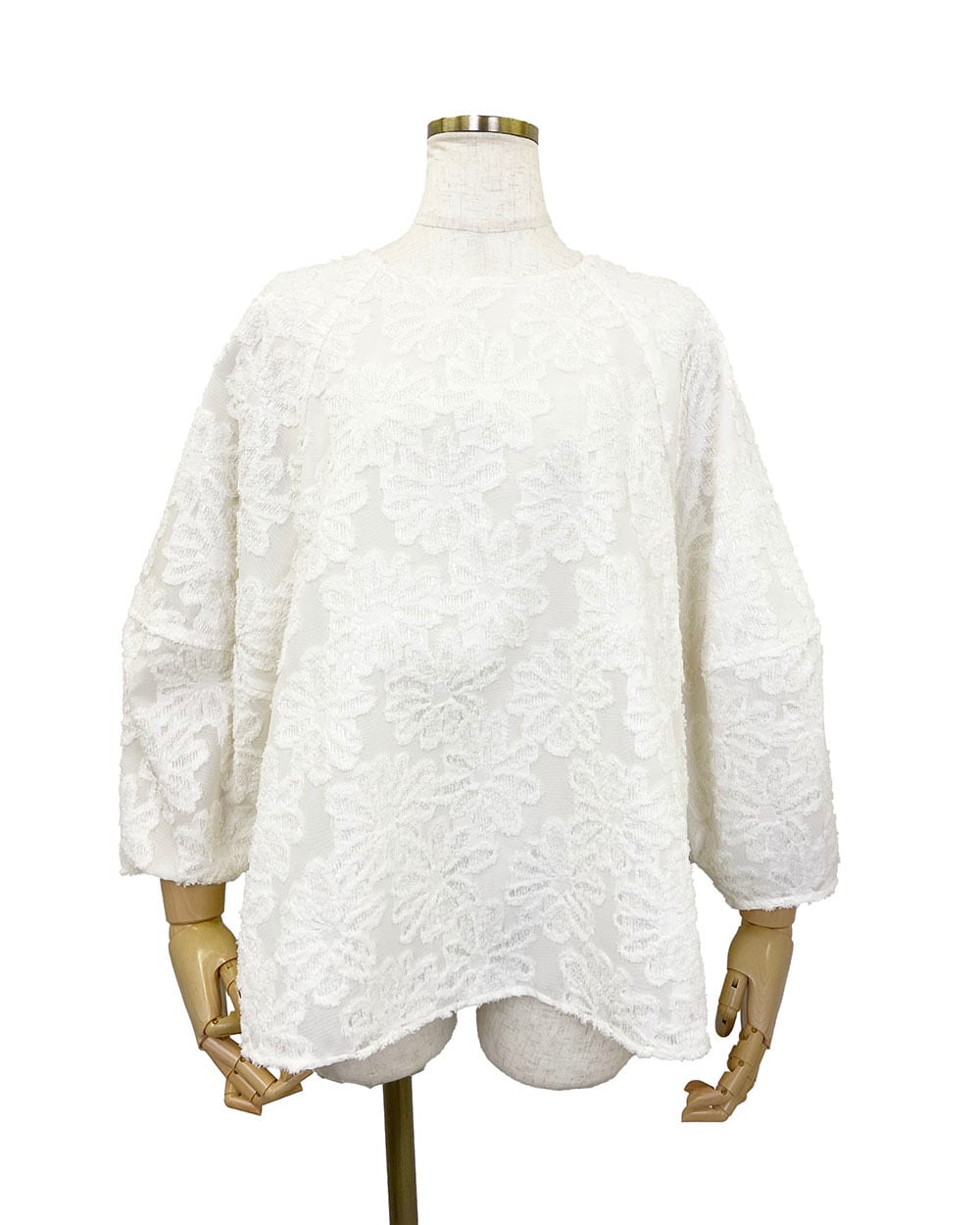 美しいフラワージャガードが施されたプルオーバーブラウスです。透け感のある素材と、華やかなランタンスリーブが特徴的で、女性らしさを引き立てます。9分袖のデザインは季節を問わず活躍し、さまざまなシーンでご着用いただけるアイテムです!シンプルなボトムスやスカートとのコーディネートも楽しめます。セレモニーにも!