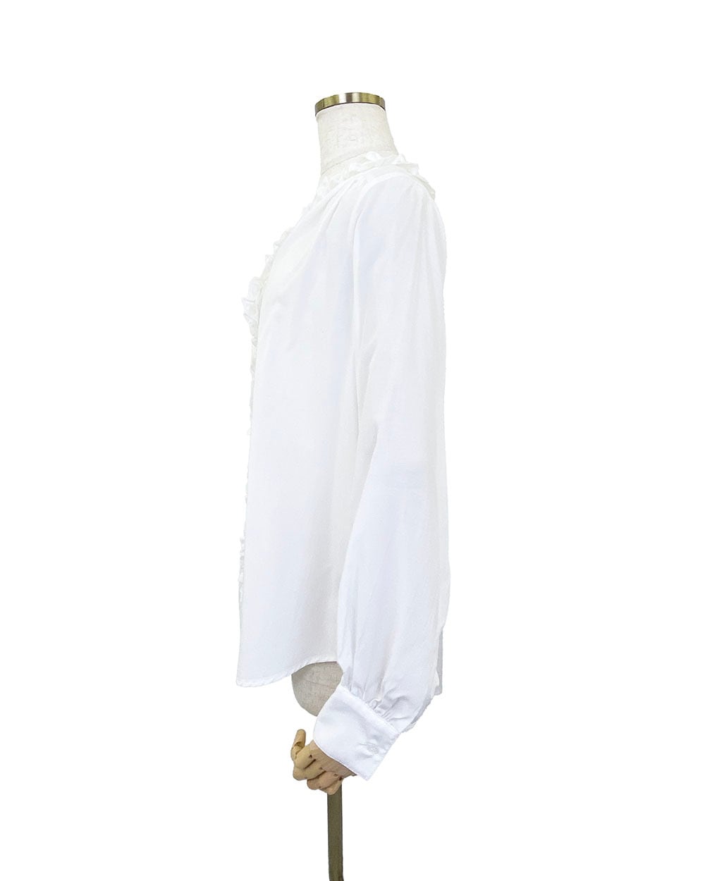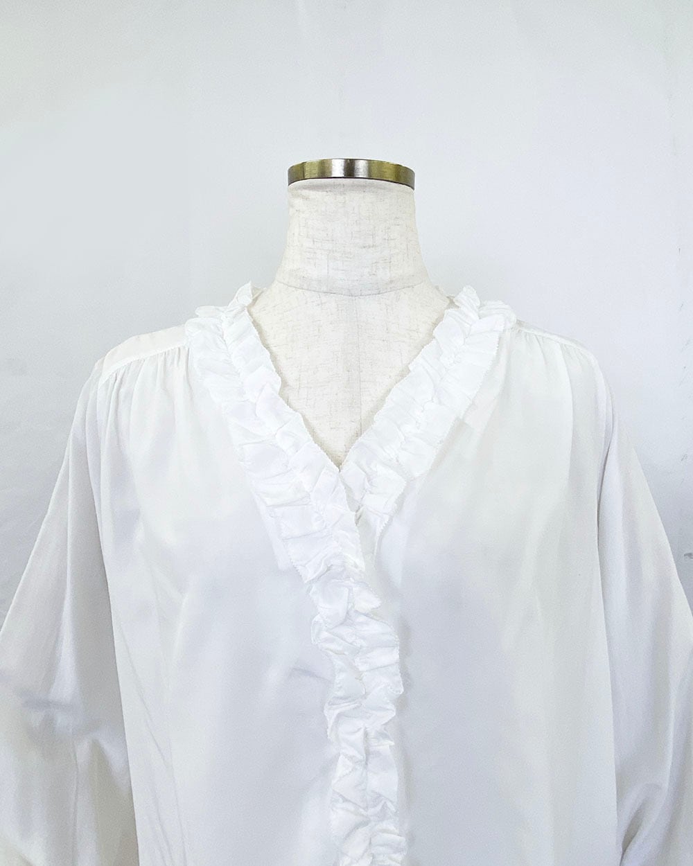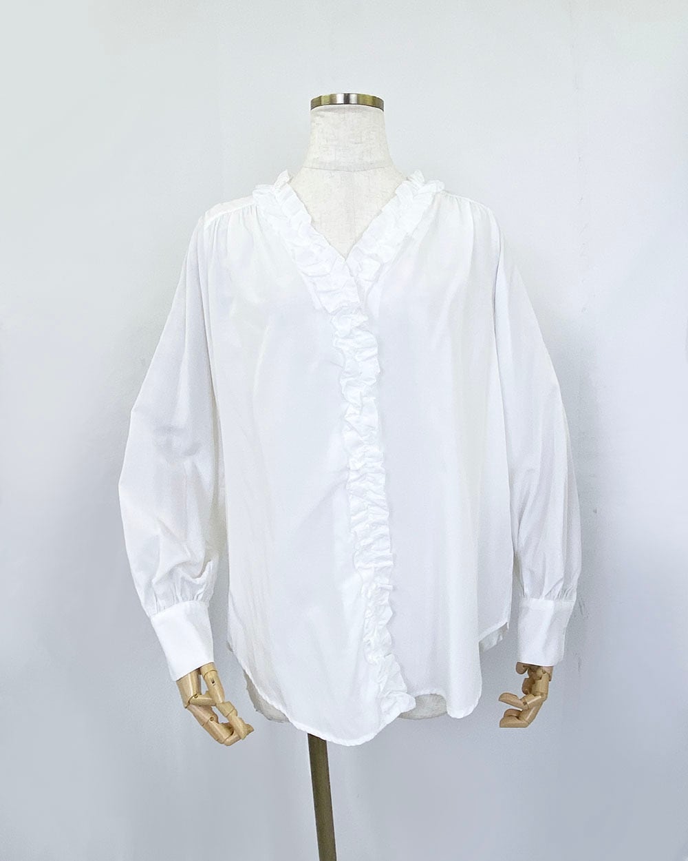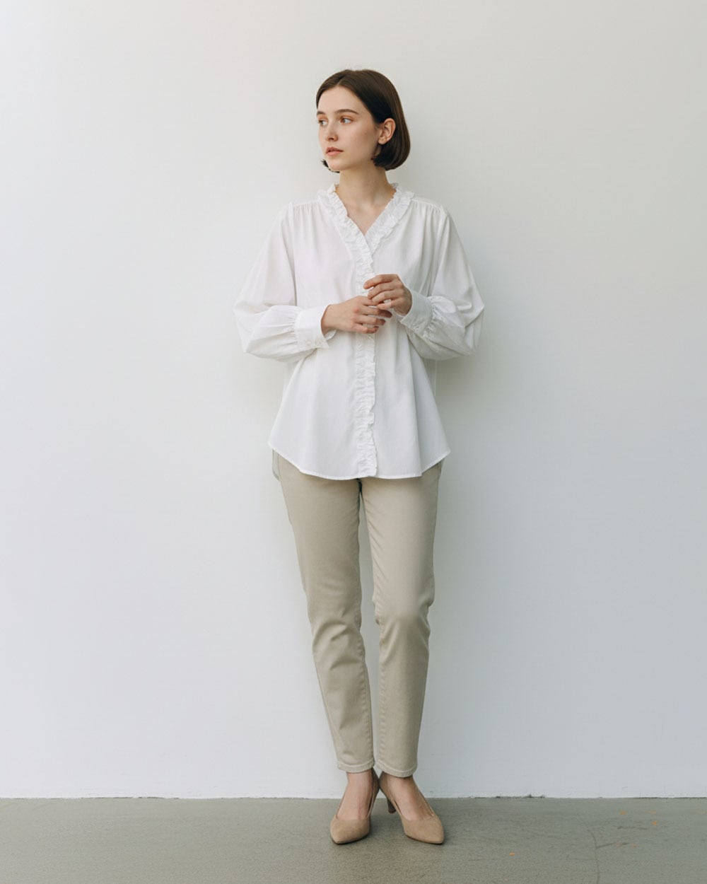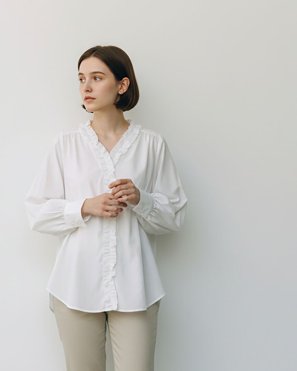 前立てから襟元にかけて、波打つようなラッフルフリルを贅沢にあしらいました。Vネックのラインに沿って施されたフリルが、首元をすっきりと見せつつ、エレガントで立体的な華やぎを演出します。ジャケットのインナーとしても映え、1枚で主役になるデザインです。