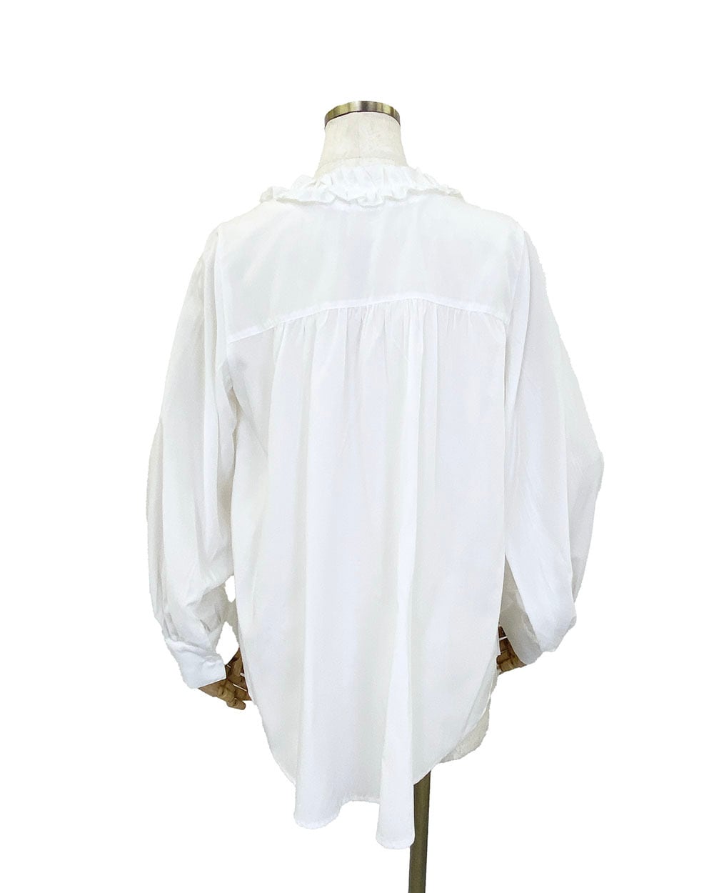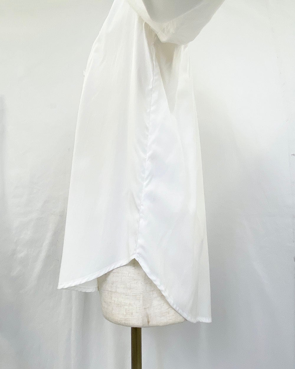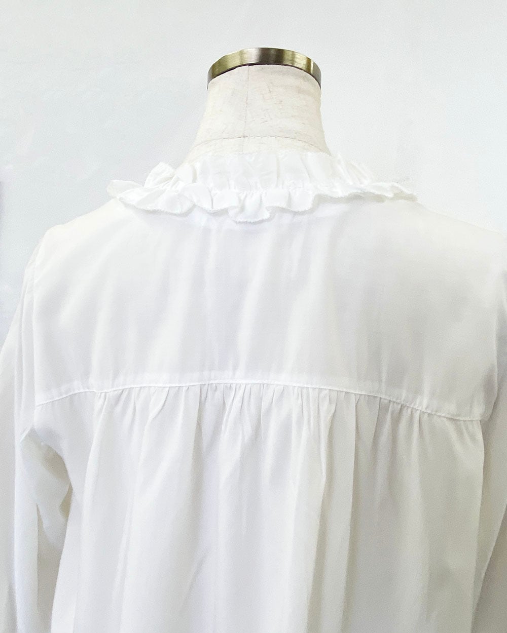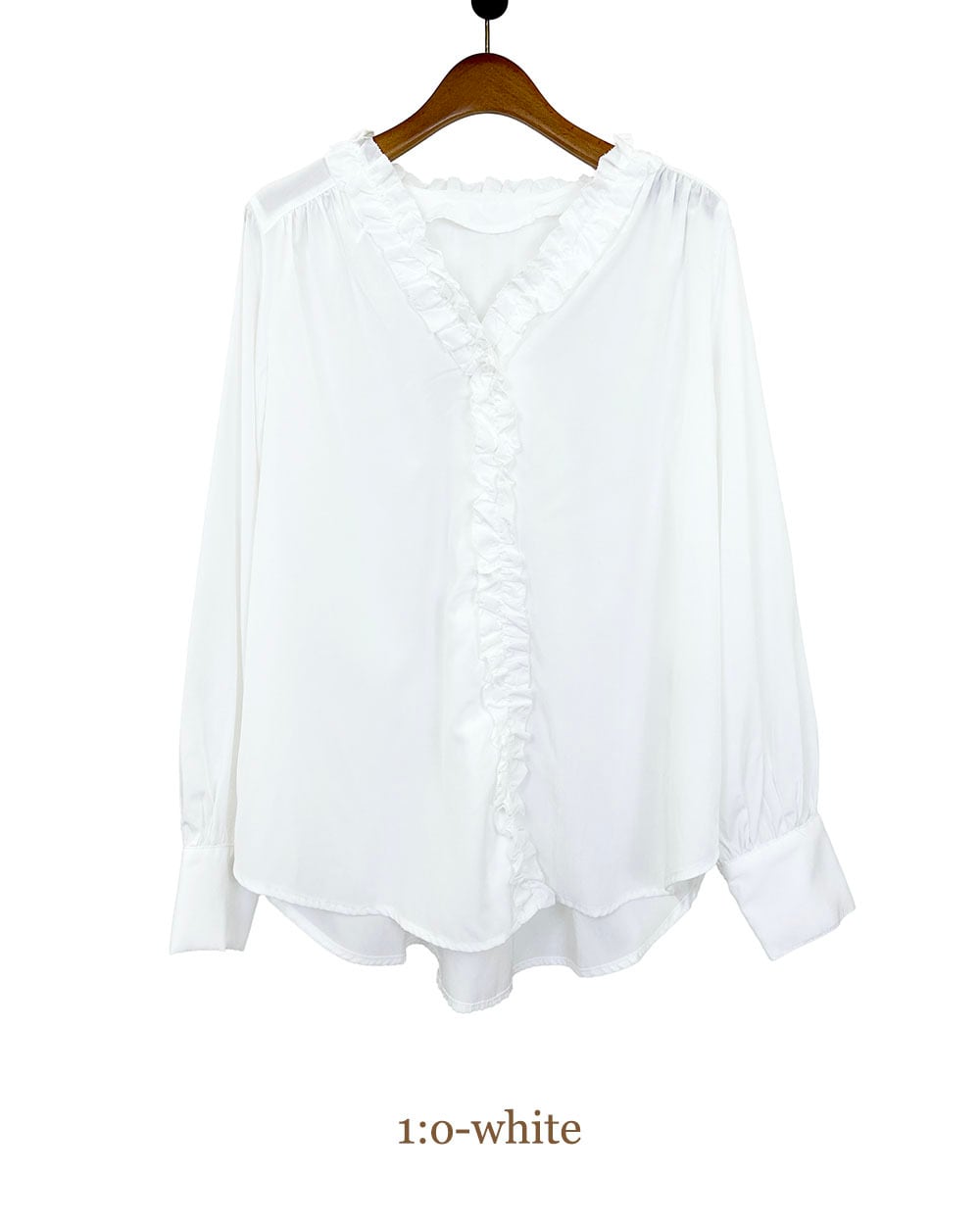 前立てから襟元にかけて、波打つようなラッフルフリルを贅沢にあしらいました。Vネックのラインに沿って施されたフリルが、首元をすっきりと見せつつ、エレガントで立体的な華やぎを演出します。ジャケットのインナーとしても映え、1枚で主役になるデザインです。