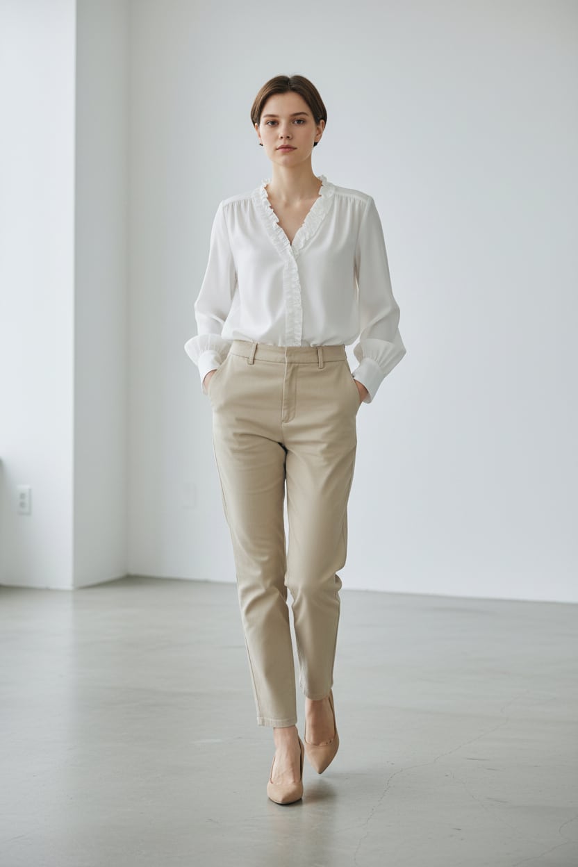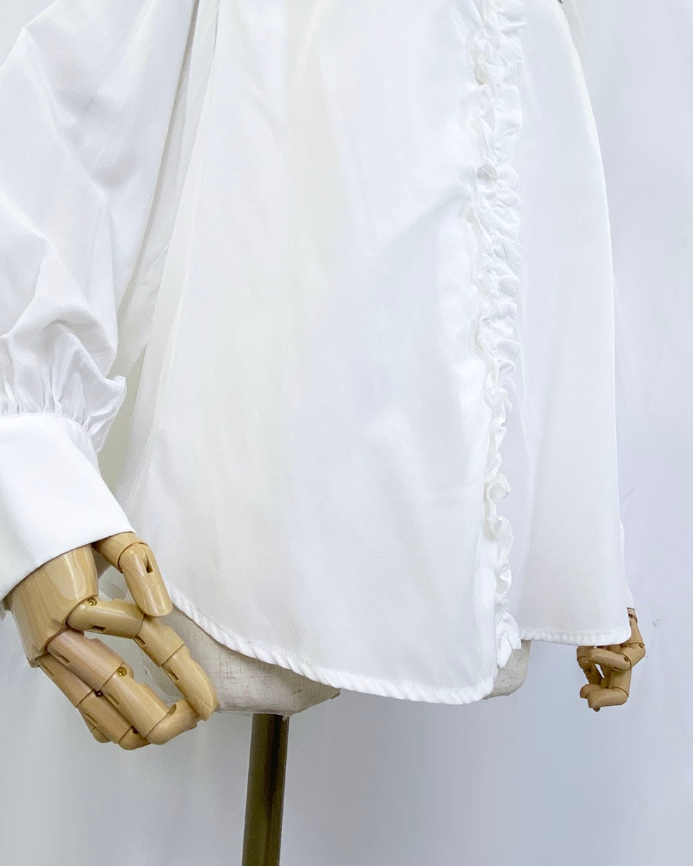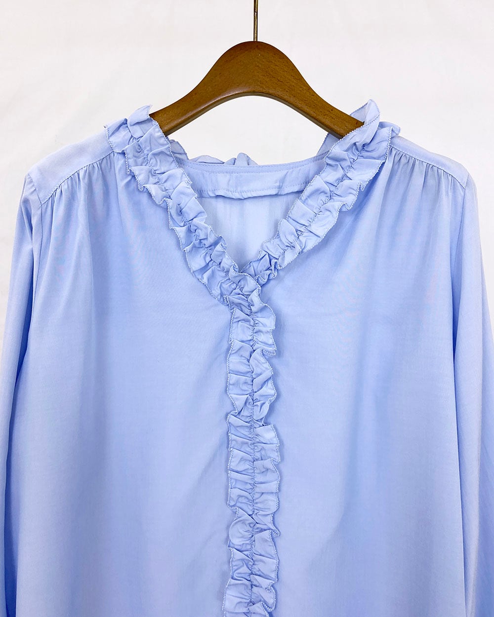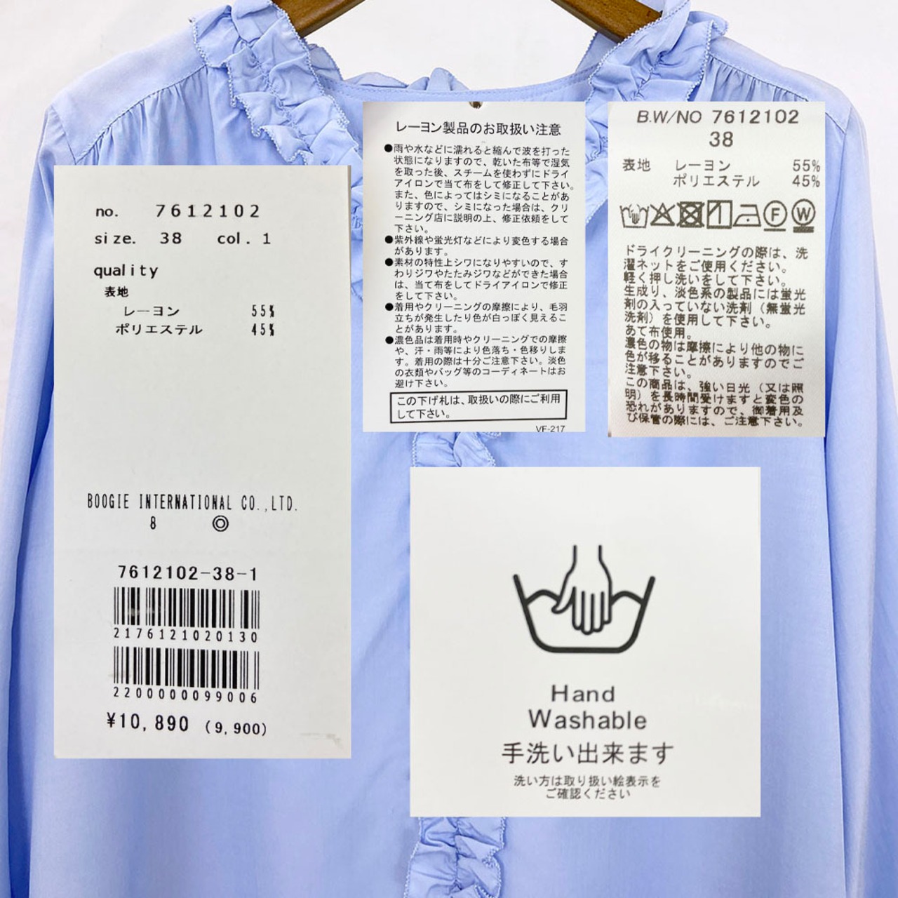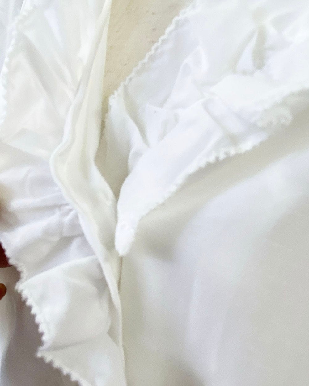 前立てから襟元にかけて、波打つようなラッフルフリルを贅沢にあしらいました。Vネックのラインに沿って施されたフリルが、首元をすっきりと見せつつ、エレガントで立体的な華やぎを演出します。ジャケットのインナーとしても映え、1枚で主役になるデザインです。