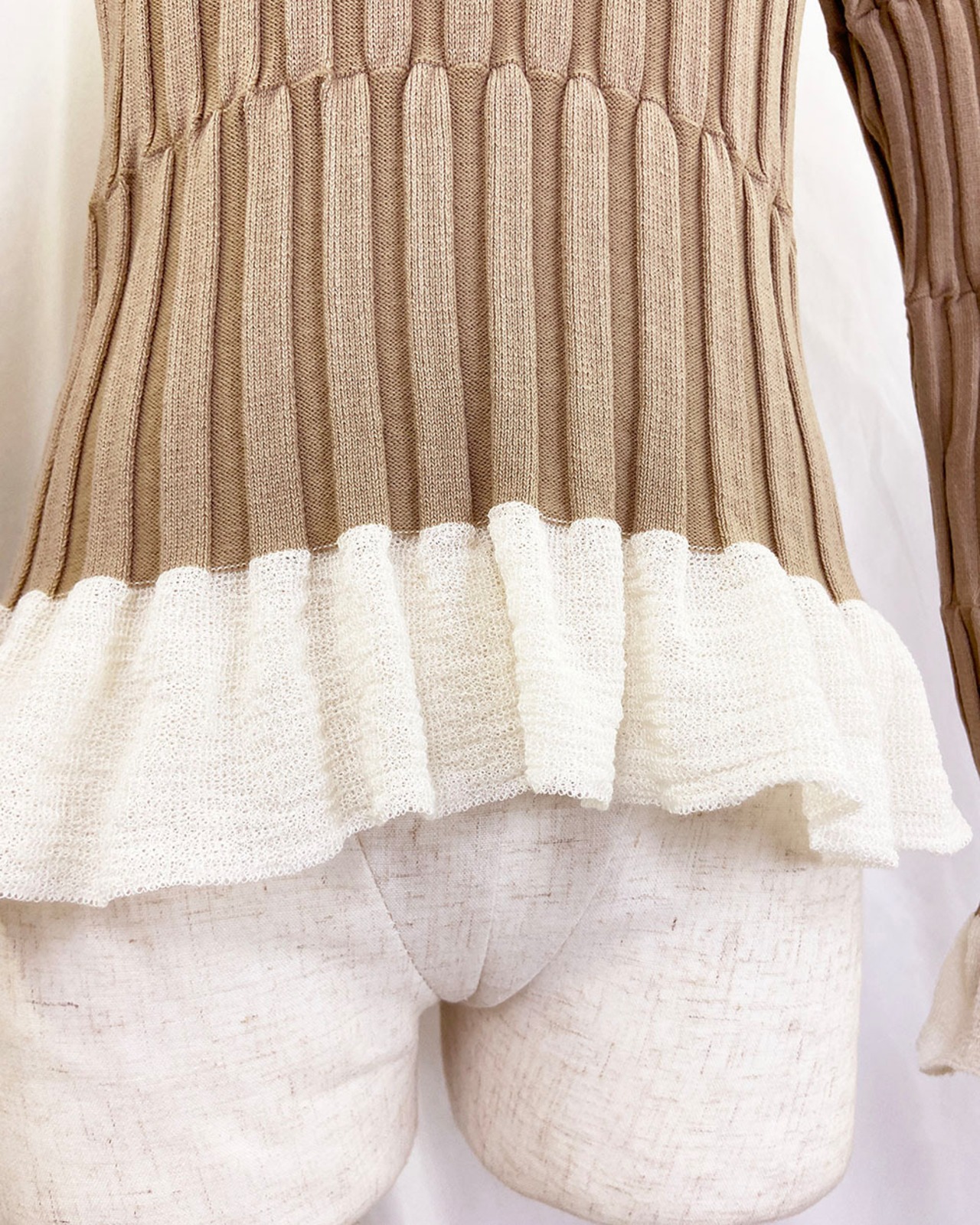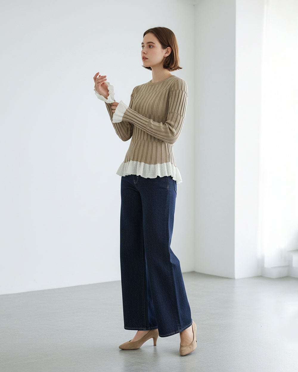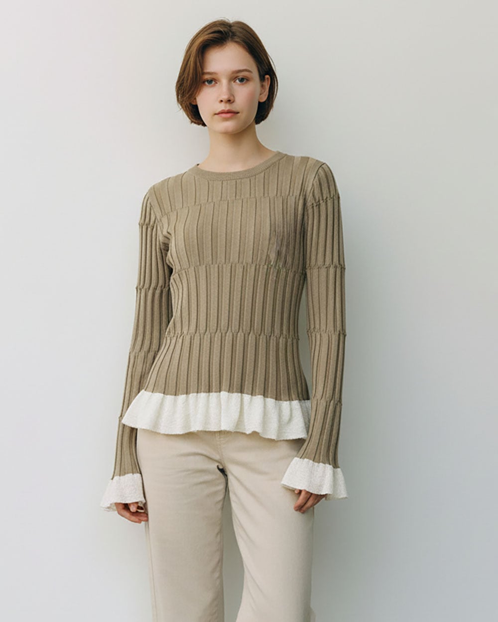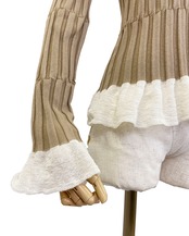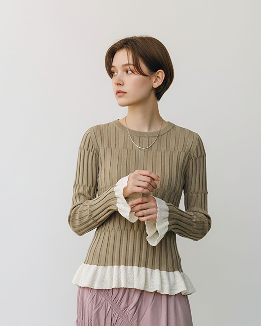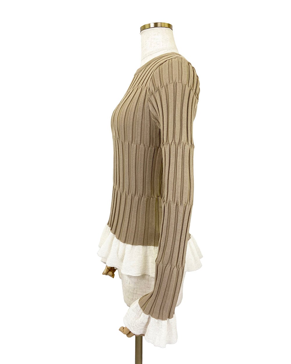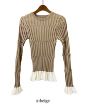 程よく体にフィットするシルエットで、女性らしいラインを美しく引き立てます。裾と袖口にはシアー素材のフリルを切り替え、軽やかで華やかなアクセントをプラス。シンプルながらもディテールにこだわったデザインで、1枚で着映えするアイテムです。