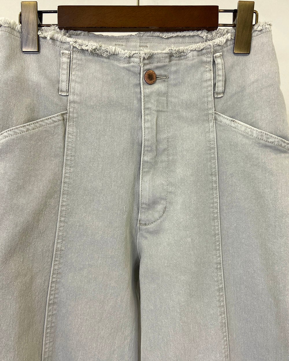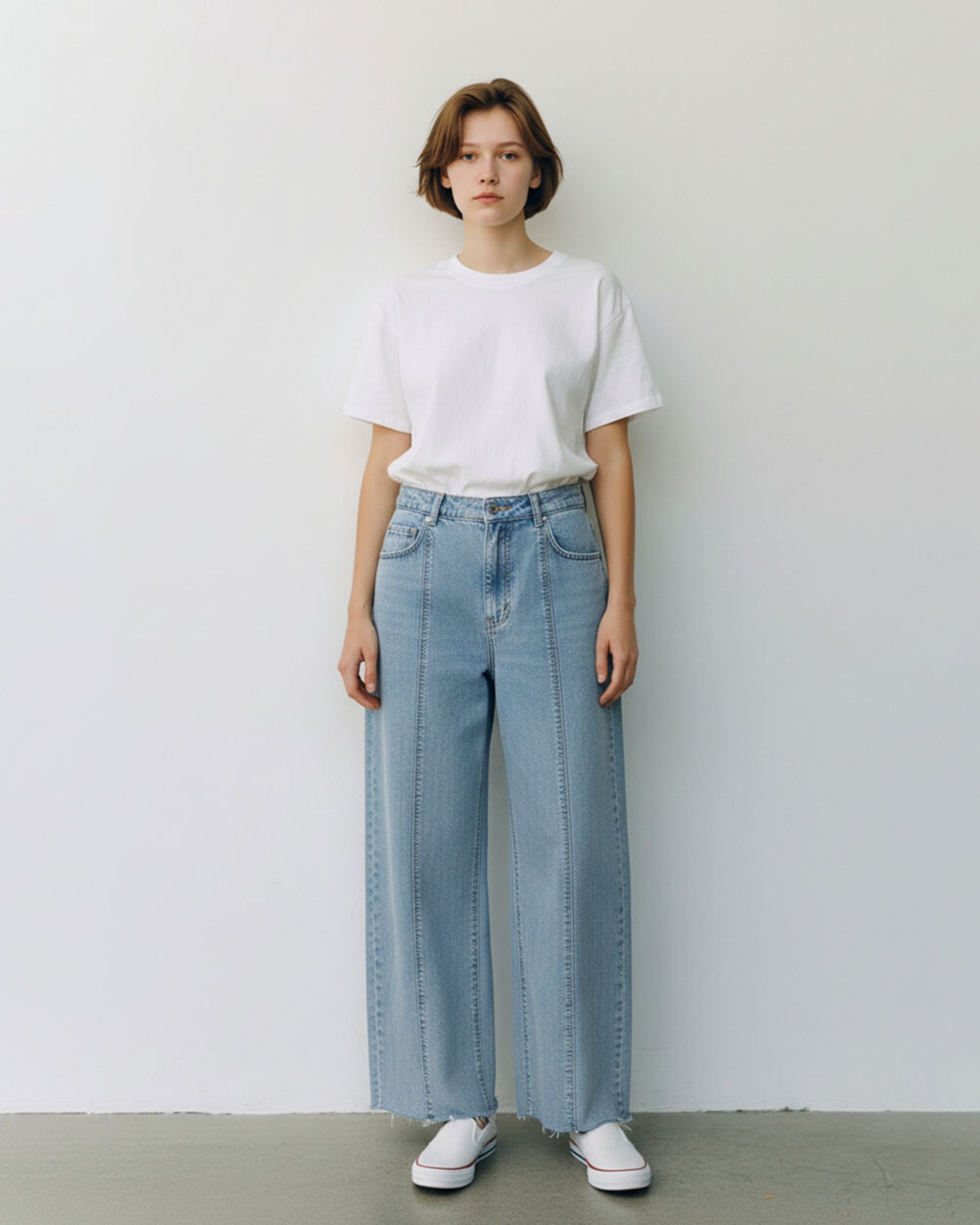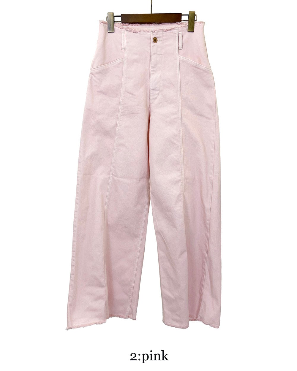 軽やかな穿き心地と程よいハリ感で、美しいシルエットをキープします。裾とウエストに施した切りっぱなしのディテールが、ラフで抜け感のある印象に。フロントの切り替えステッチがさりげないアクセントとなり、シンプルながらもこなれたデザインに仕上がっています。カジュアルにもきれいめにもマッチし、デイリーからお出かけまで幅広く活躍する万能アイテムです。