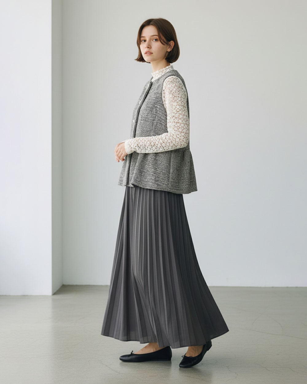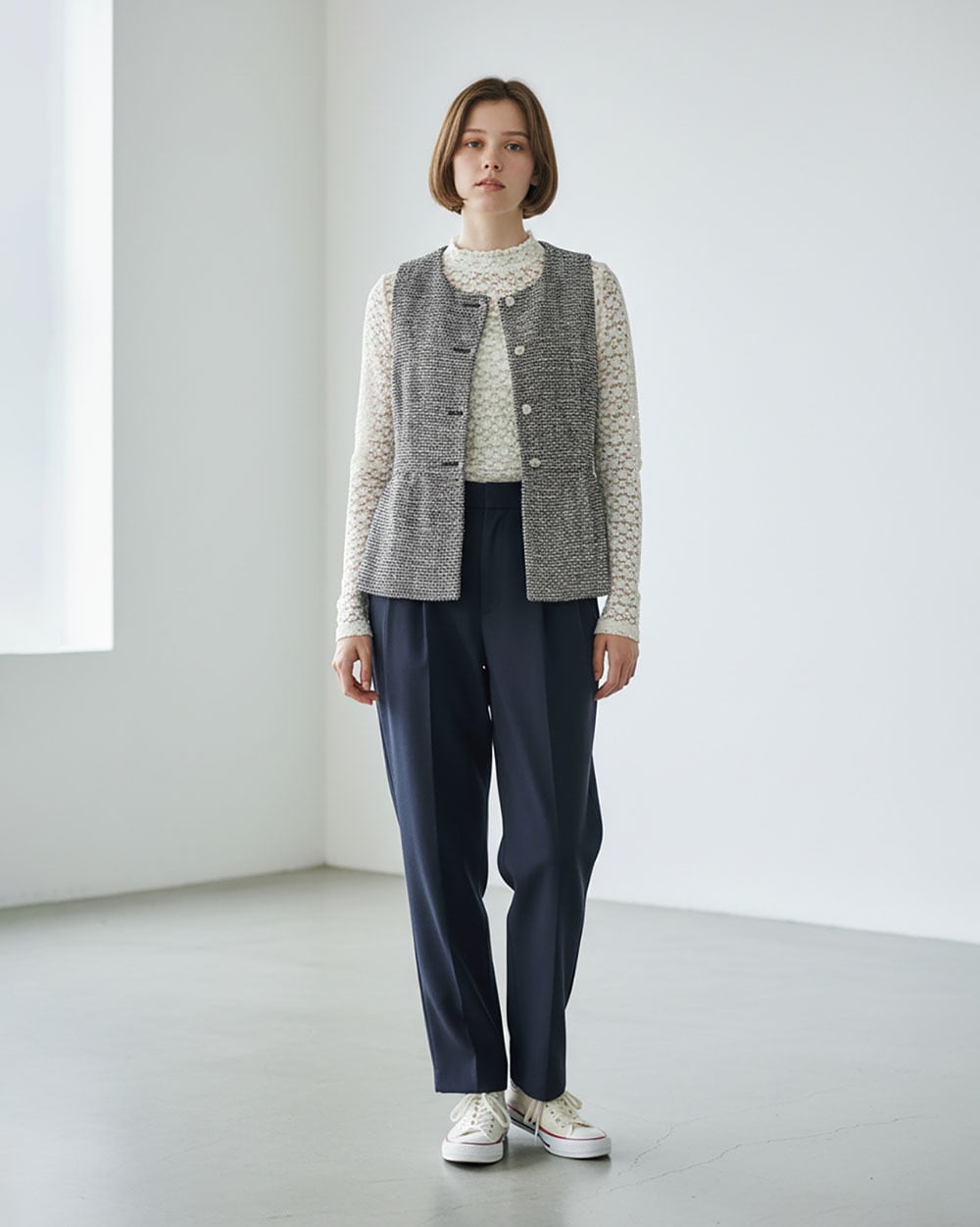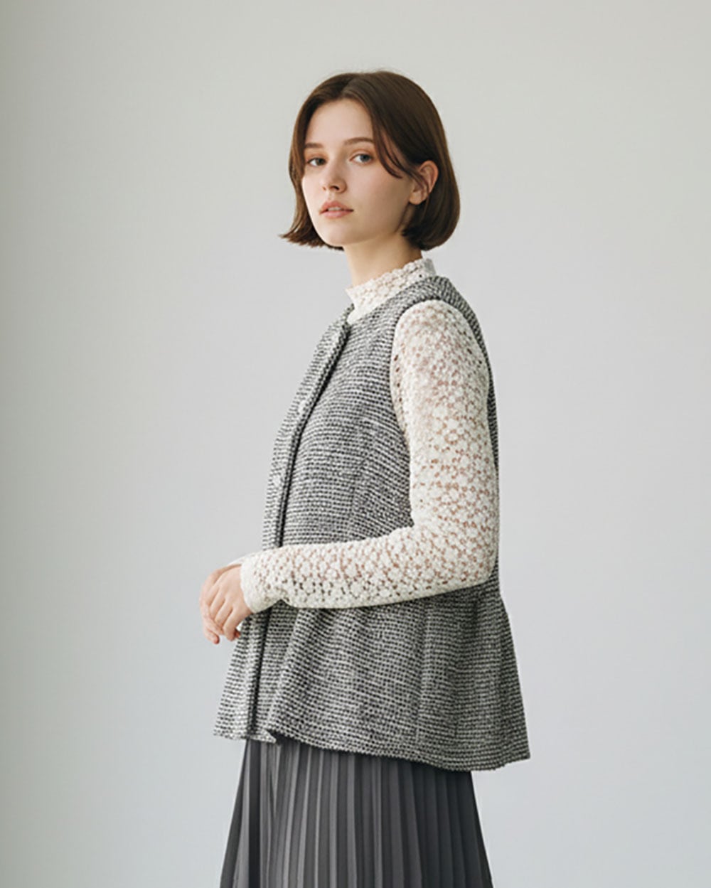 上品な表情のトライスピン杢ツイード生地を使用したペプラムジレ。立体感のあるツイード素材が華やかさを演出し、シンプルなコーディネートにプラスするだけで洗練された印象に。ウエストラインを美しく見せるペプラムシルエットが、女性らしさを引き立てます。ブラウスやカットソー、ワンピースとのレイヤードにも最適で、オン・オフ問わず活躍する一枚です。