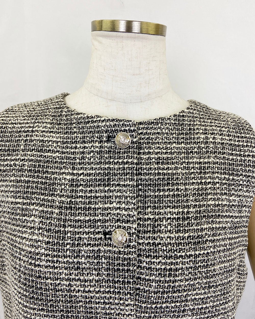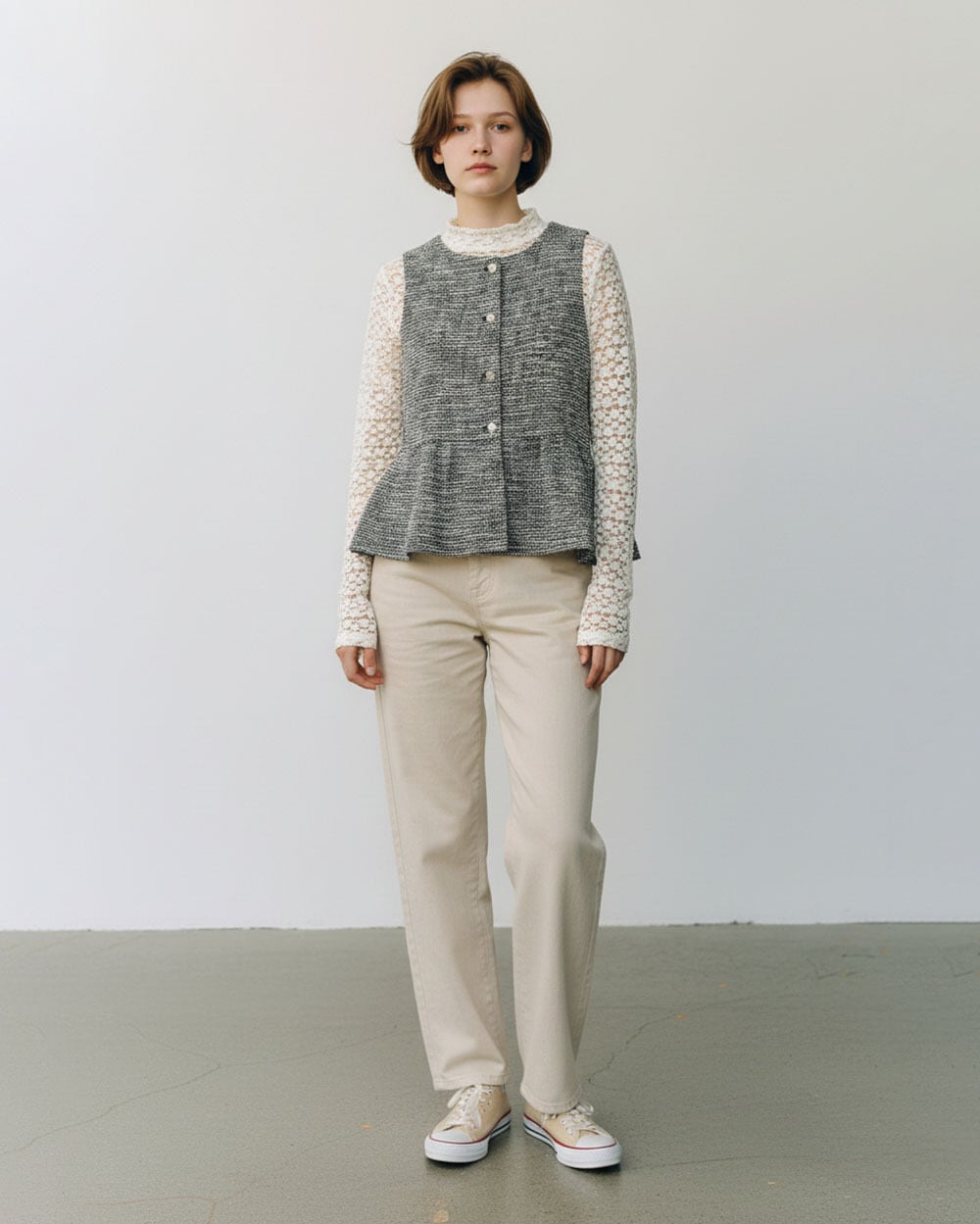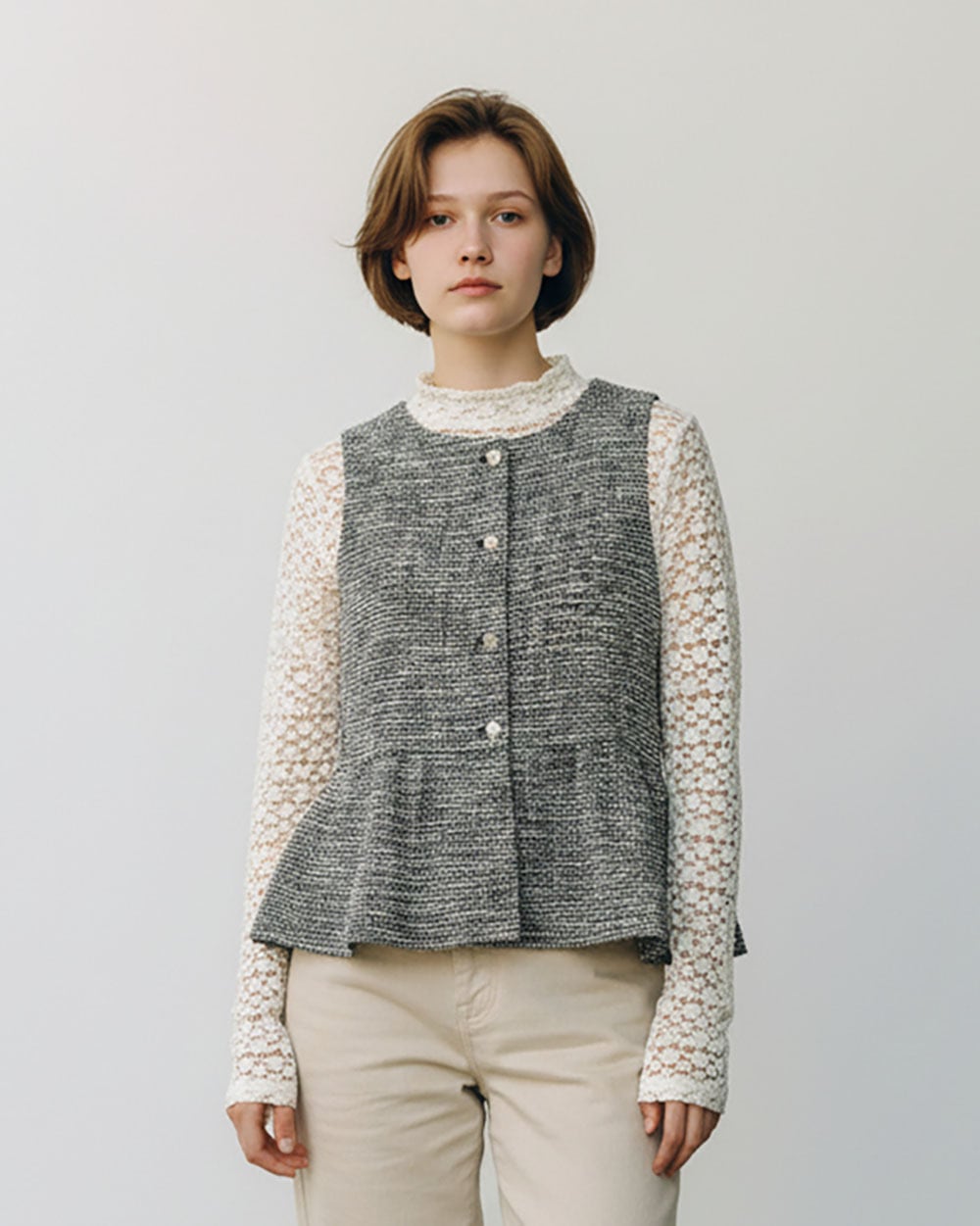 上品な表情のトライスピン杢ツイード生地を使用したペプラムジレ。立体感のあるツイード素材が華やかさを演出し、シンプルなコーディネートにプラスするだけで洗練された印象に。ウエストラインを美しく見せるペプラムシルエットが、女性らしさを引き立てます。ブラウスやカットソー、ワンピースとのレイヤードにも最適で、オン・オフ問わず活躍する一枚です。