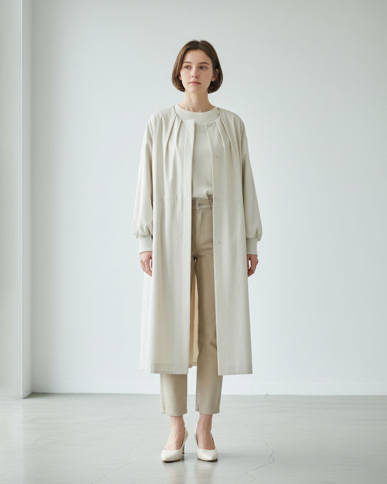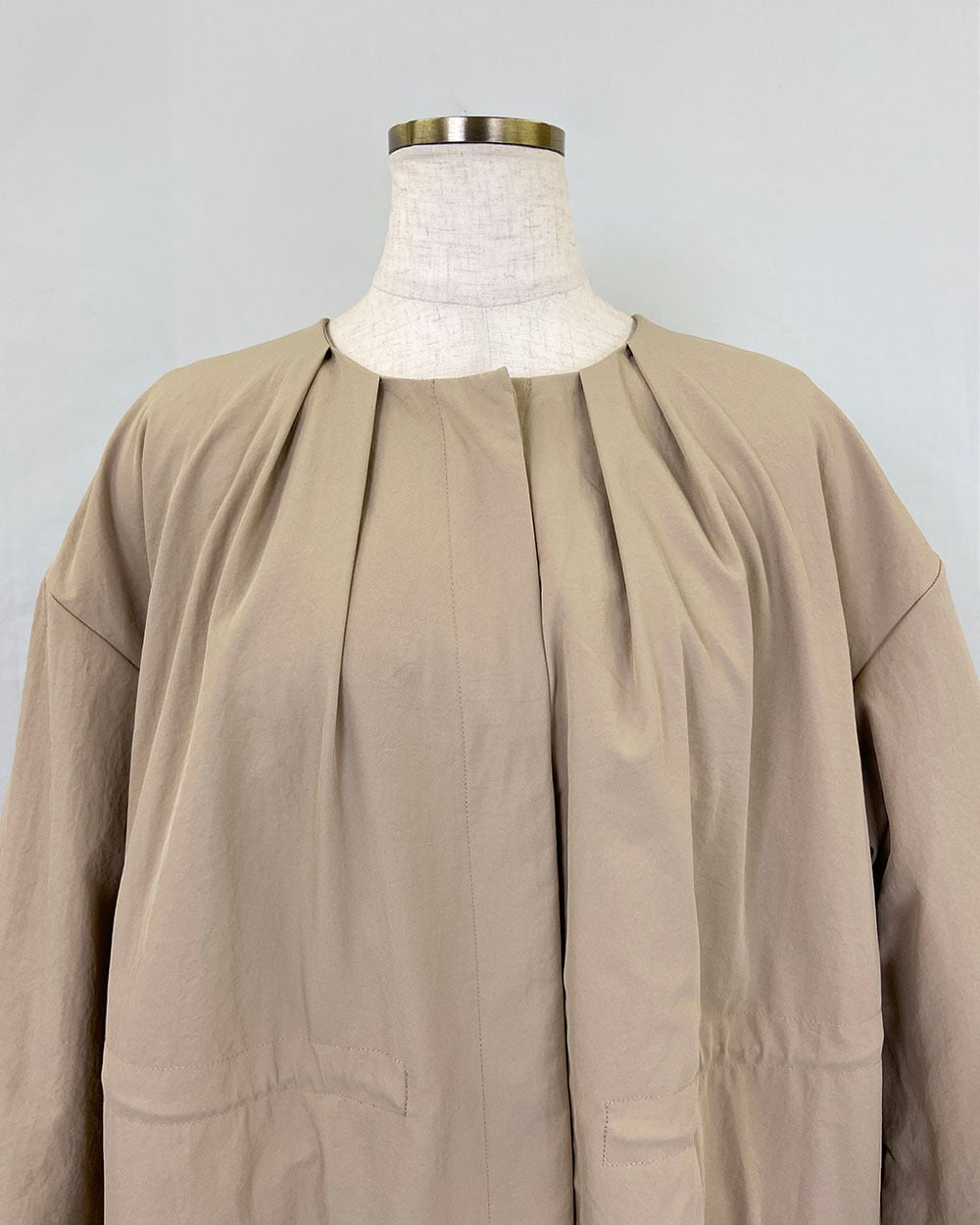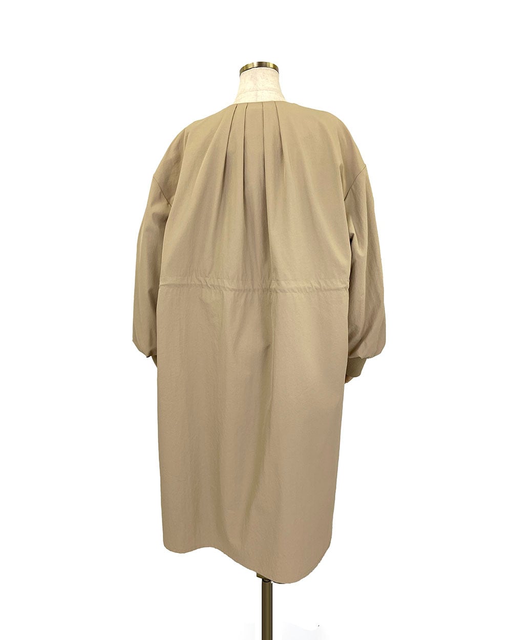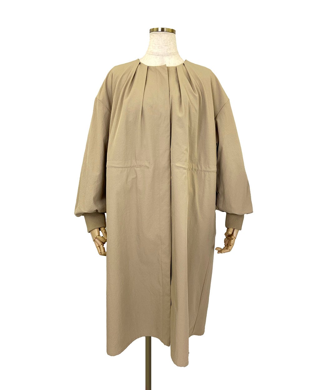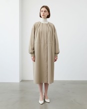 マットな質感と程よいハリ感が魅力のフェルムツイル生地を使用したクルーネックロングコート。ネックラインの前後に放射線状に入ったタックが、立体的で優美なシルエットを生み出します。ウエストにはドロスト仕様を施し、シルエットの調整が可能。袖口には長めのリブを配し、程よいフィット感と抜け感をプラス。軽やかでありながら存在感のあるデザインで、春先のアウターとして活躍する一枚です。
