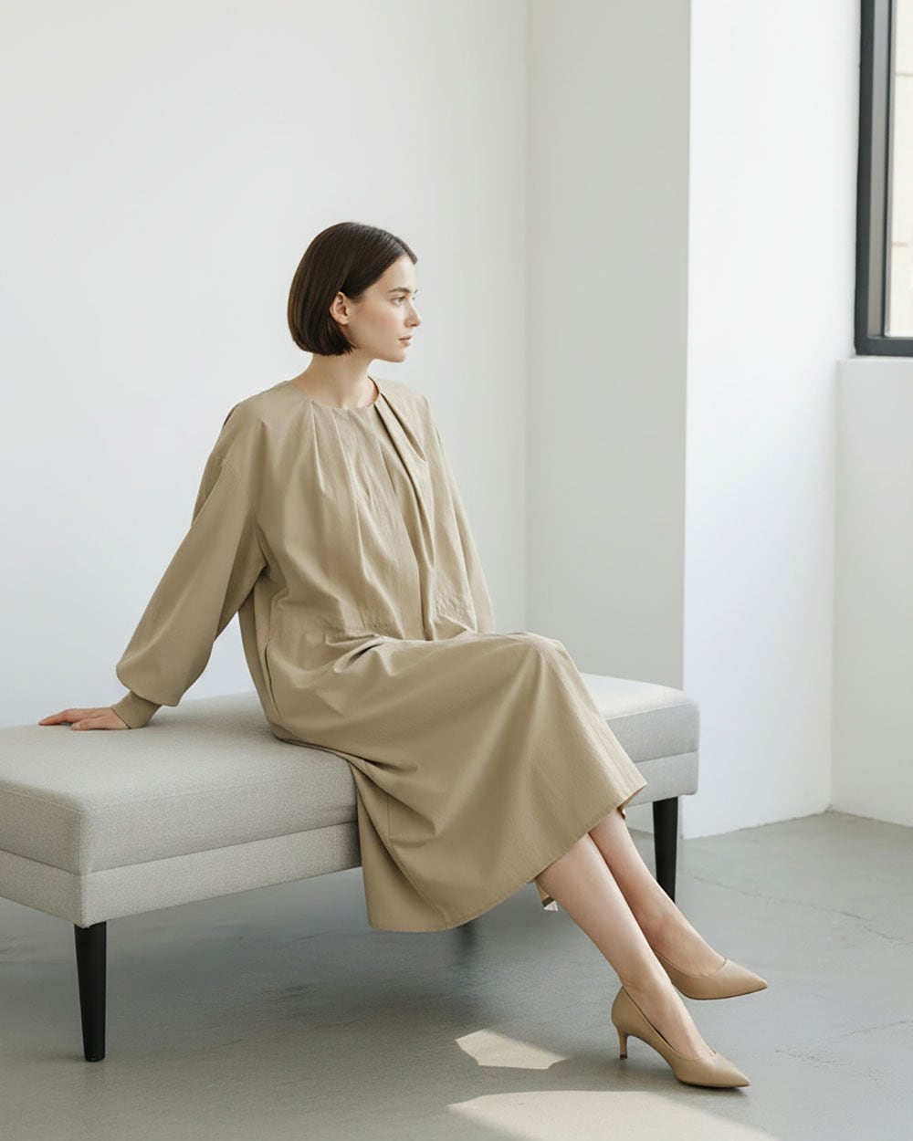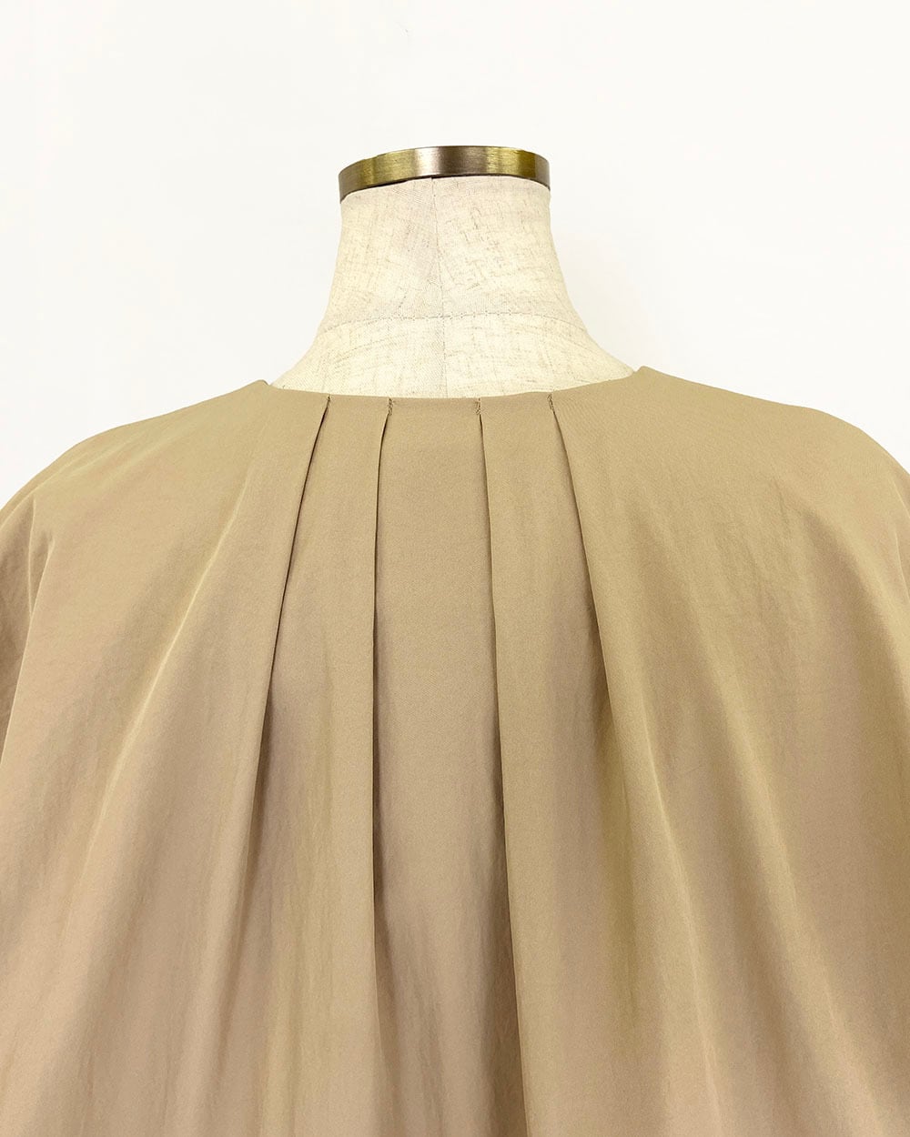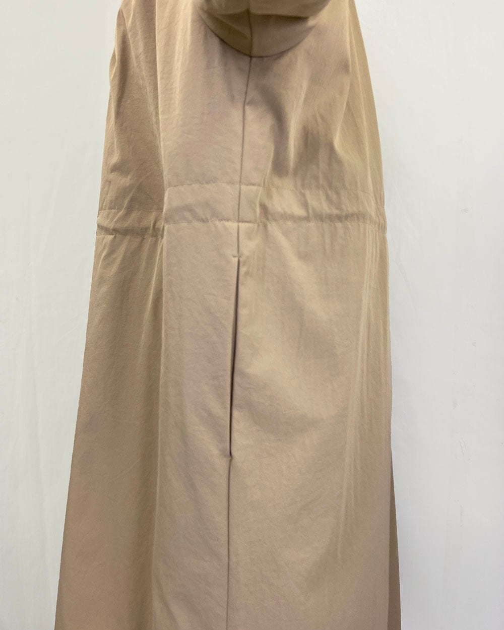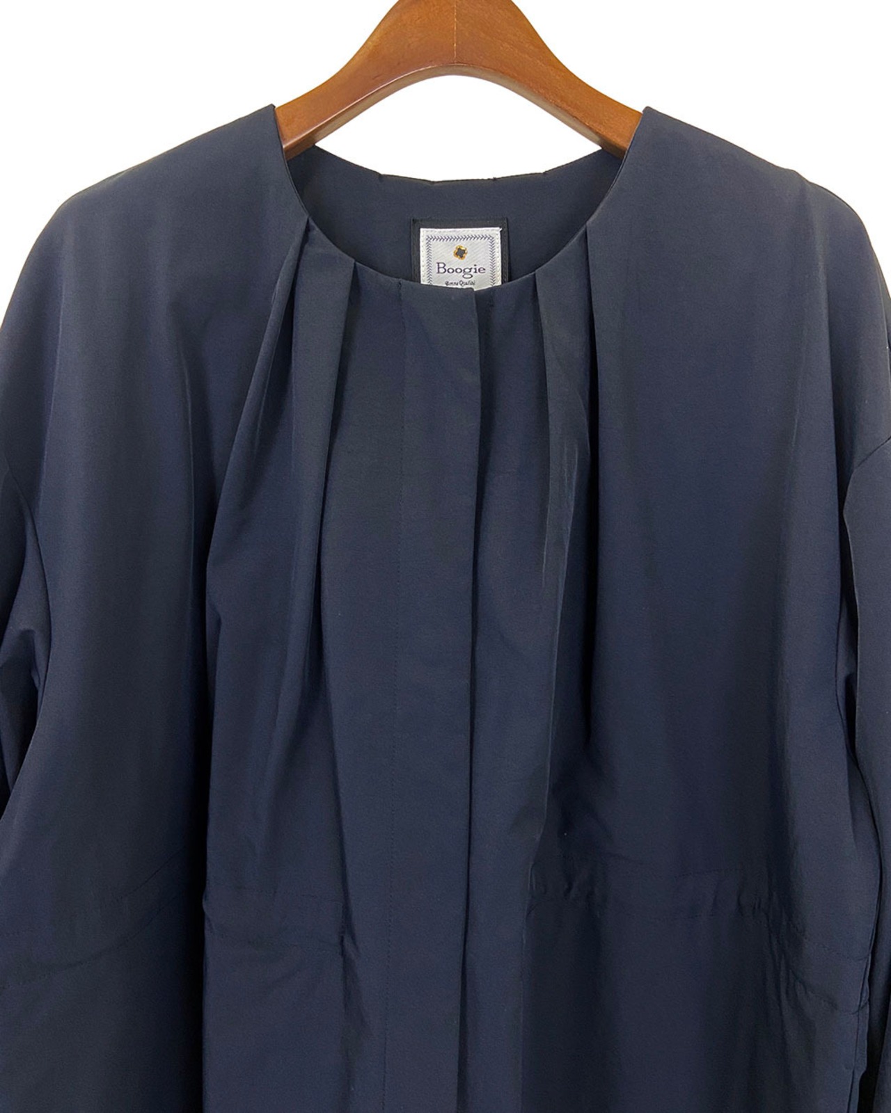 マットな質感と程よいハリ感が魅力のフェルムツイル生地を使用したクルーネックロングコート。ネックラインの前後に放射線状に入ったタックが、立体的で優美なシルエットを生み出します。ウエストにはドロスト仕様を施し、シルエットの調整が可能。袖口には長めのリブを配し、程よいフィット感と抜け感をプラス。軽やかでありながら存在感のあるデザインで、春先のアウターとして活躍する一枚です。