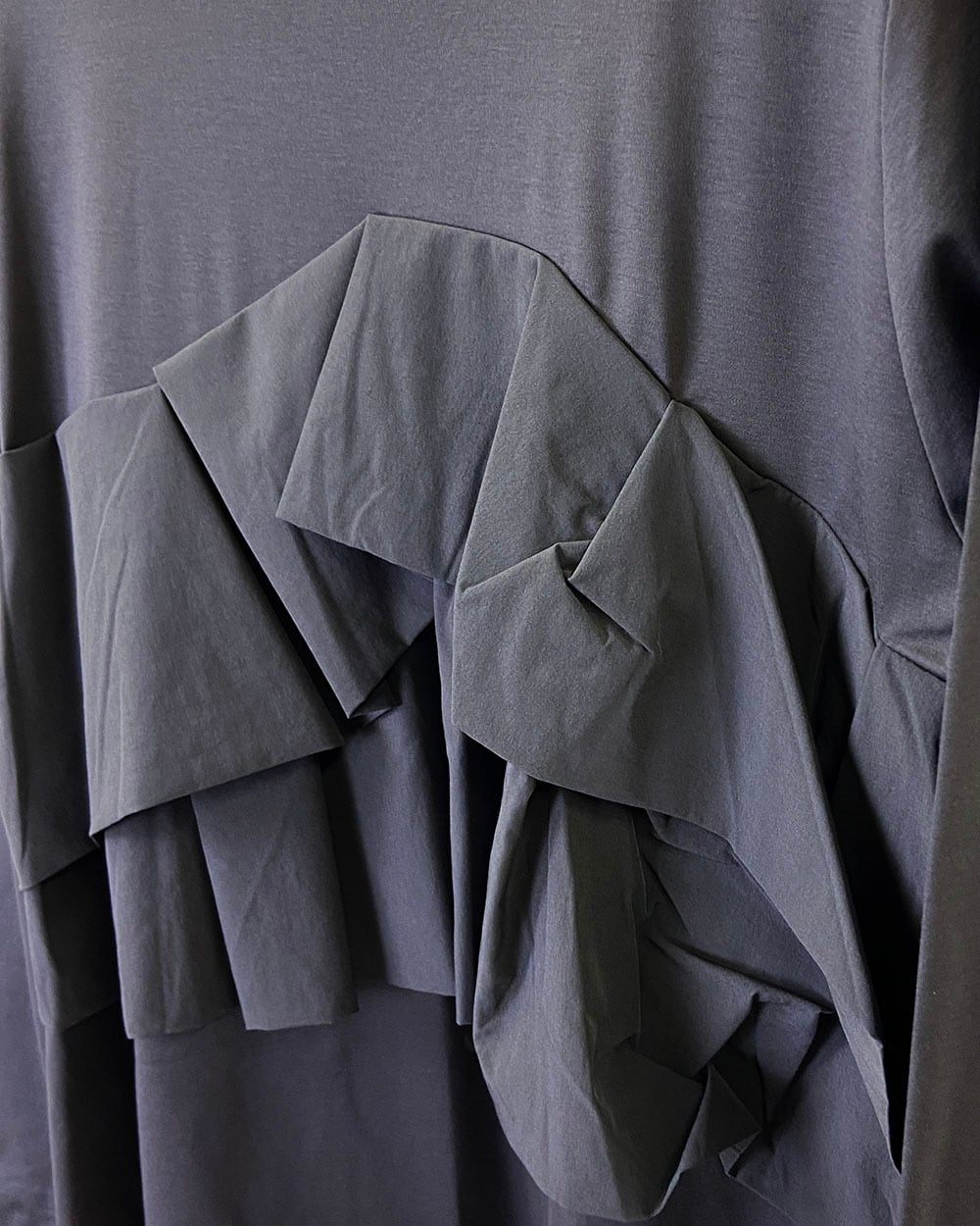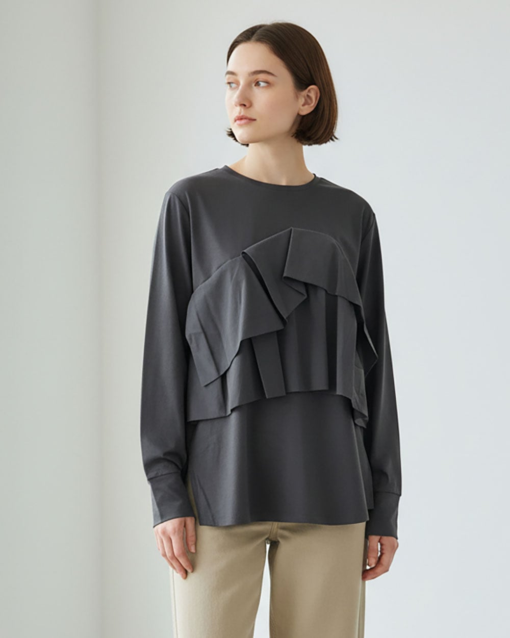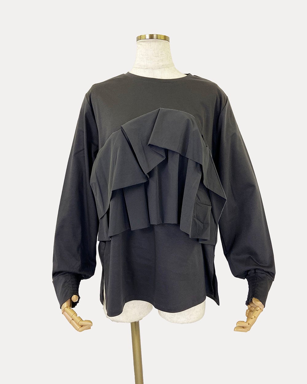 毛羽立ちの少ないコンパクト糸で編み立てられ、目の詰まった美しい表面感とさらっとした着心地が特徴です。フロントにはティアード状に重ねた異素材フリルをあしらい、華やかでフェミニンな印象に。袖口下部にはゴムシャーリングを施し、ふんわりとしたシルエットを演出。クルーネックデザインで顔まわりをすっきり見せてくれます。