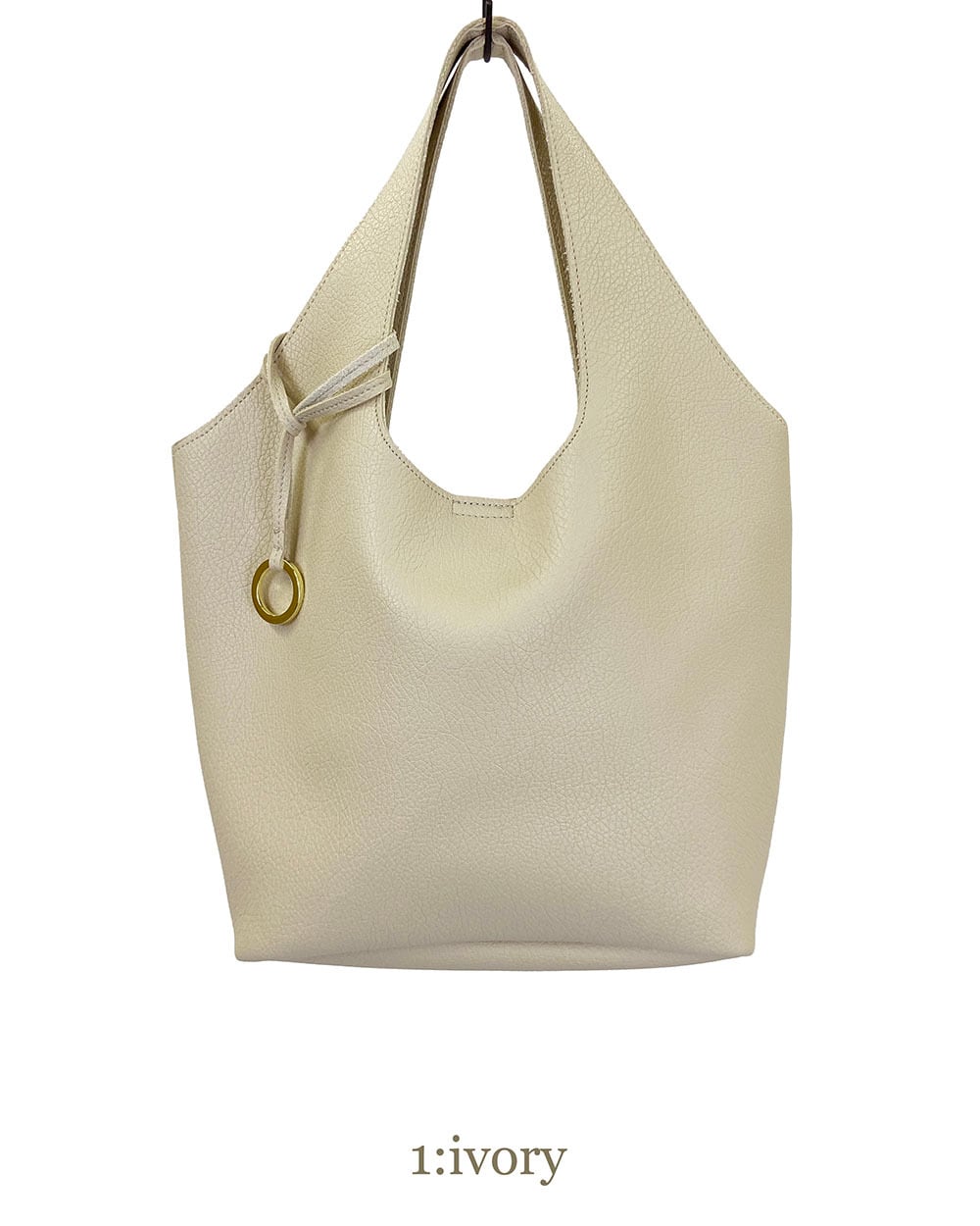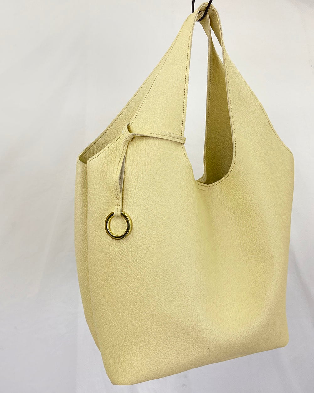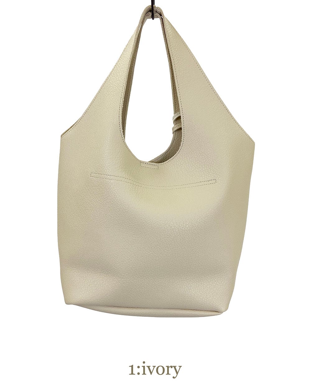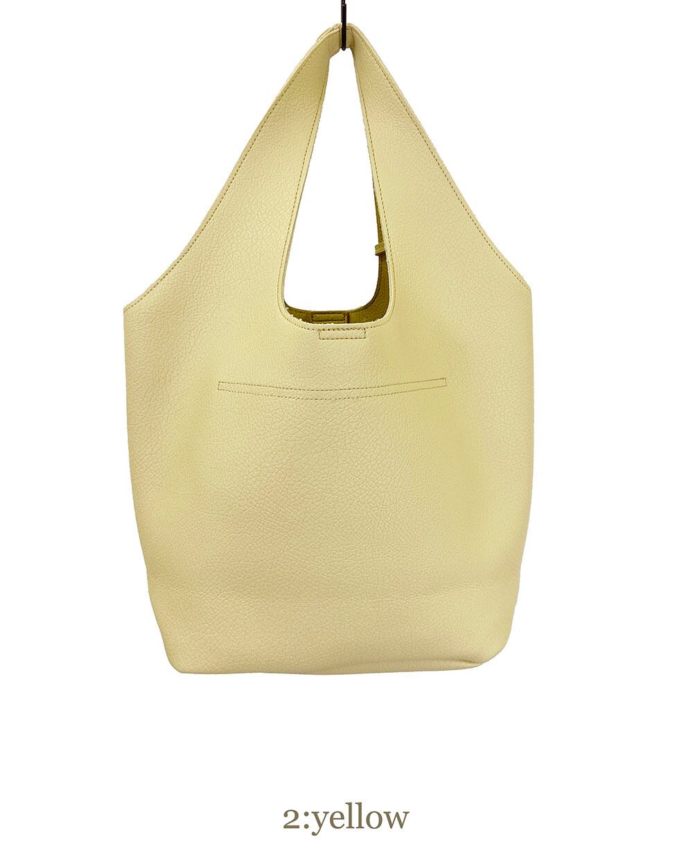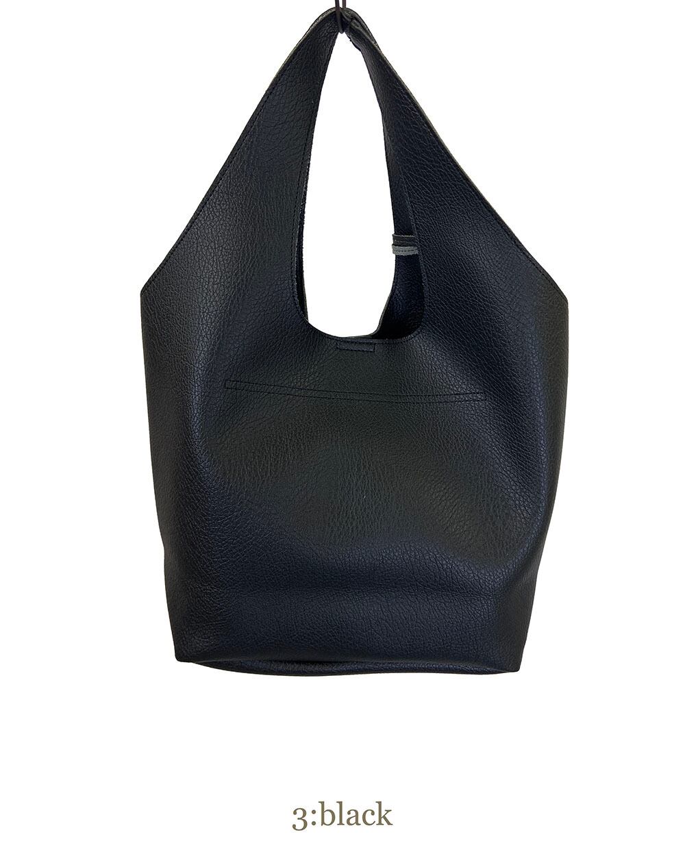 ソフトフェイクレザーを1枚仕立てで使用した、すっきりとした印象のくり手トートバッグ。