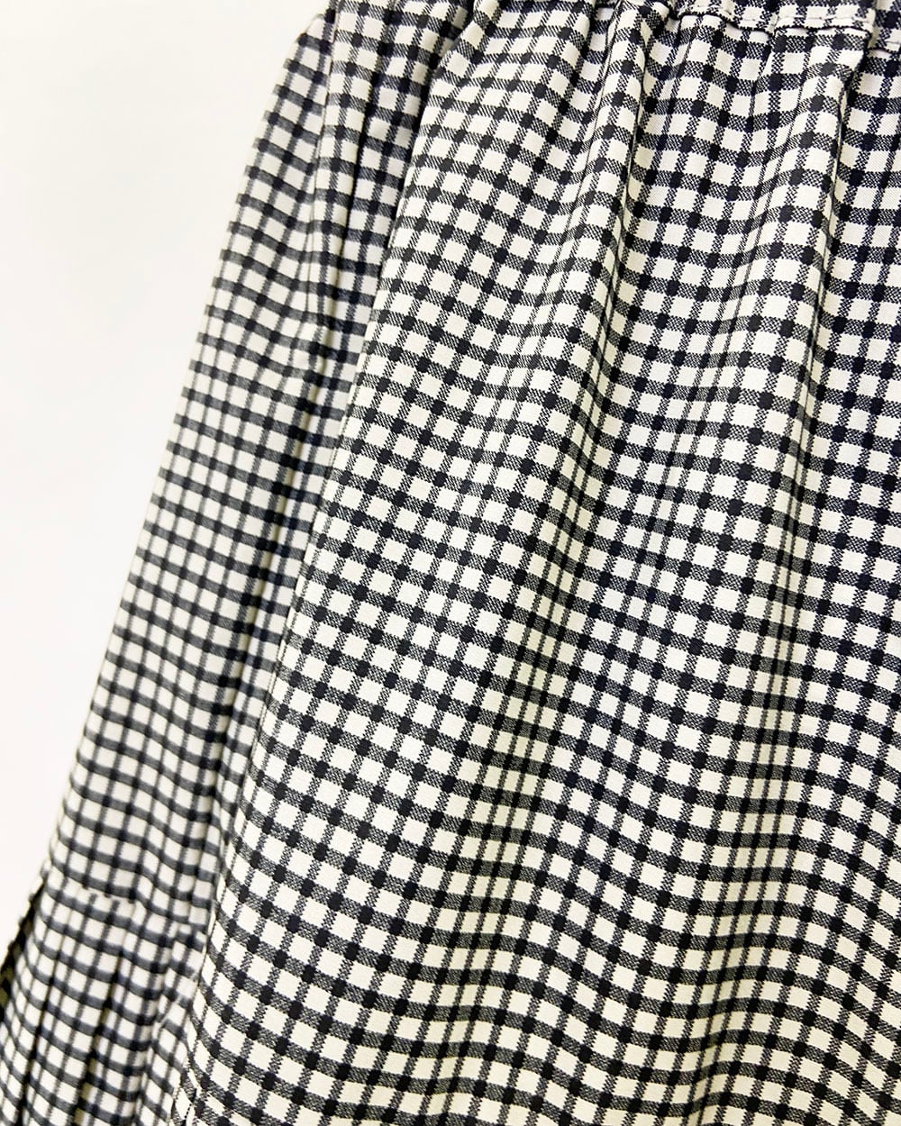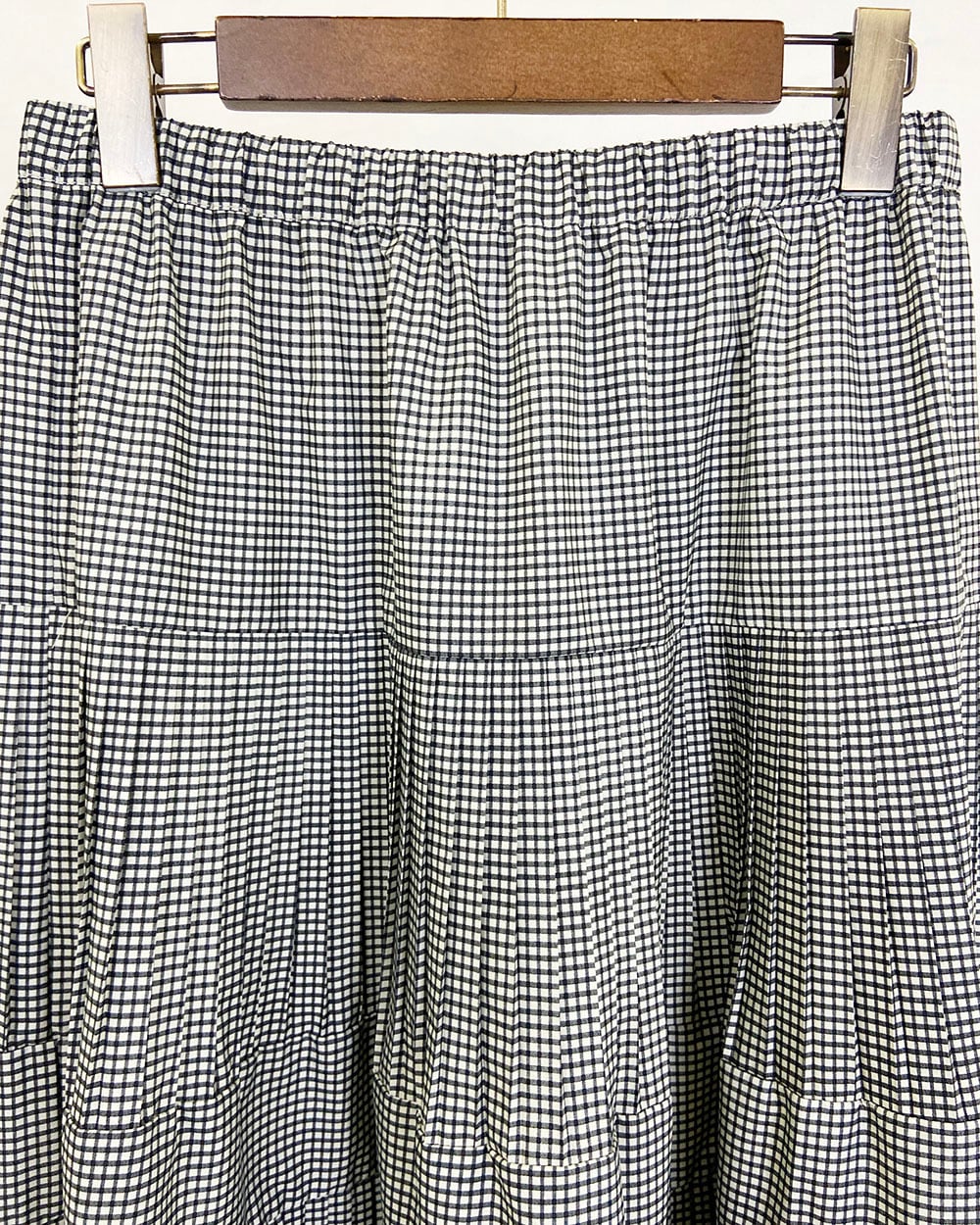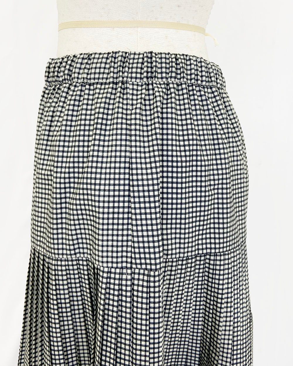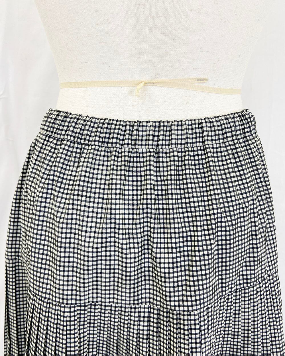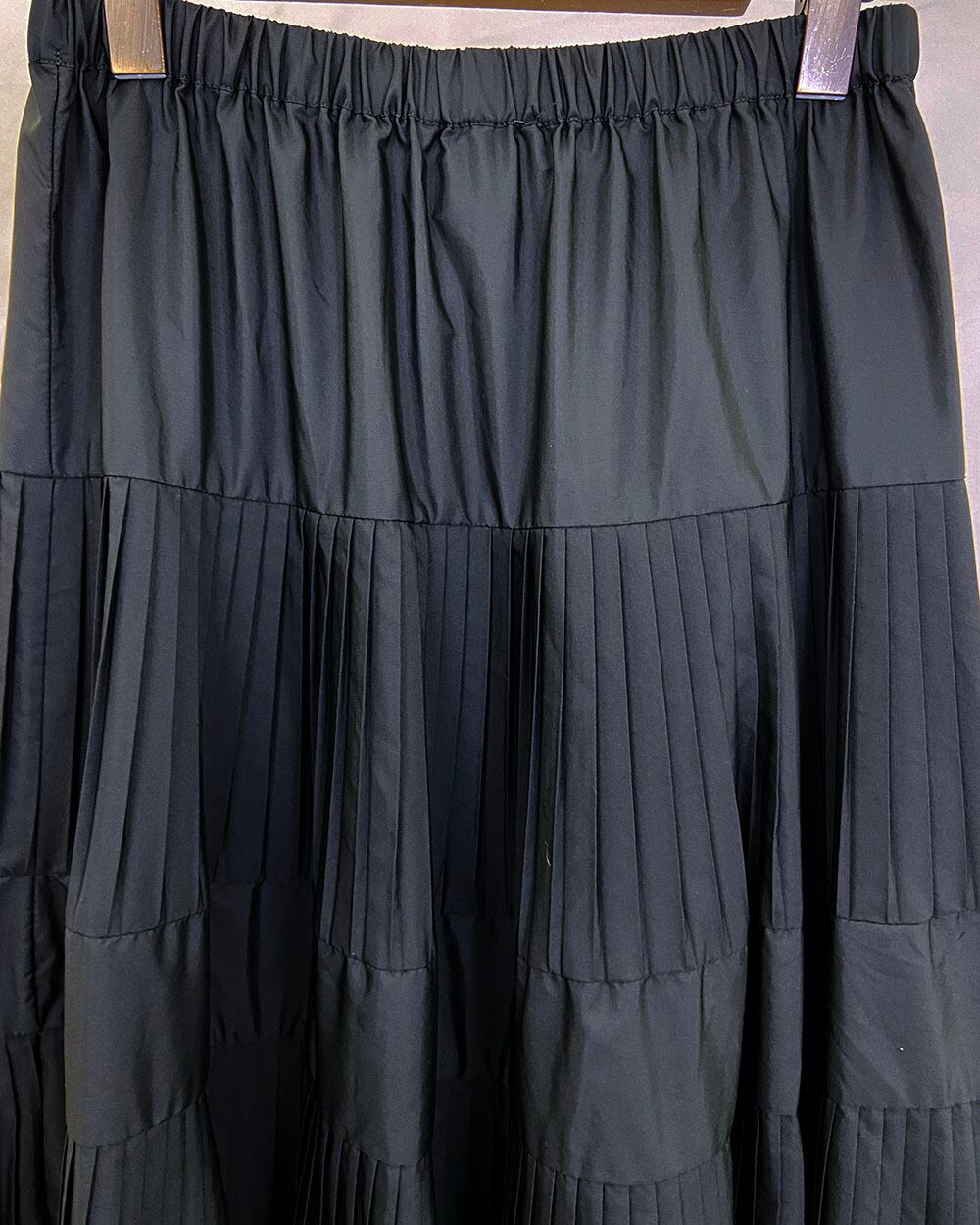 3段のプリーツが生み出す立体感と、広がりすぎないティアードデザインが上品な印象を演出します。ウエストは総ゴム仕様で、内側にはフィット感を調整できるドロスト紐付き。