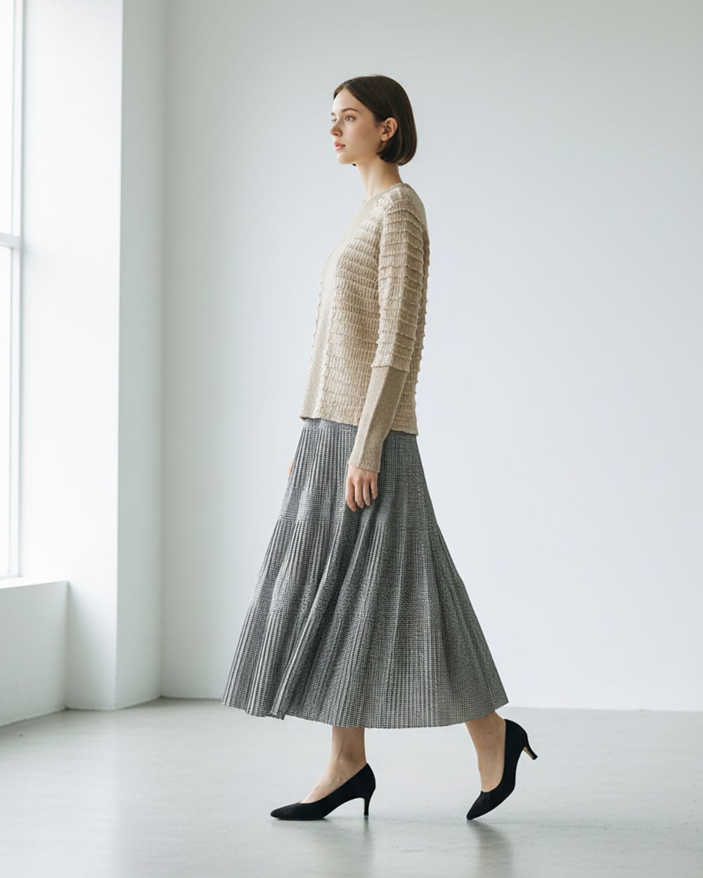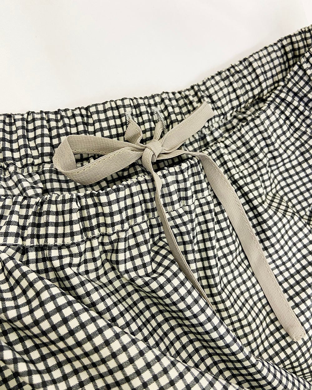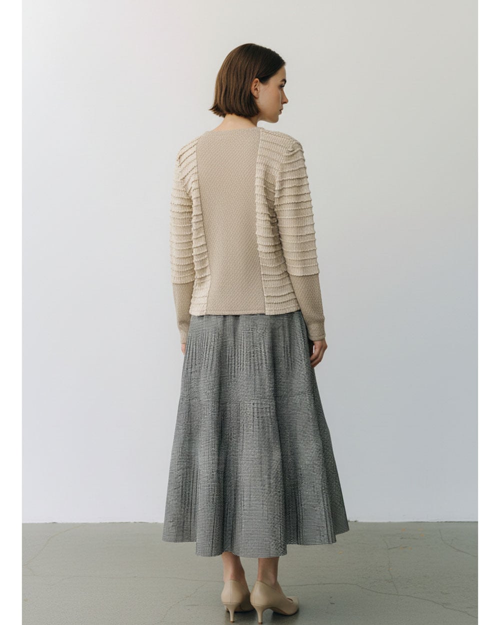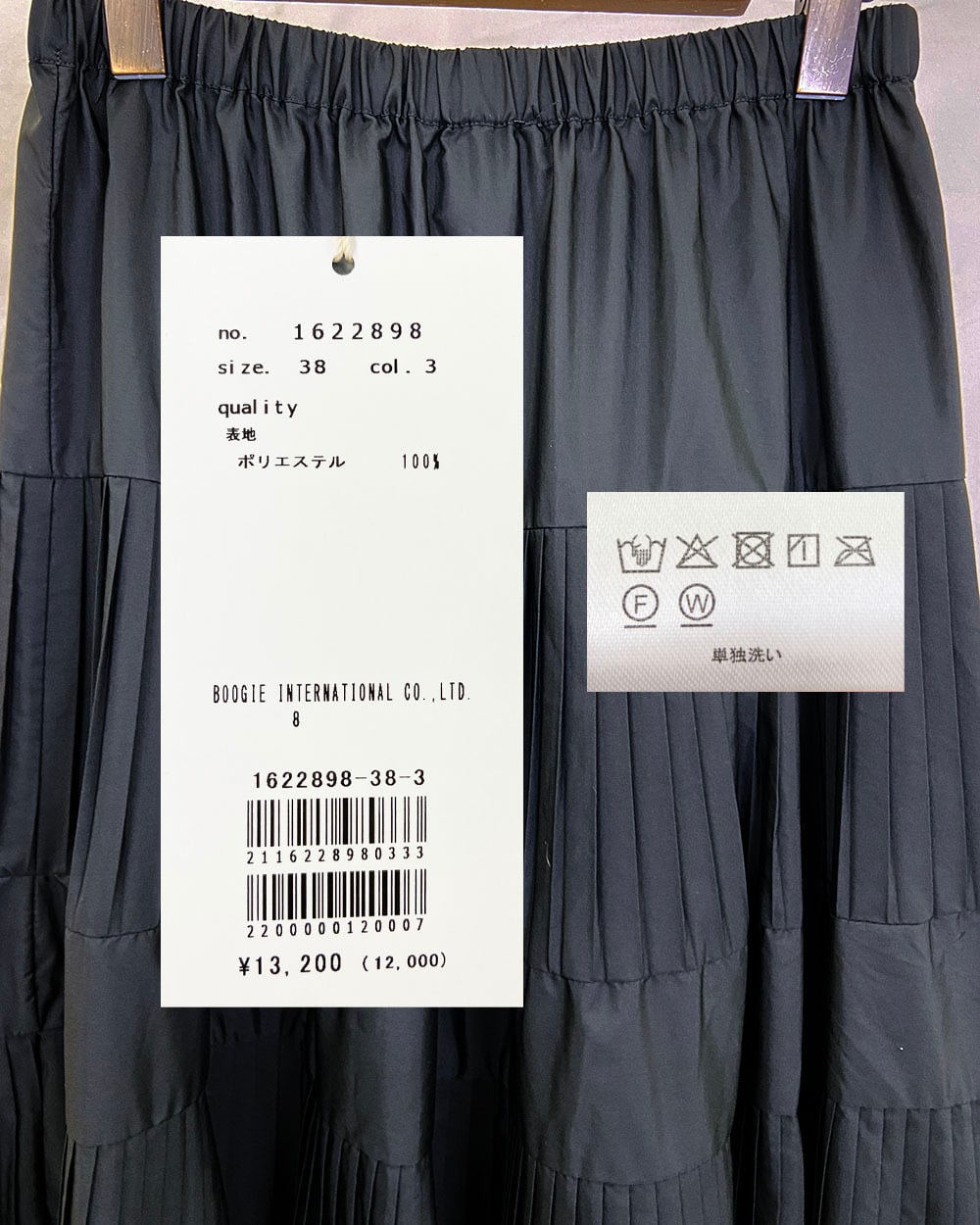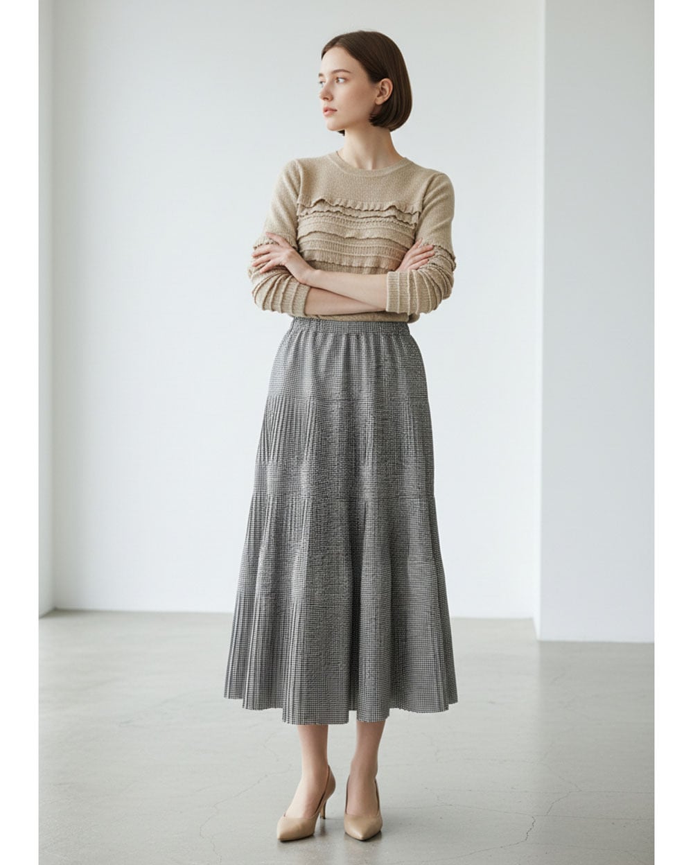 3段のプリーツが生み出す立体感と、広がりすぎないティアードデザインが上品な印象を演出します。ウエストは総ゴム仕様で、内側にはフィット感を調整できるドロスト紐付き。