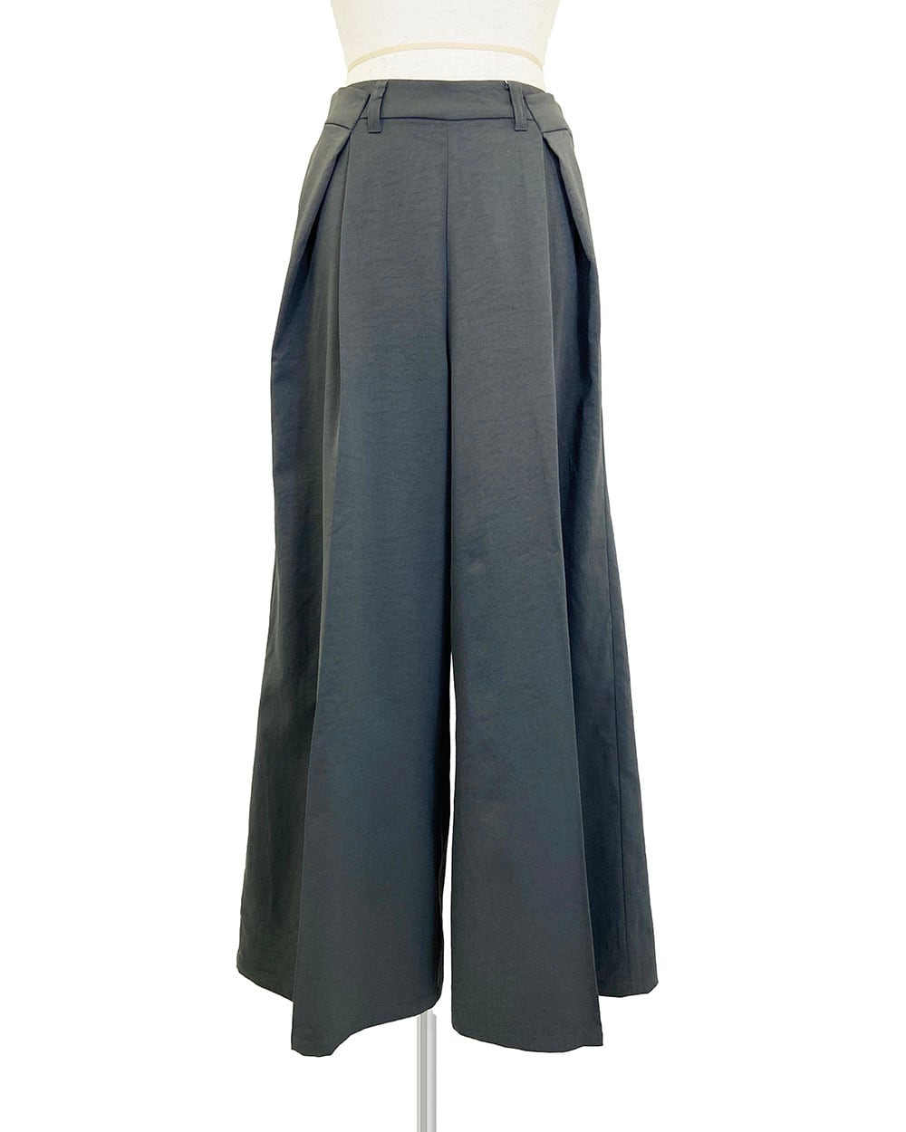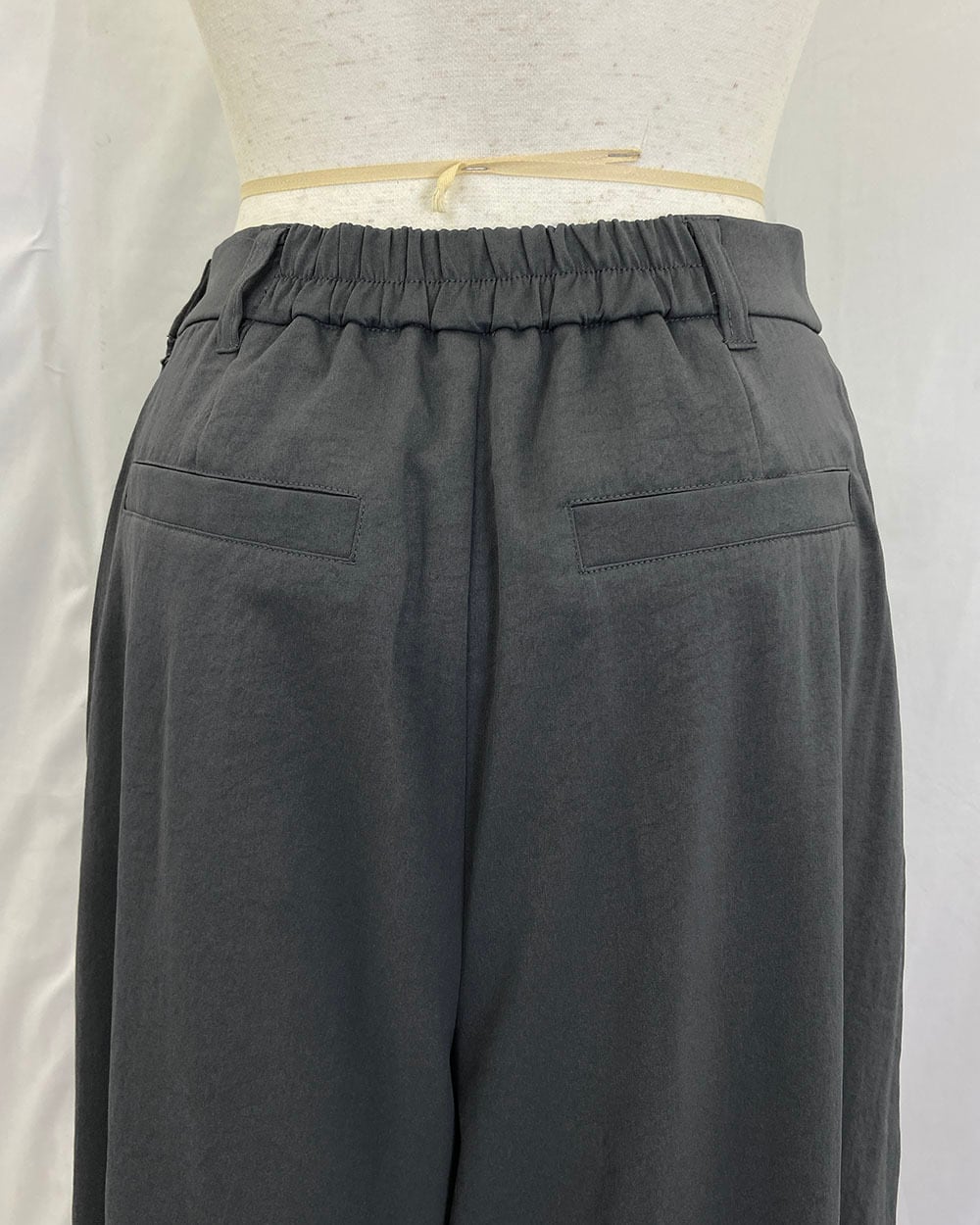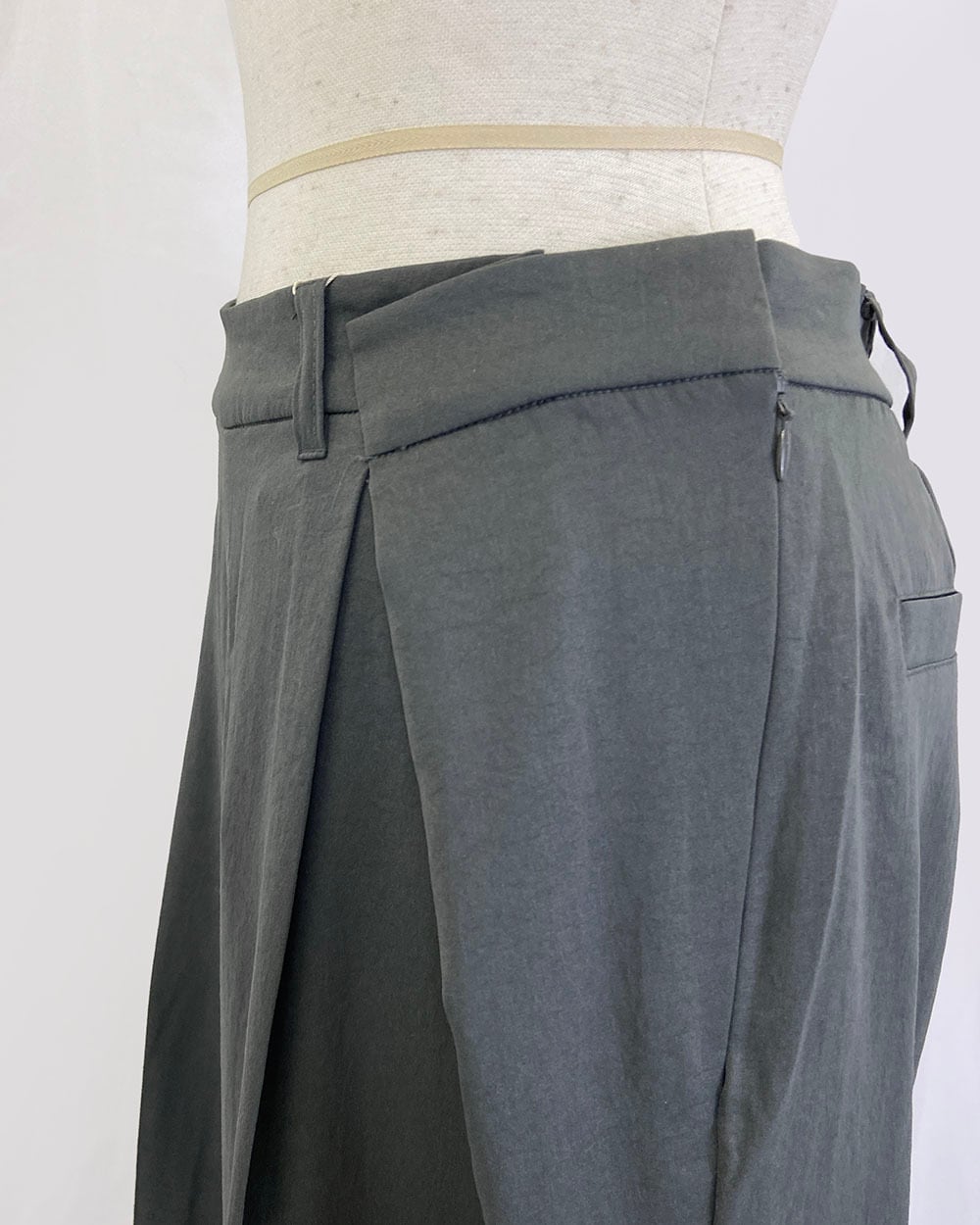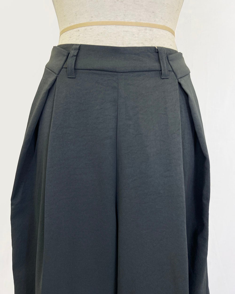 サイドに入ったタックと、段違いになったウエストベルトのディティールがモードな印象を演出します。センタープレスが脚のラインをすっきりと見せ、上品さと抜け感を両立。シンプルなTシャツを合わせて、抜け感のある大人カジュアルに。シャツやブラウスをインすれば、オフィスにも対応できるきれいめスタイルに。ショート丈トップスやジャケットを合わせて、ウエストデザインを引き立てたコーデもおすすめ。