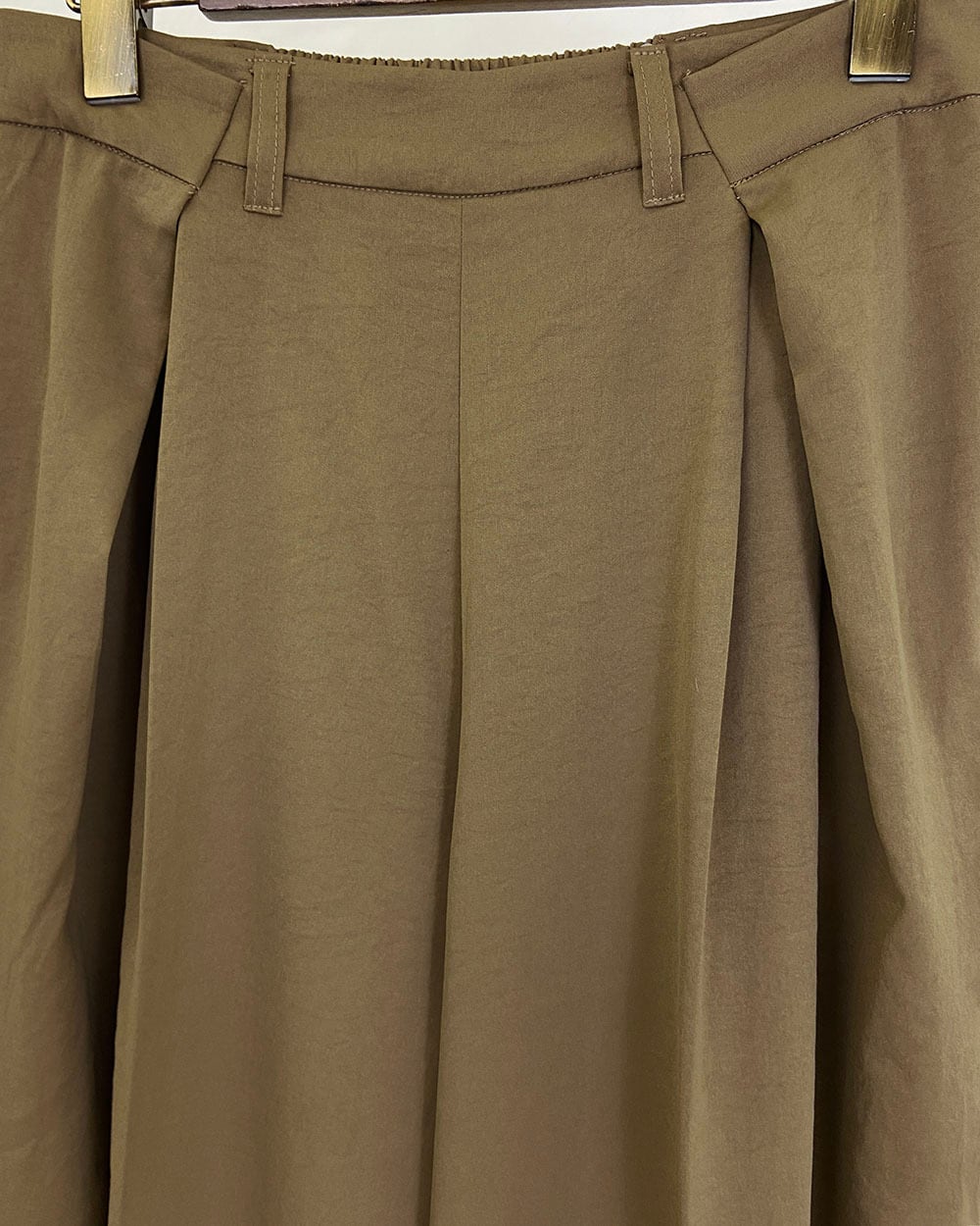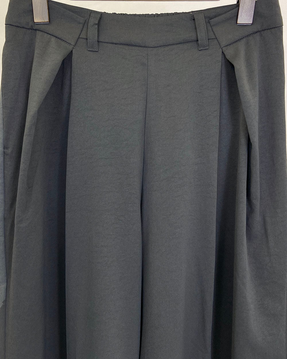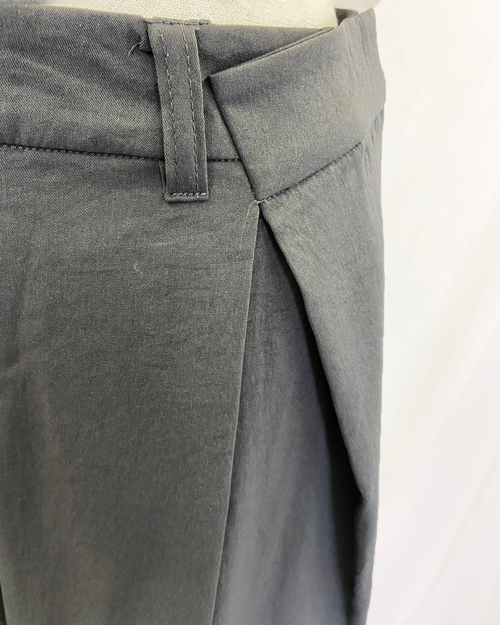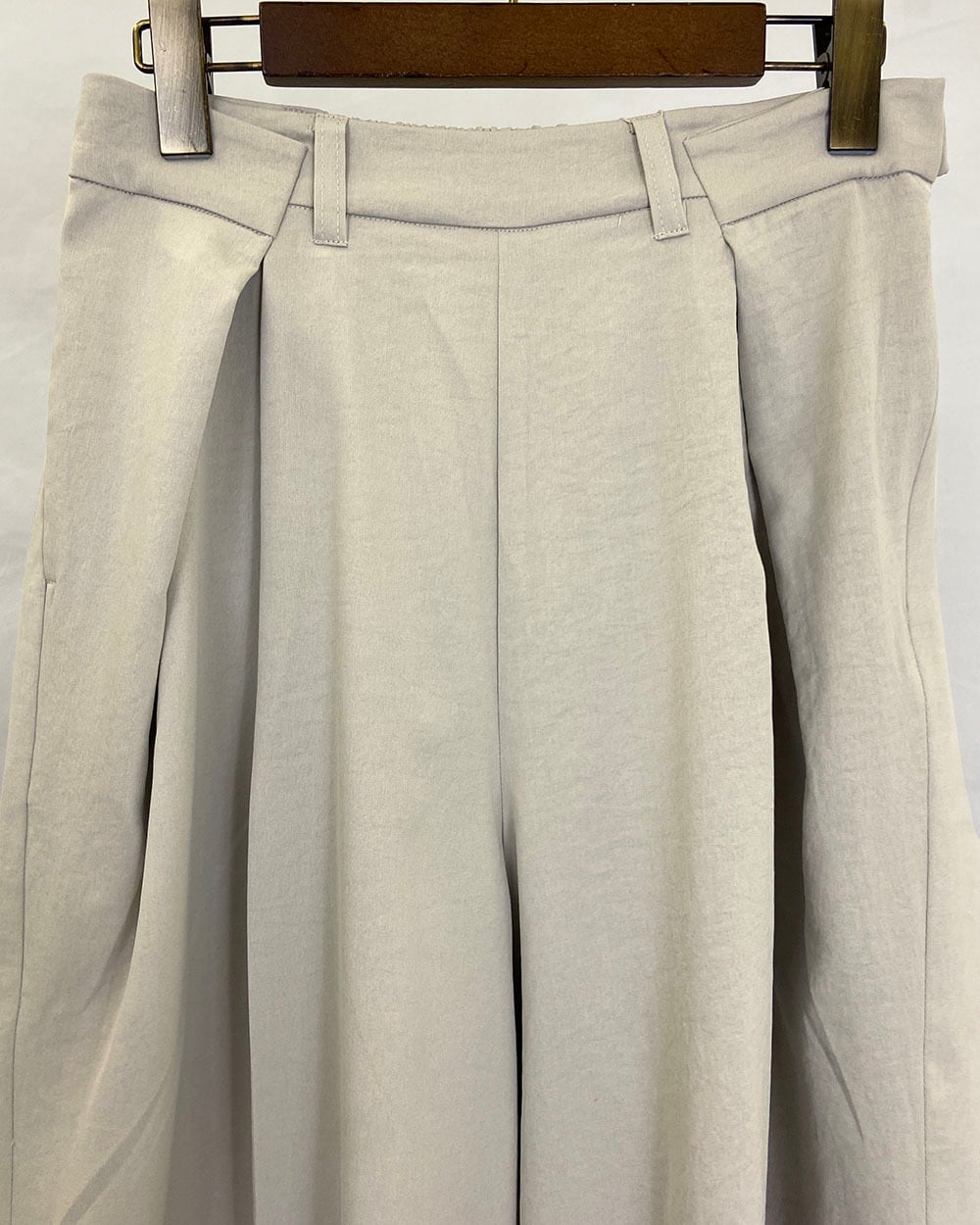 サイドに入ったタックと、段違いになったウエストベルトのディティールがモードな印象を演出します。センタープレスが脚のラインをすっきりと見せ、上品さと抜け感を両立。シンプルなTシャツを合わせて、抜け感のある大人カジュアルに。シャツやブラウスをインすれば、オフィスにも対応できるきれいめスタイルに。ショート丈トップスやジャケットを合わせて、ウエストデザインを引き立てたコーデもおすすめ。