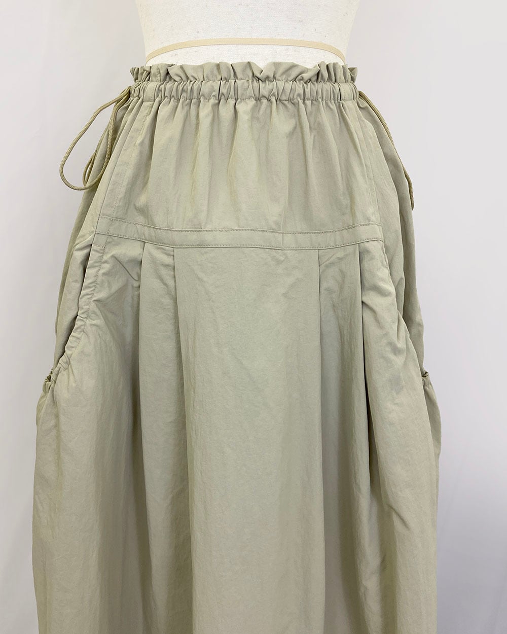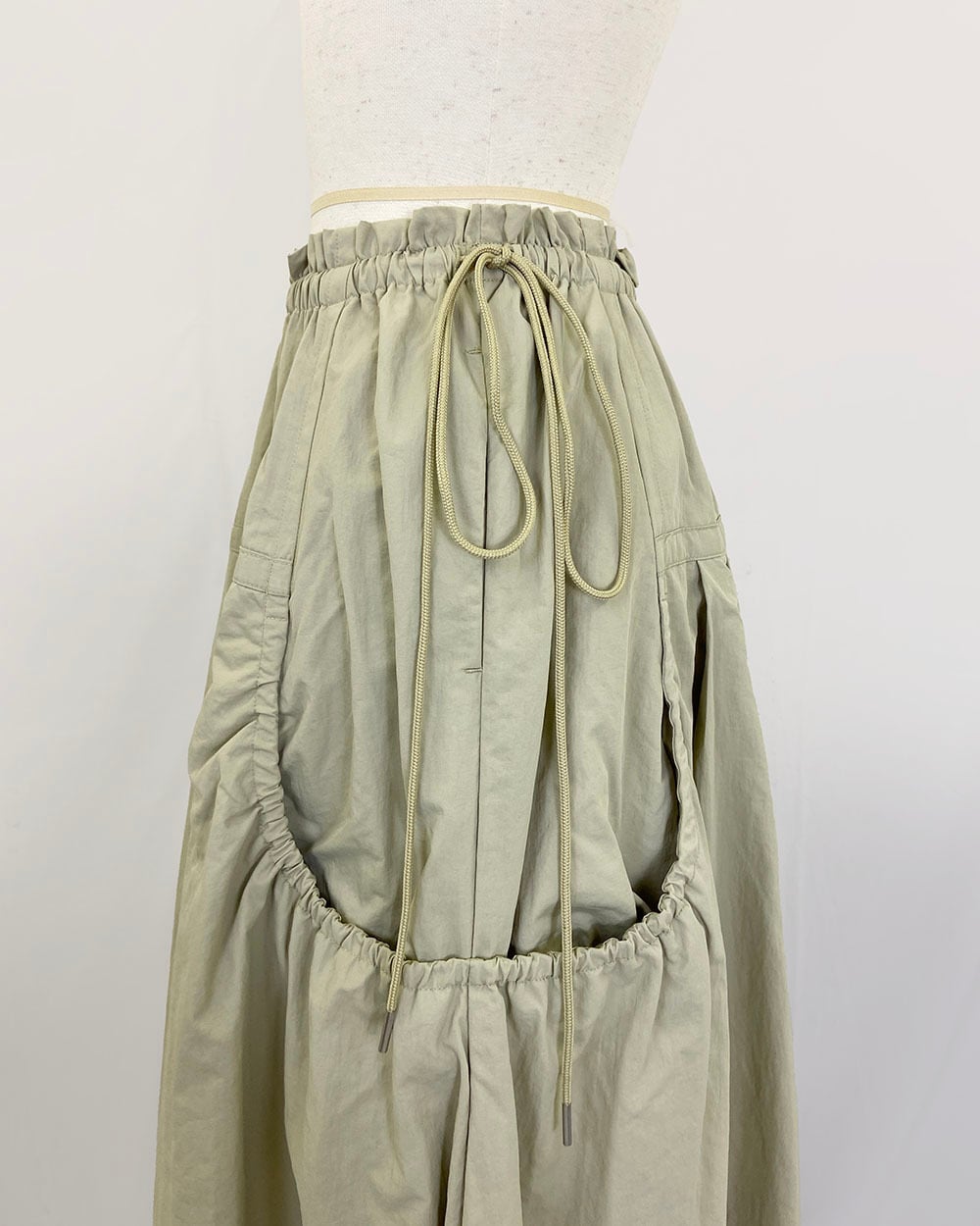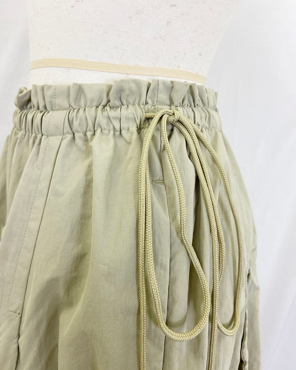 ウエストはゴム仕様で、長めのドロスト紐がスタイリングのアクセントに。