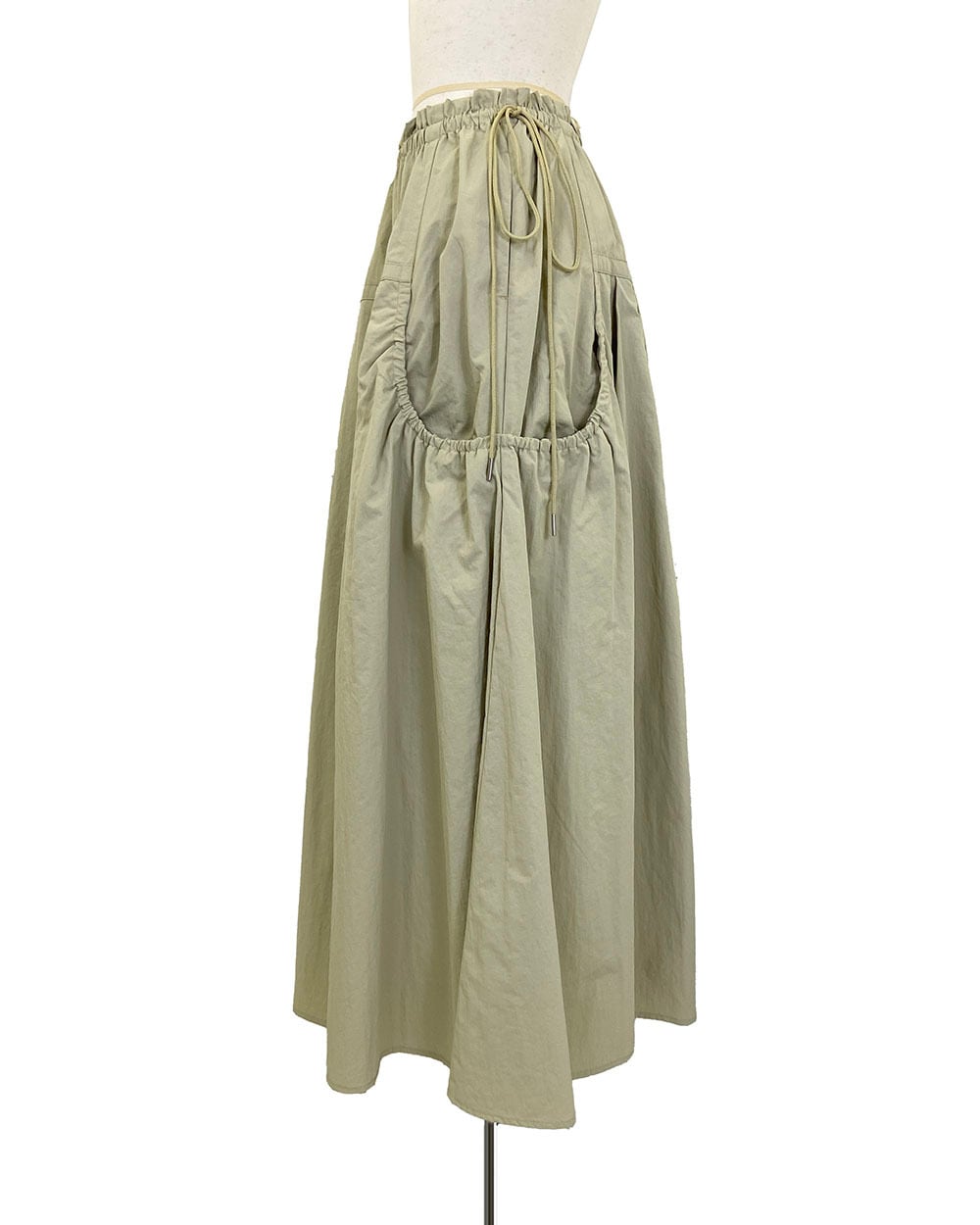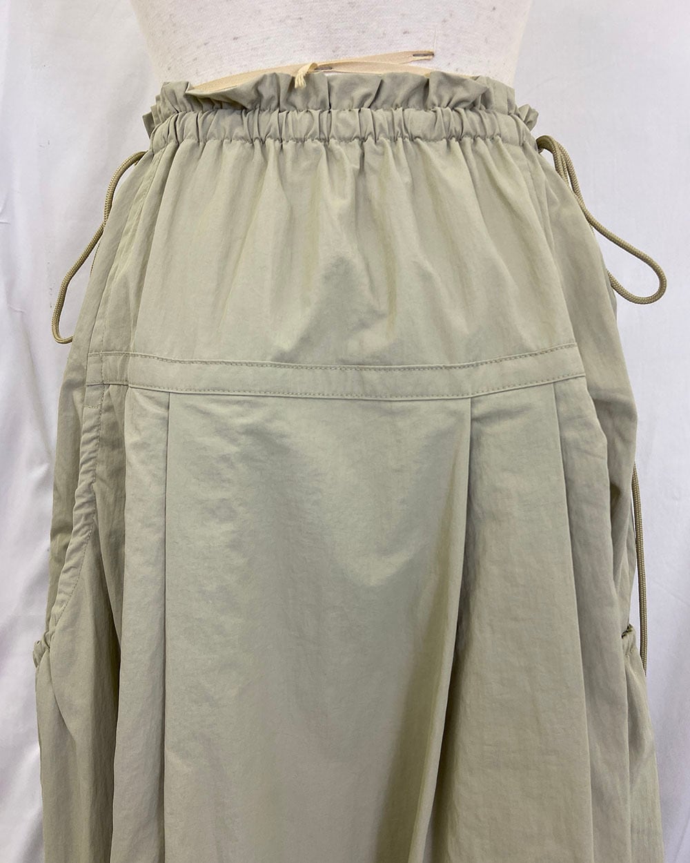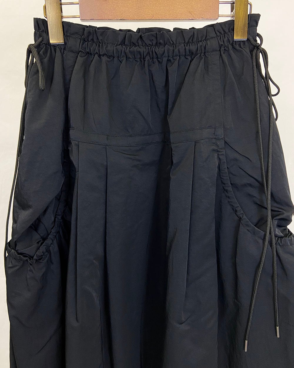 ウエストはゴム仕様で、長めのドロスト紐がスタイリングのアクセントに。