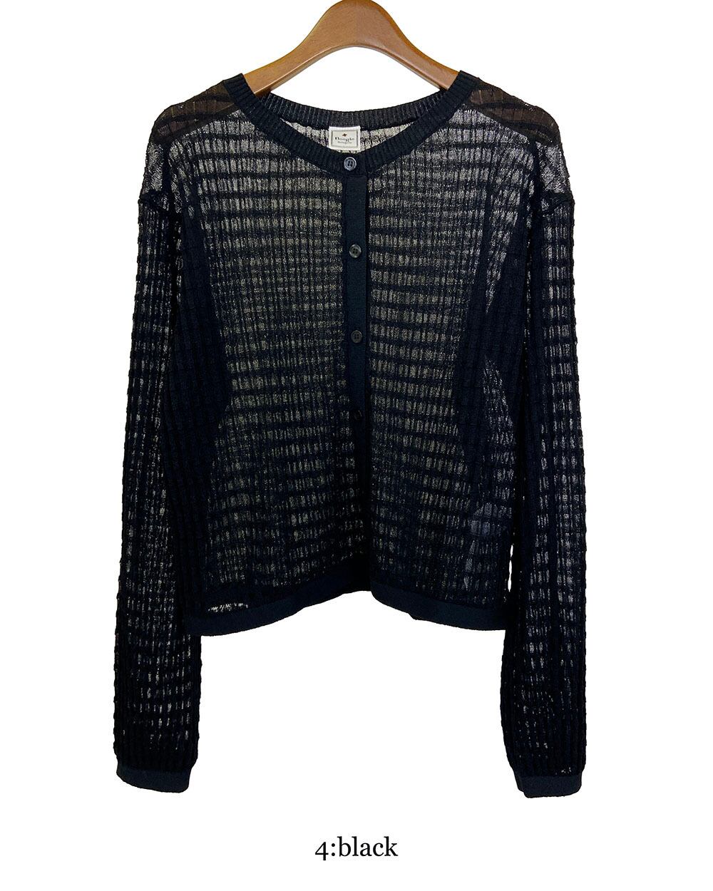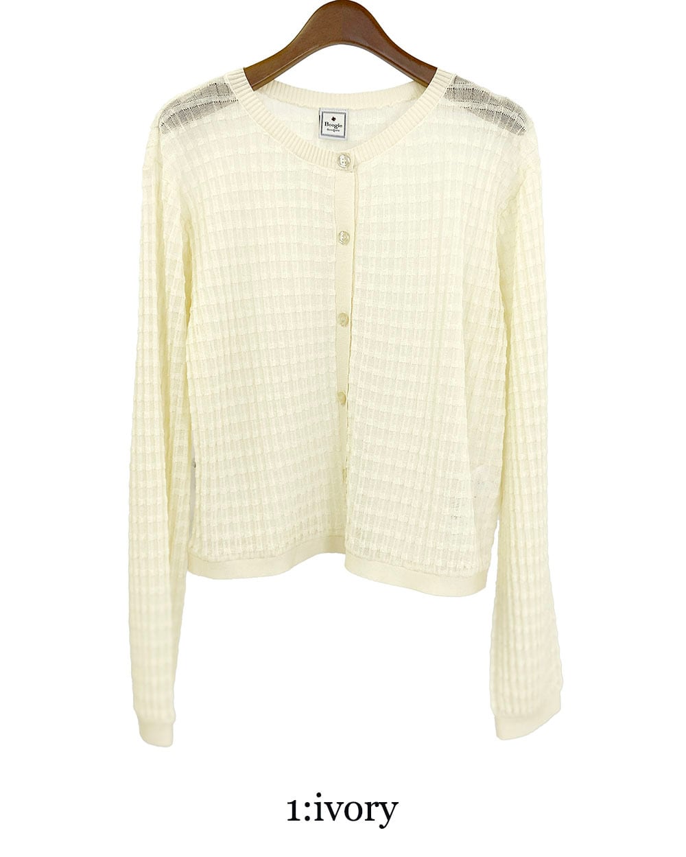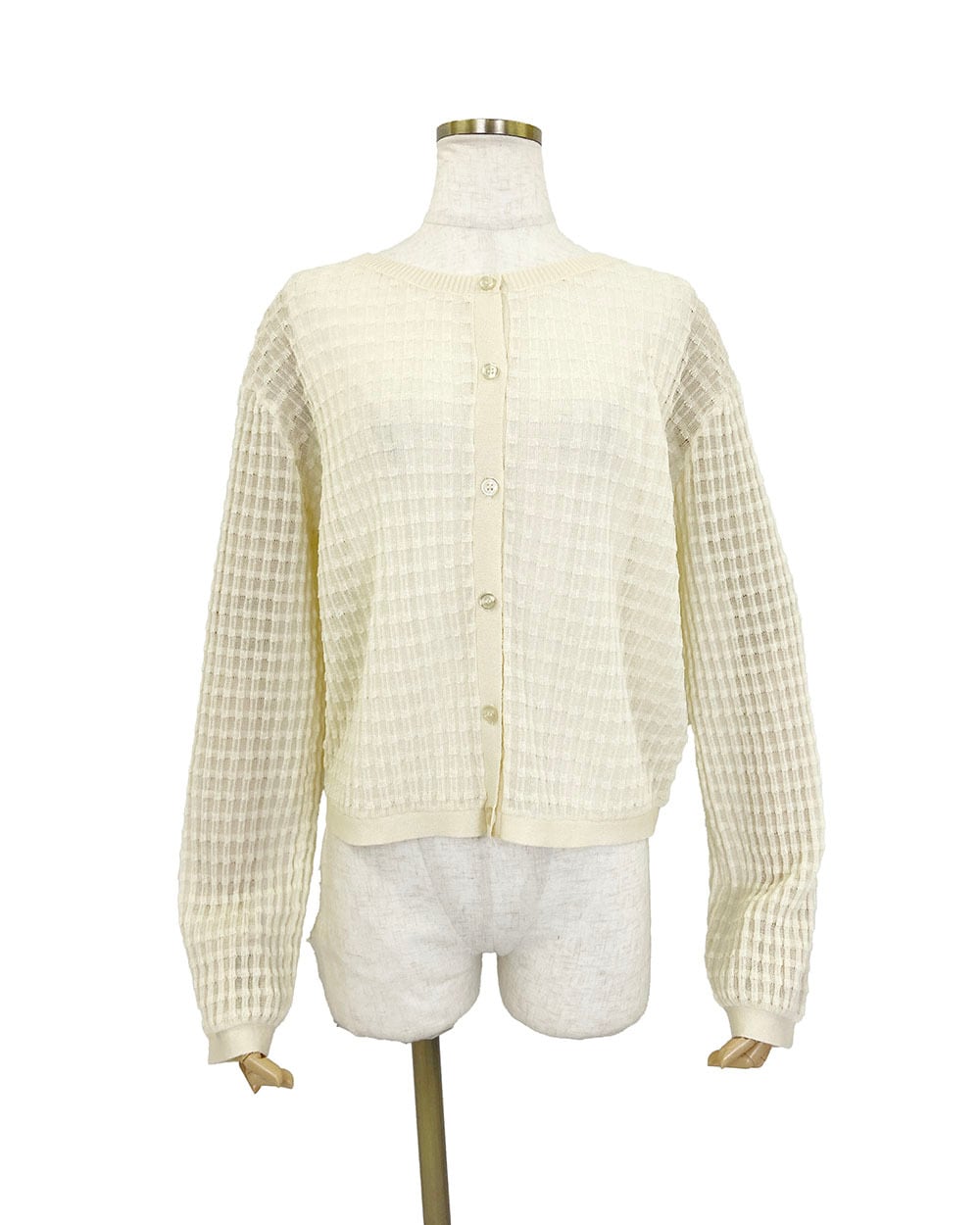 12Gの細やかな編み地で仕上げた、透け感のあるギンガムチェックのシアークルーネックカーディガン。