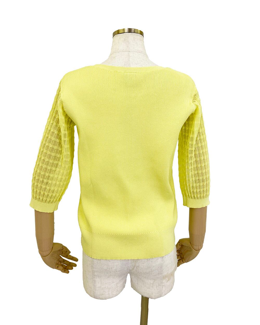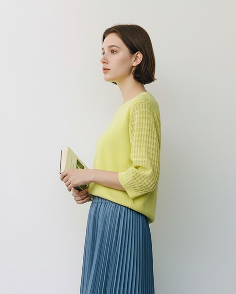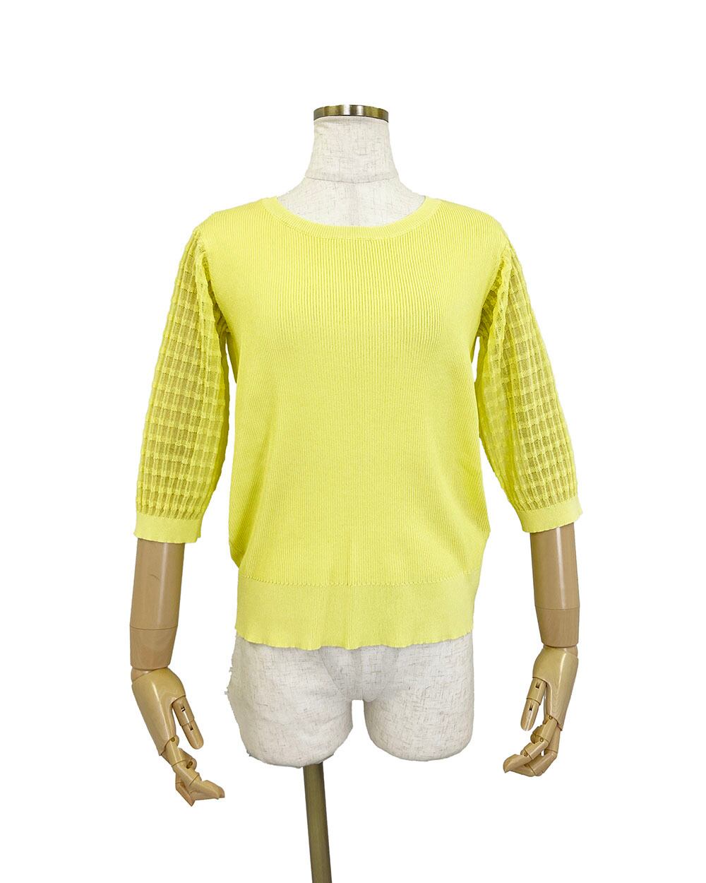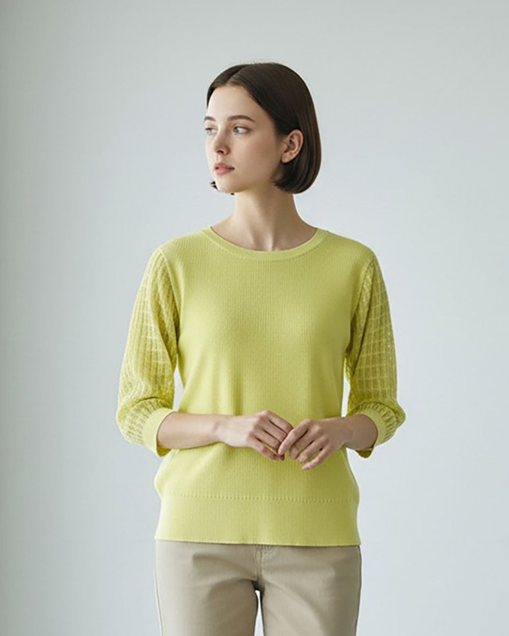 身頃はリブ編みで程よくフィットし、袖は透け感のあるギンガムチェックに切り替えたデザインがポイント。