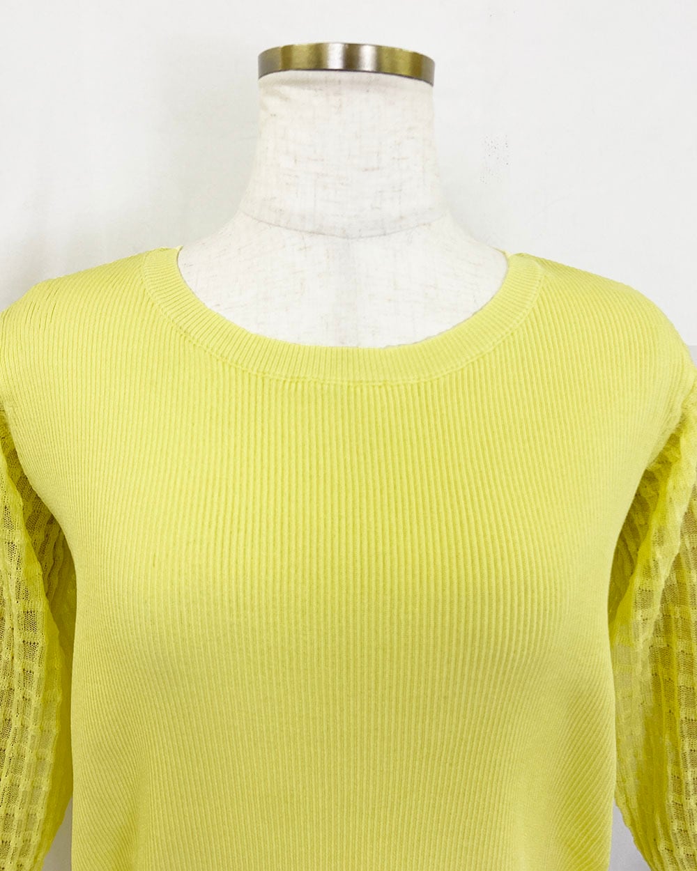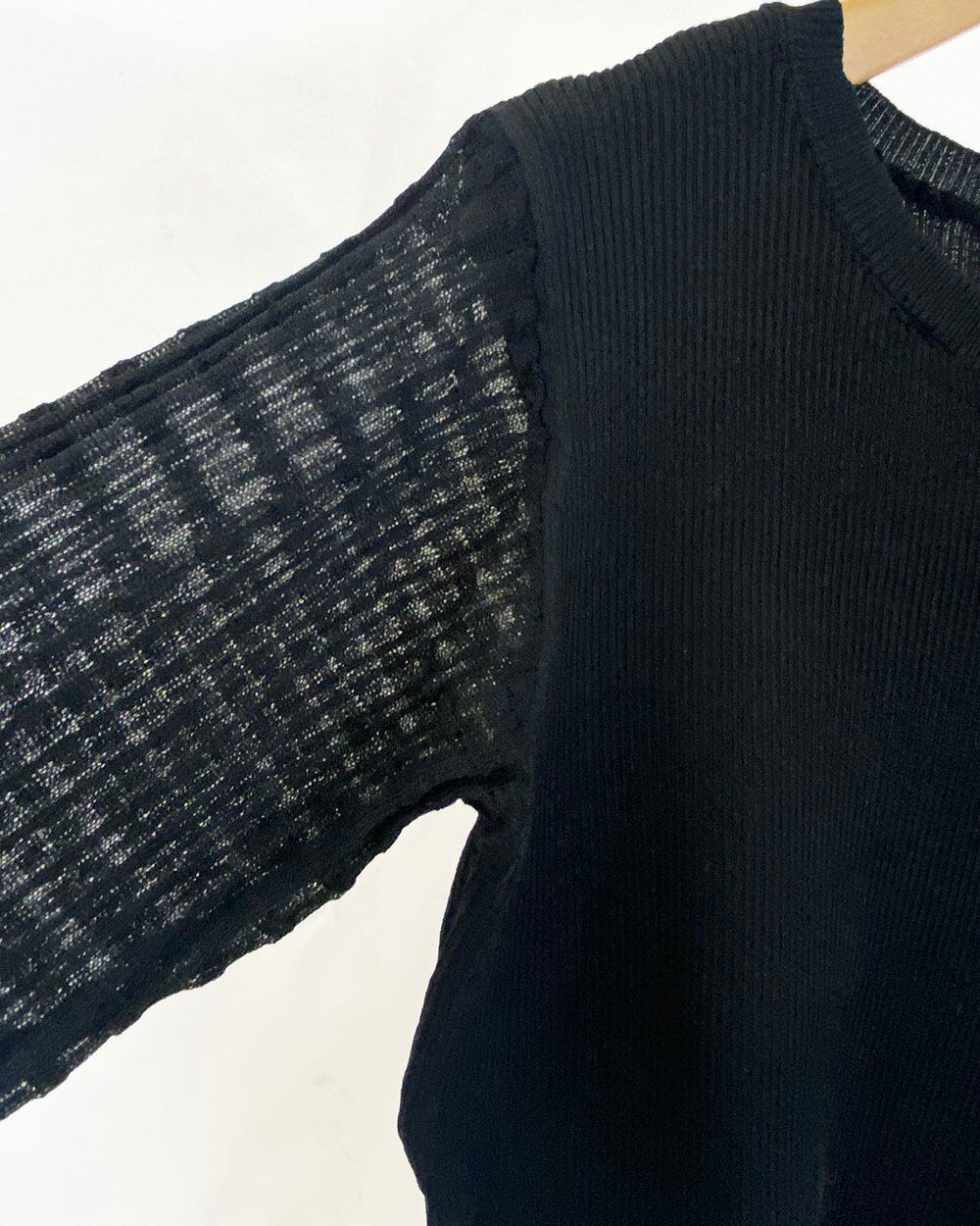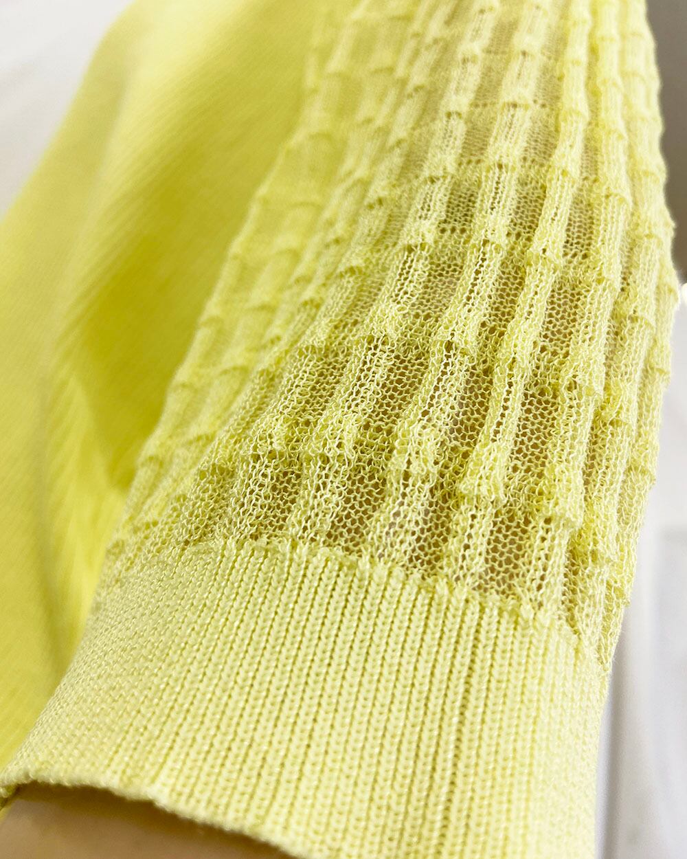 身頃はリブ編みで程よくフィットし、袖は透け感のあるギンガムチェックに切り替えたデザインがポイント。