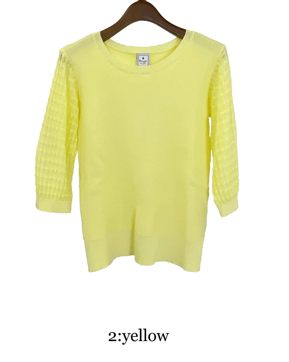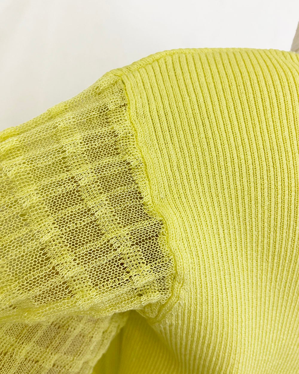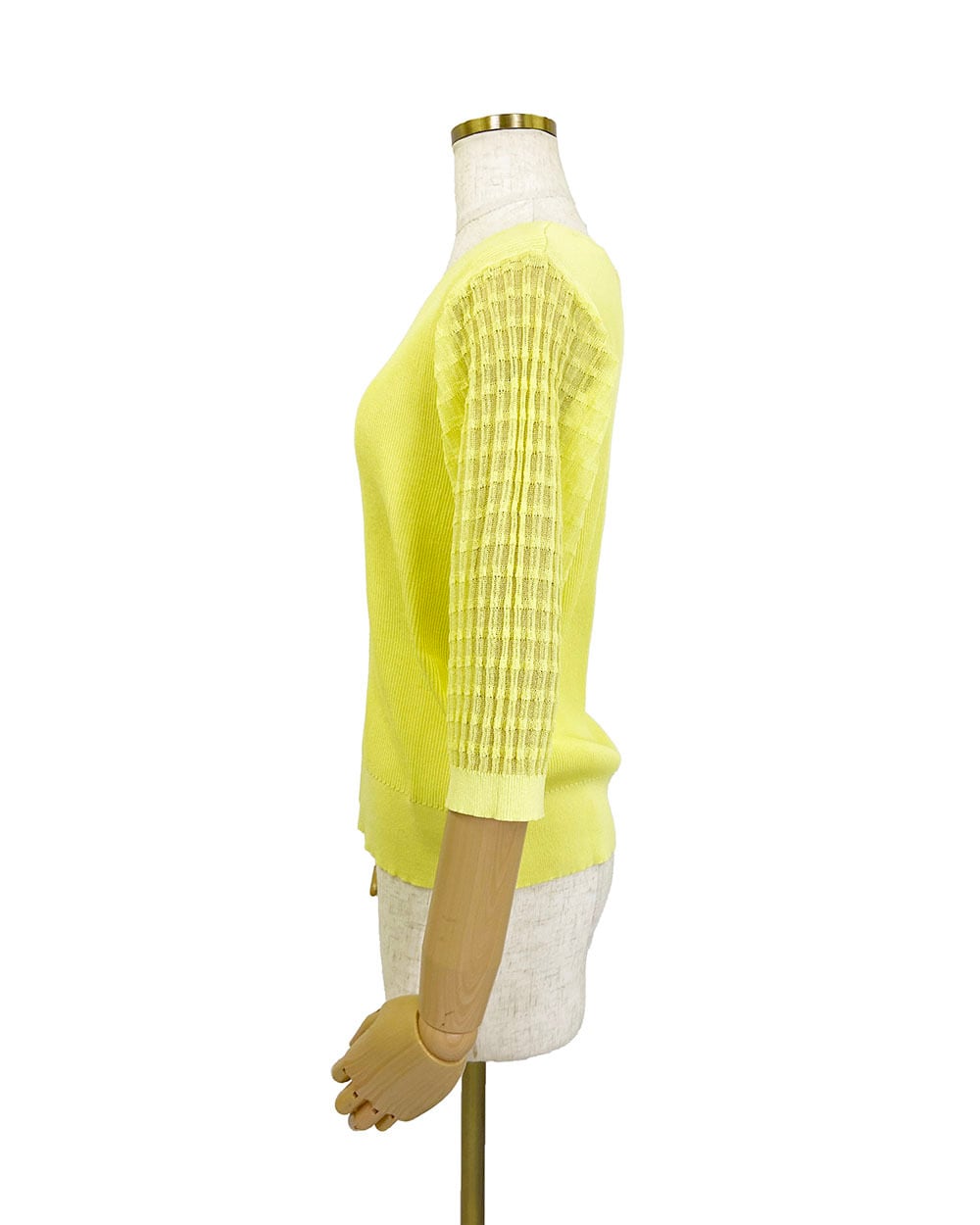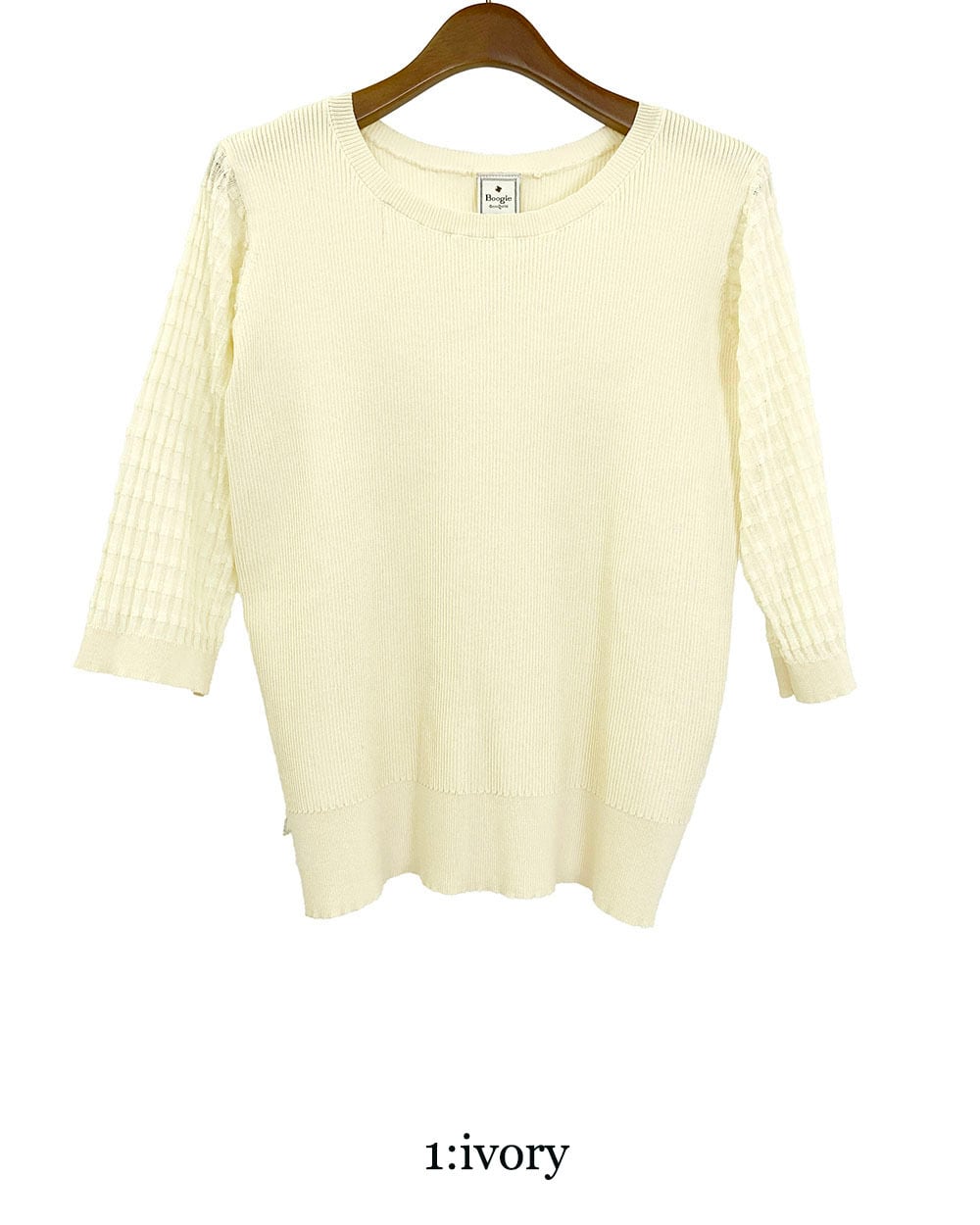 身頃はリブ編みで程よくフィットし、袖は透け感のあるギンガムチェックに切り替えたデザインがポイント。