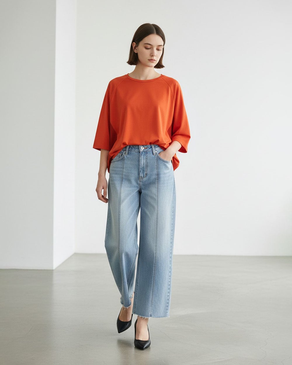 ・裾を伸ばしてストレートに着こなし、ワイドパンツでリラックス感をプラス。