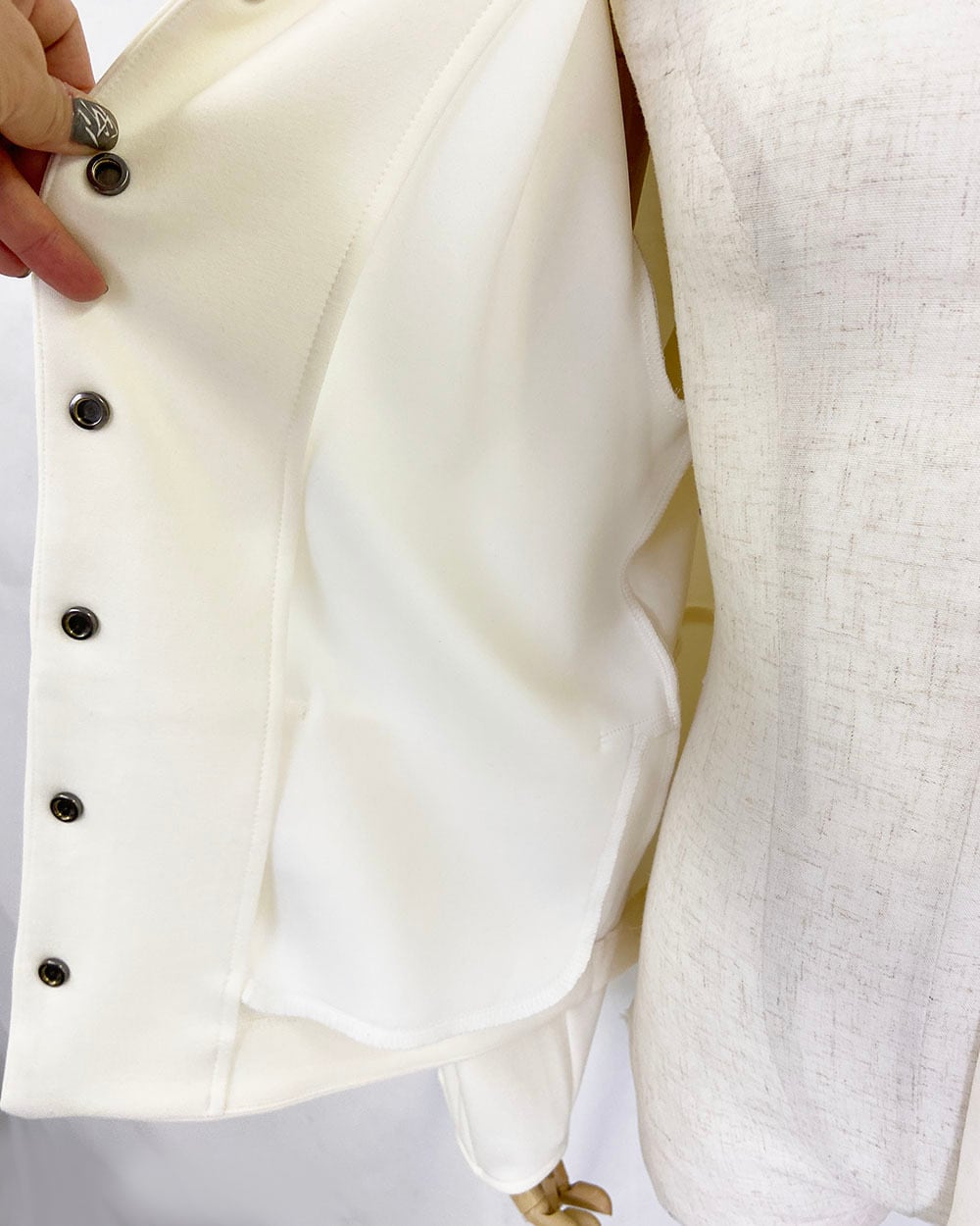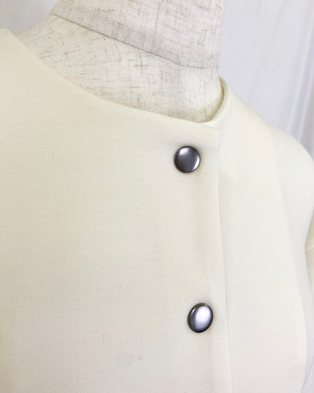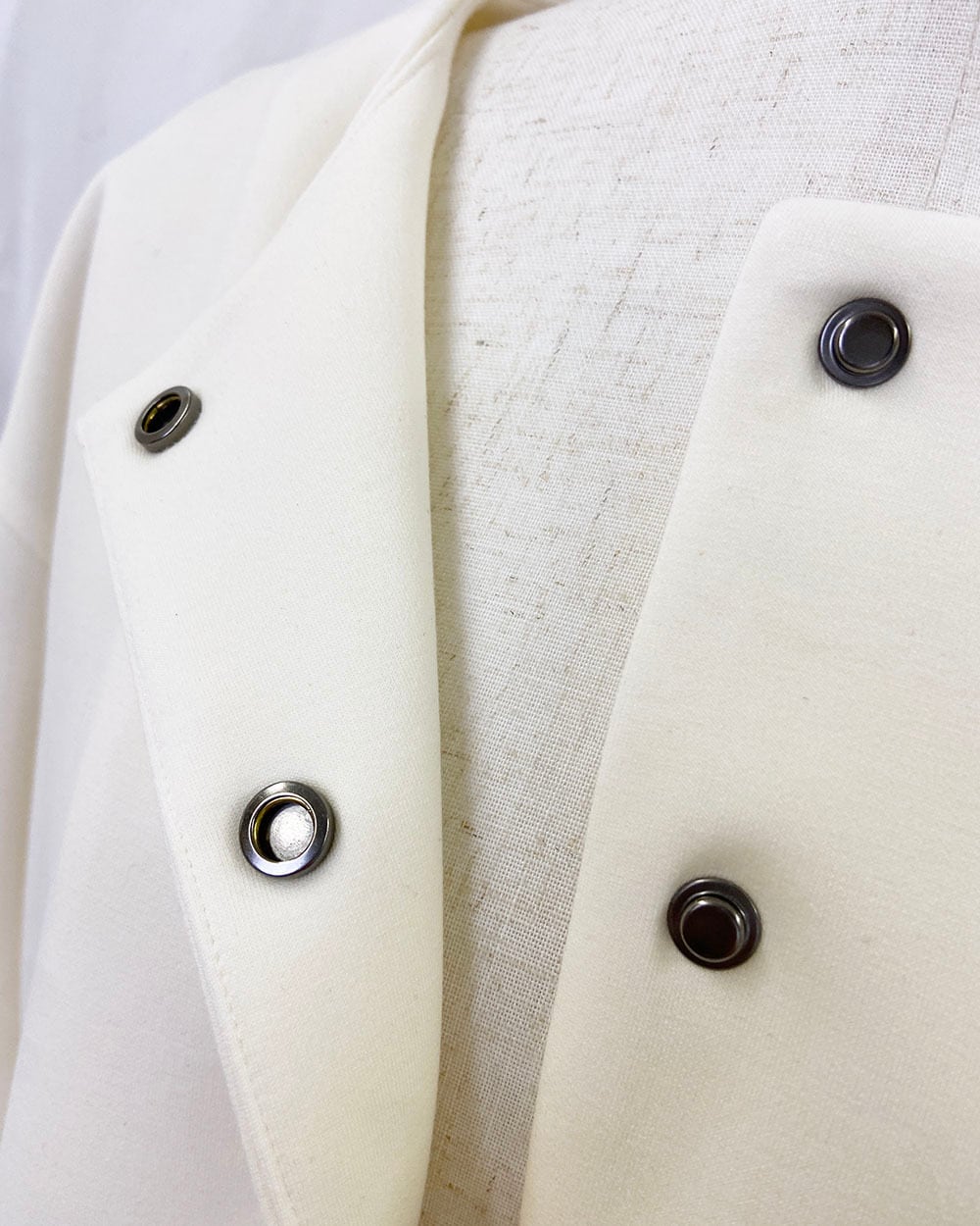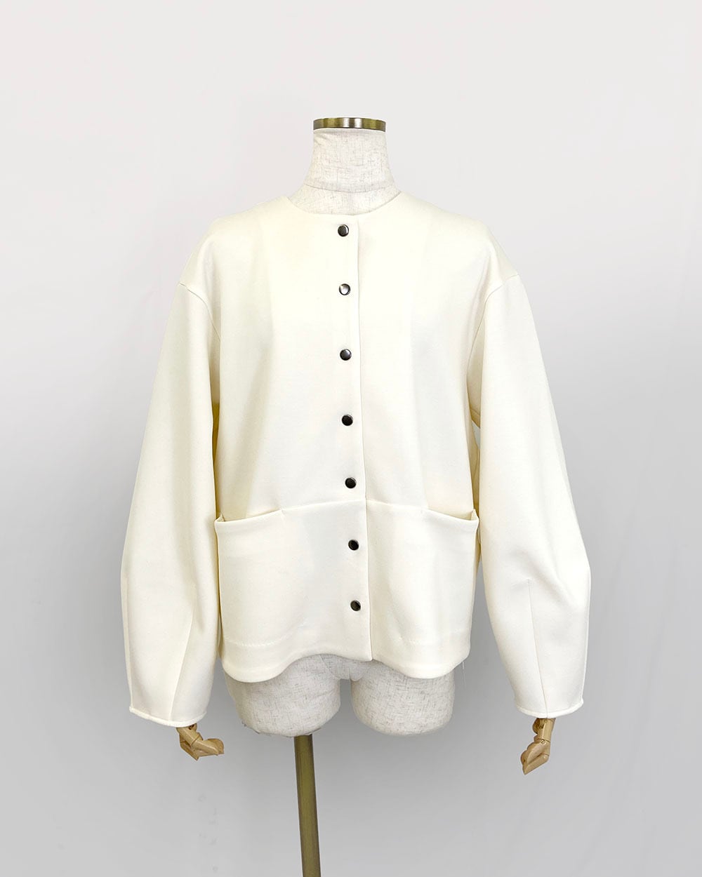 ストレッチ性のあるダンボール素材を使用した、ドットボタン仕様のカーディガンジャケット。
